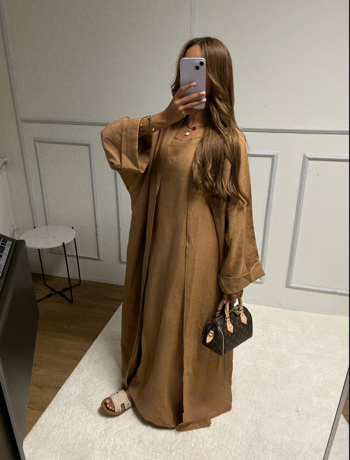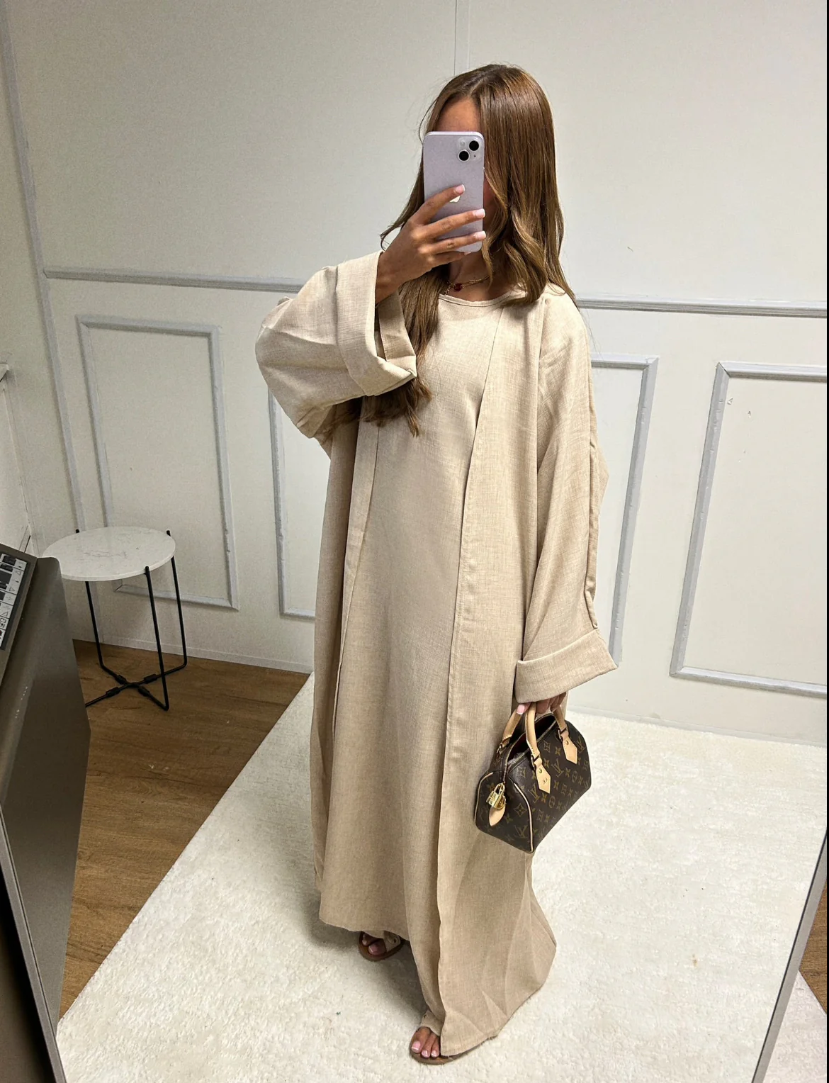 Abaya en lin sans manche + Kimono en lin Taille : Taille unique * (peut convenir à une taille 34 jusqu’à une taille 42) Mannequin : mesure 1m60 COMPOSITION: 100% POLYESTER
