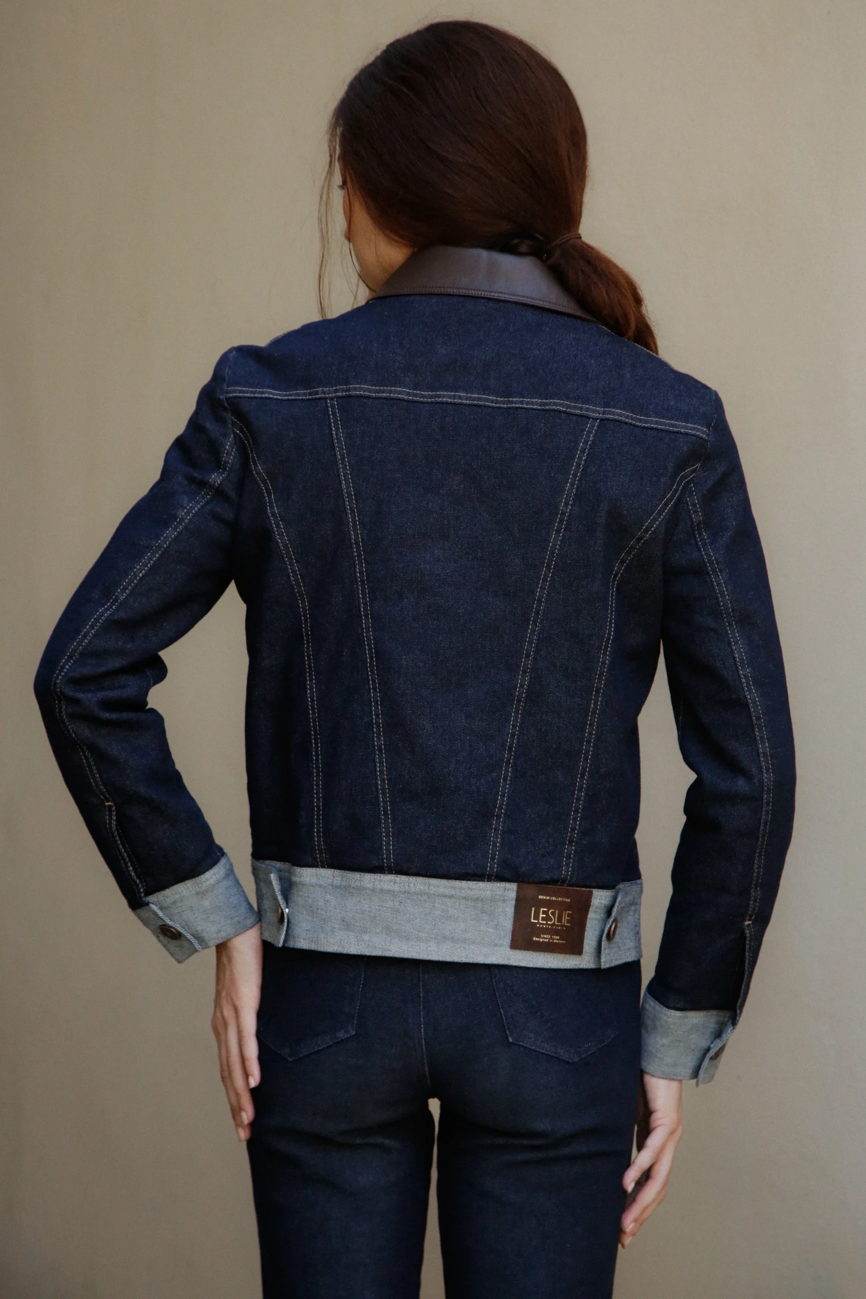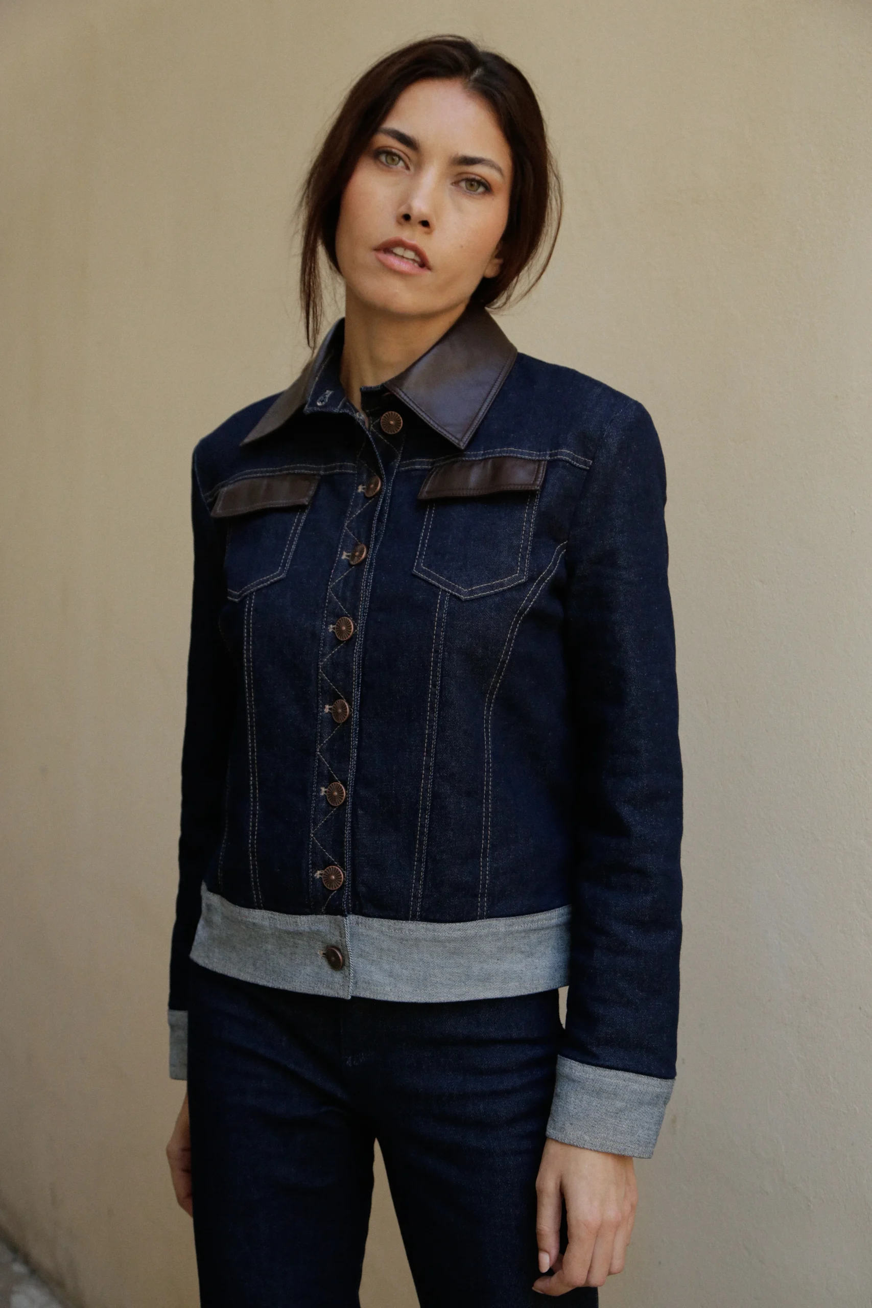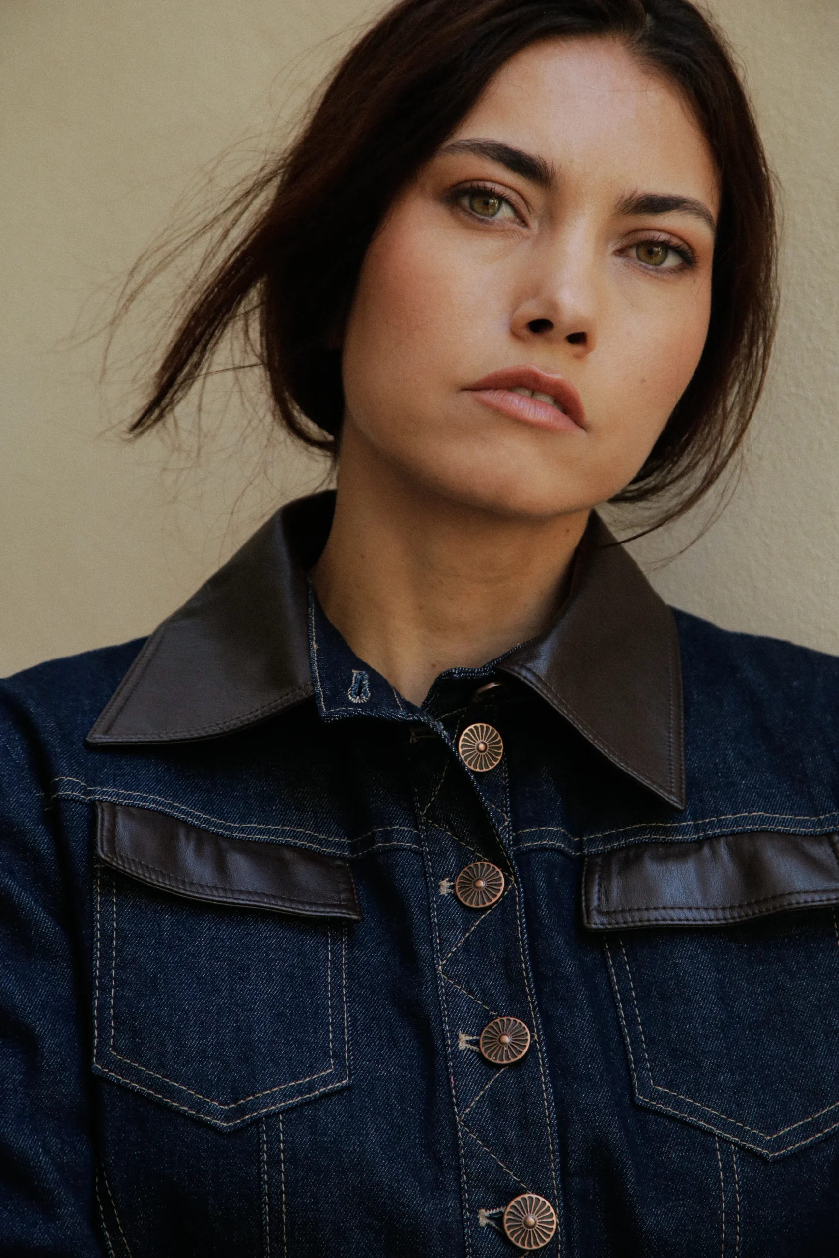 Le blouson Agathe incarne l’équilibre parfait entre décontraction et raffinement. En denim brut rehaussé de finitions en cuir vegan Moka, il capte l’esprit citadin avec une touche très couture.