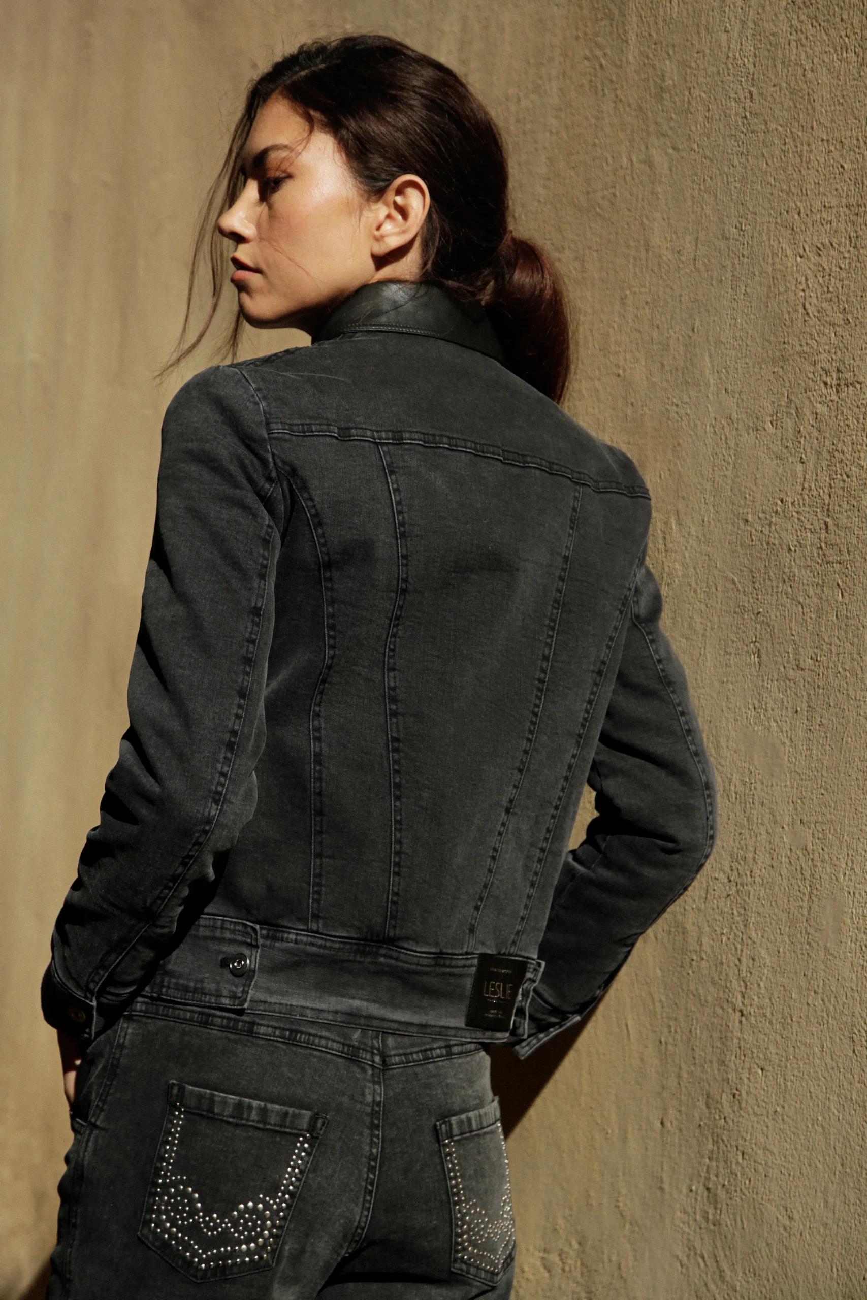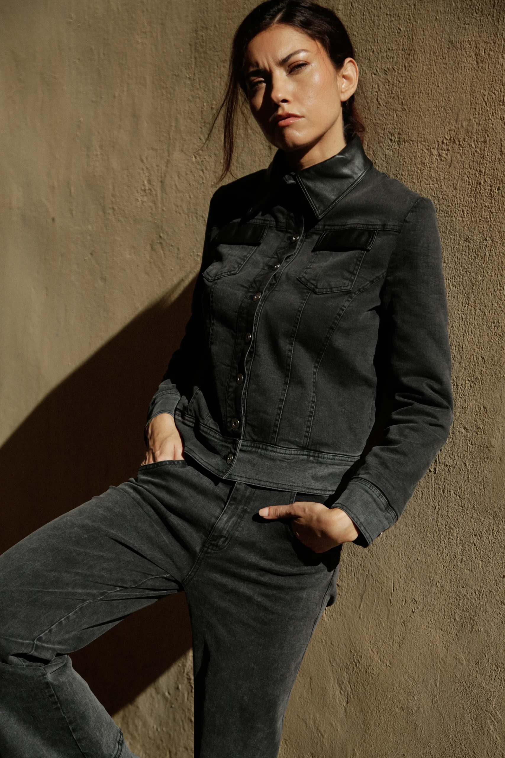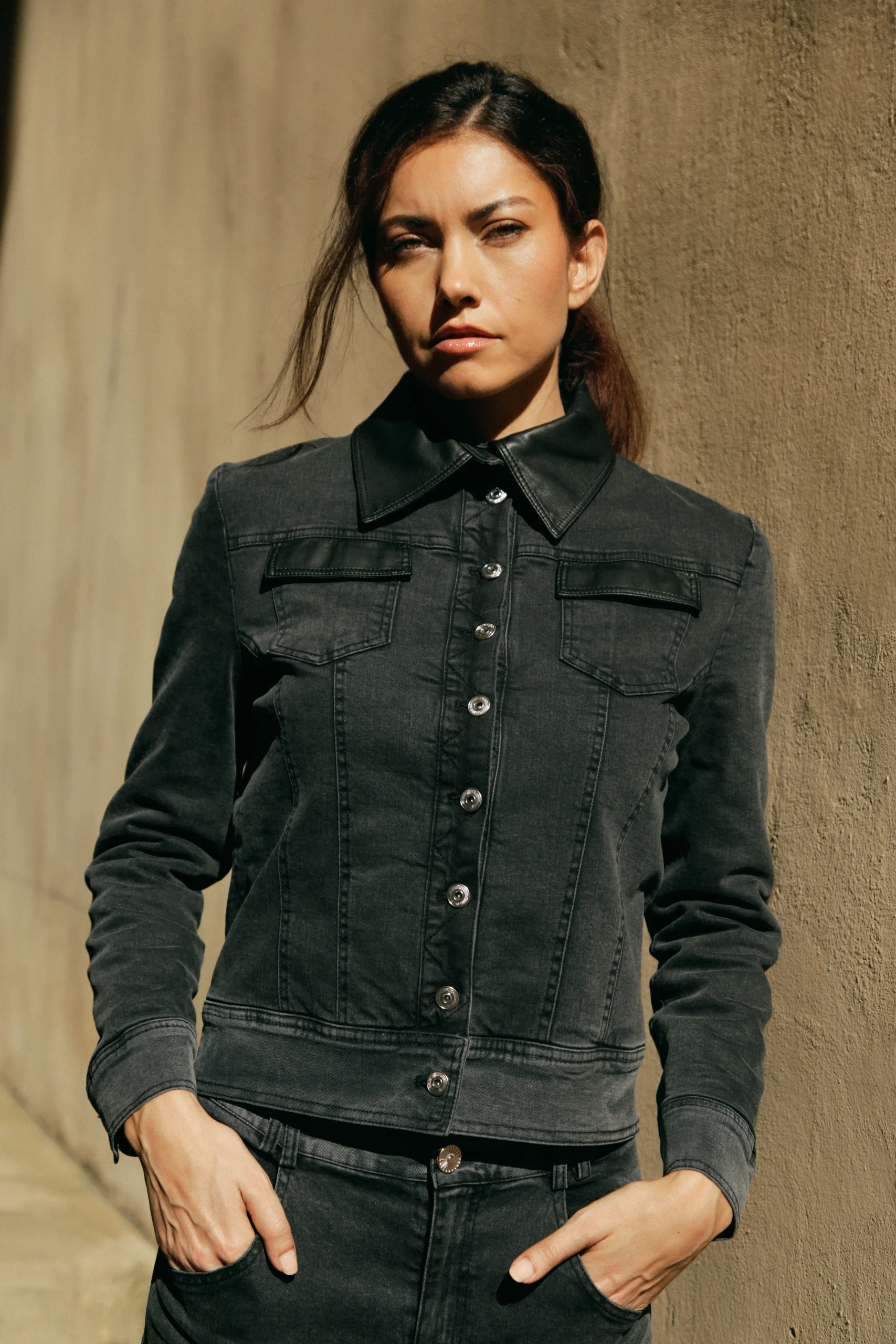 Le blouson Agathe incarne l’équilibre parfait entre décontraction et raffinement. En denim gris rehaussé de finitions en cuir vegan Noir, il capte l’esprit citadin avec une touche très couture.