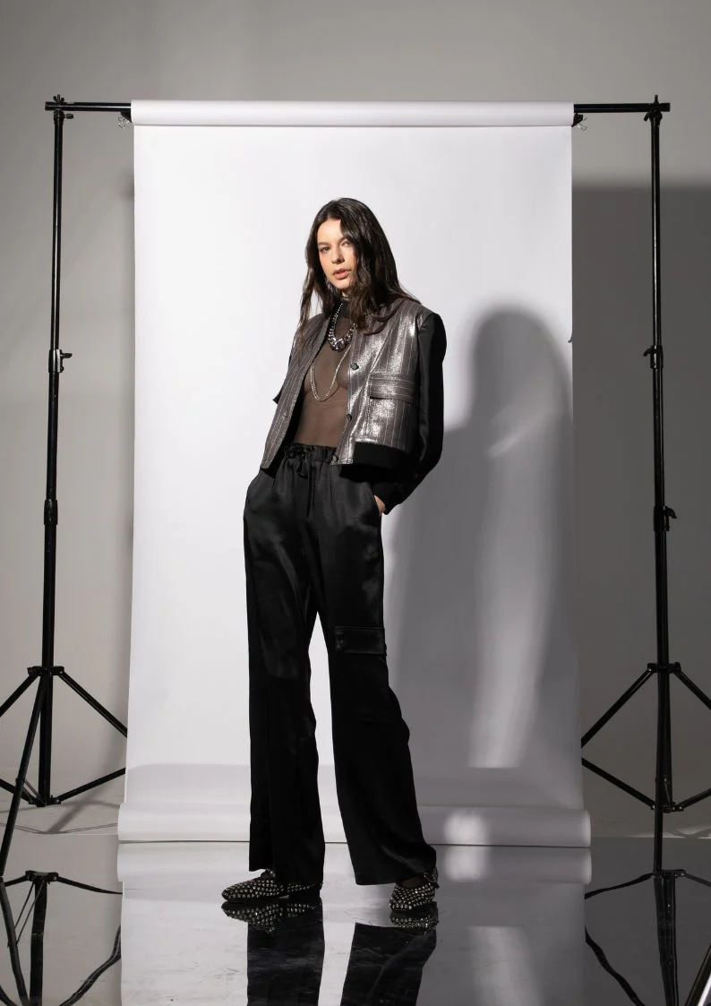 Blouson façon bombers revisité ici en version chic et féminine. Tissu fluide et lumineux, idéal pour la rentrée et les superpositions automnales Col , poignets et bas du blouson en côte de maille noire. Manches réalisé en satin noir froissé. Poches à rabats discrètes. Rayures verticales qui élancent la silhouette À la croisée du bureau […]