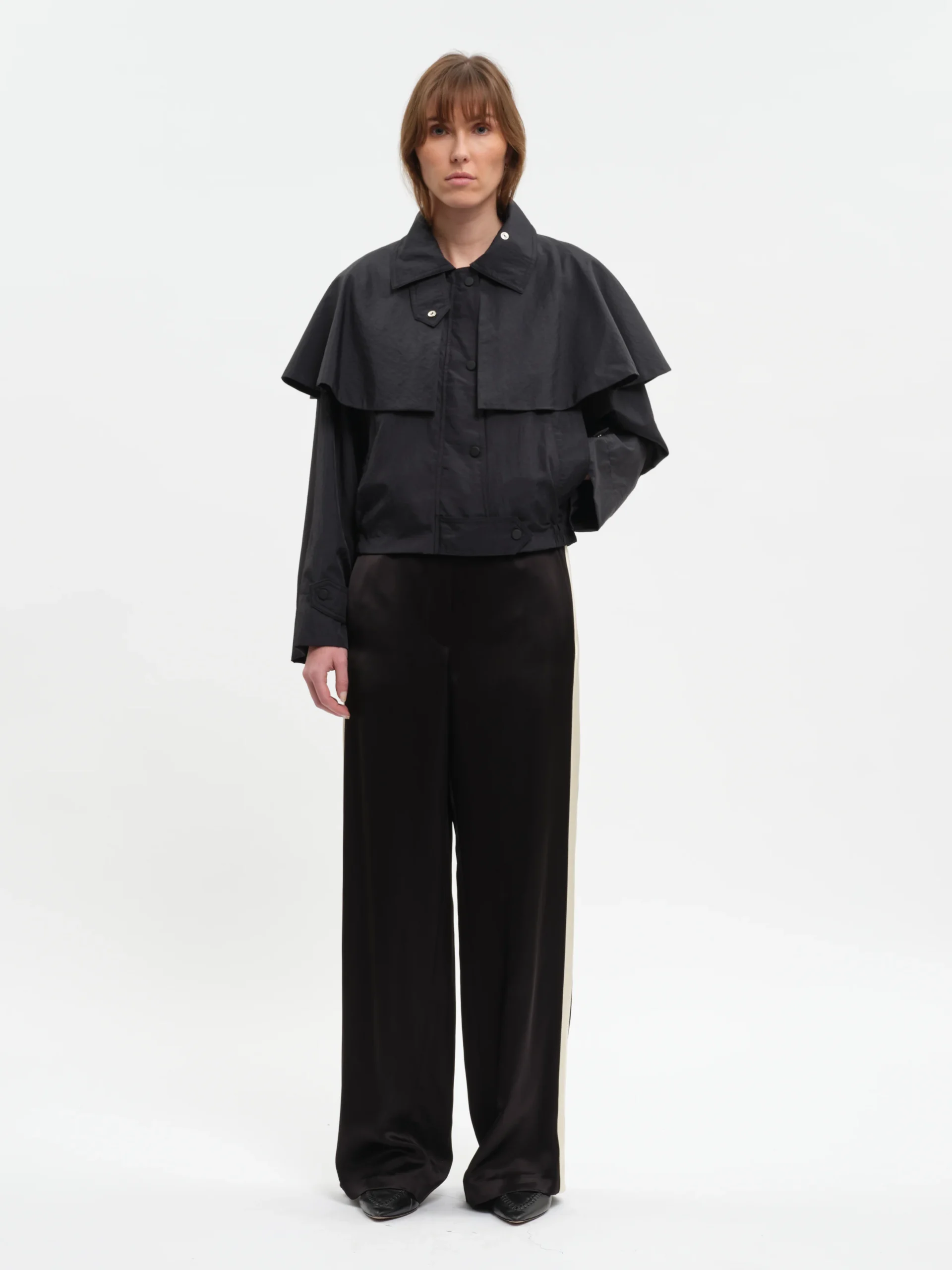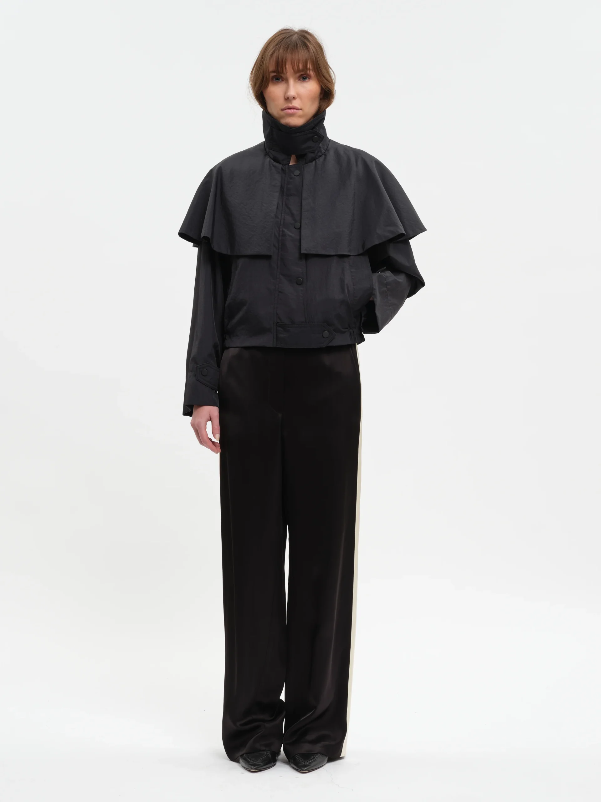 Blouson court à Bavolet Poches passepoilées Pattes de boutonnage à pressions Patte de serrage sur les poignets. 100% Polyamide Le mannequin mesure 1m75 et porte une taille 36