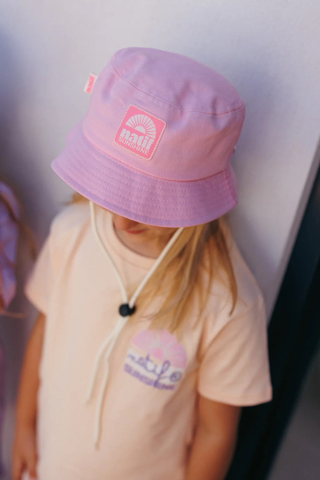 Natif Sunshine Laisse la lumière briller avec notre design sunshine rétro ! Avec son soleil, la vibe Natif te suit partout en propageant des ondes positives et rayonnantes avec ce bob pour enfant. Bob lacet Design rétro sunshine 3 couleurs disponibles Lacet ajustable
