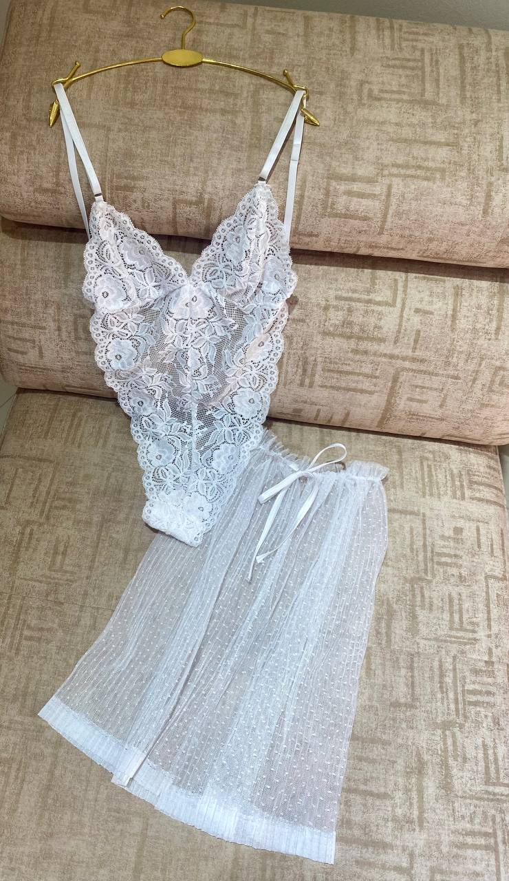 Body en dentelle + Jupe COULEURS : Blanc MATÉRIAU : Dentelle & Mousseline TAILLES DISPONIBLES : Standard du 36 au 42