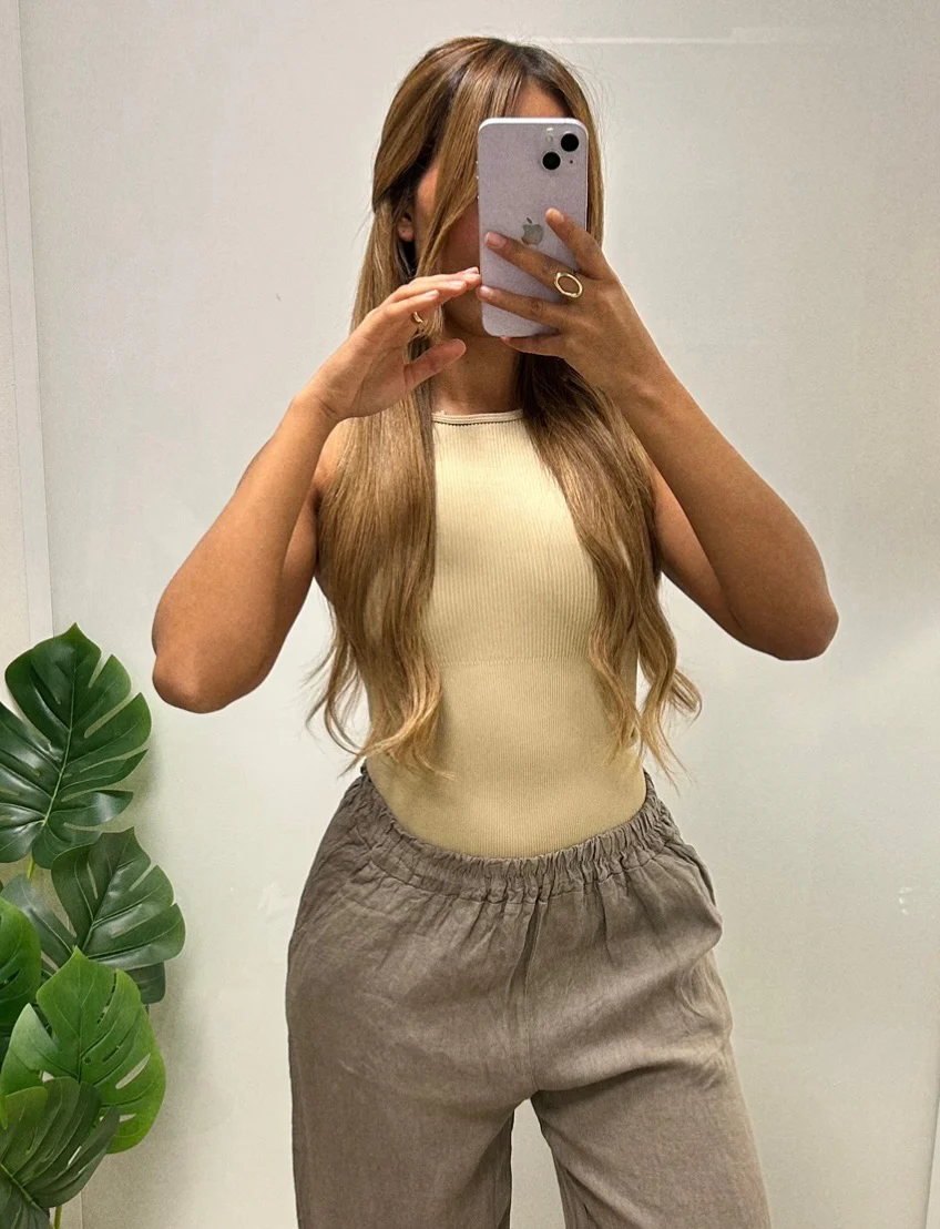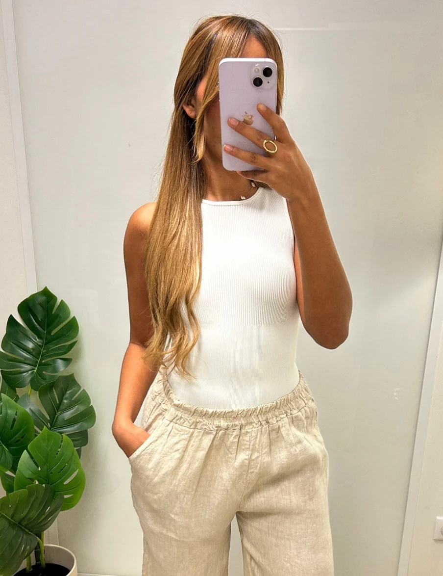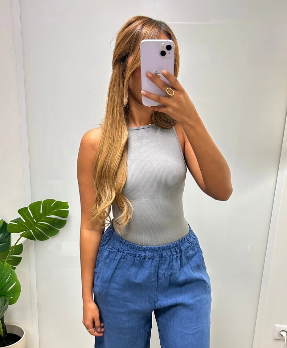 Body gainant noir côtelé sans manches, à la coupe ajustée et élégante.