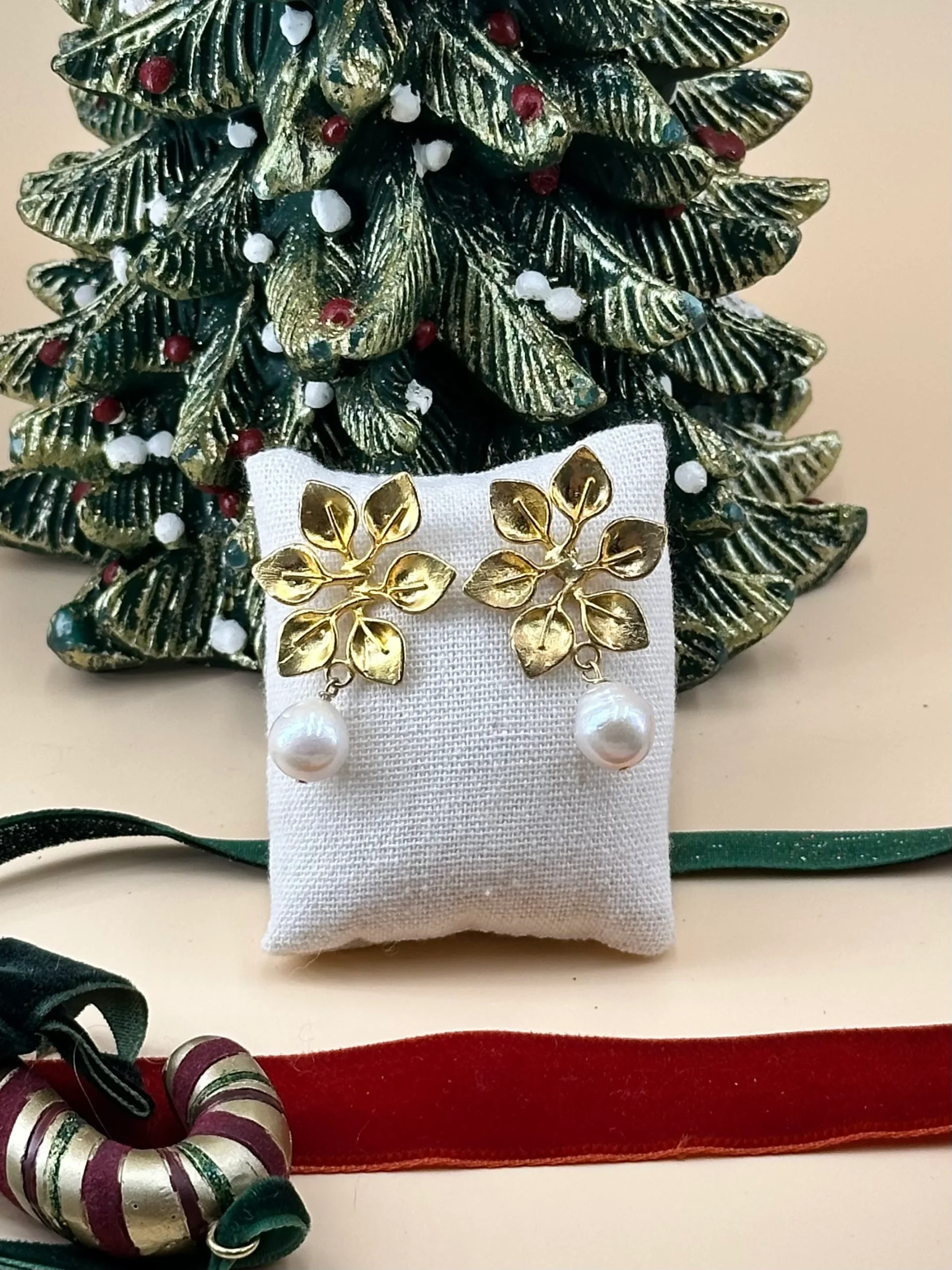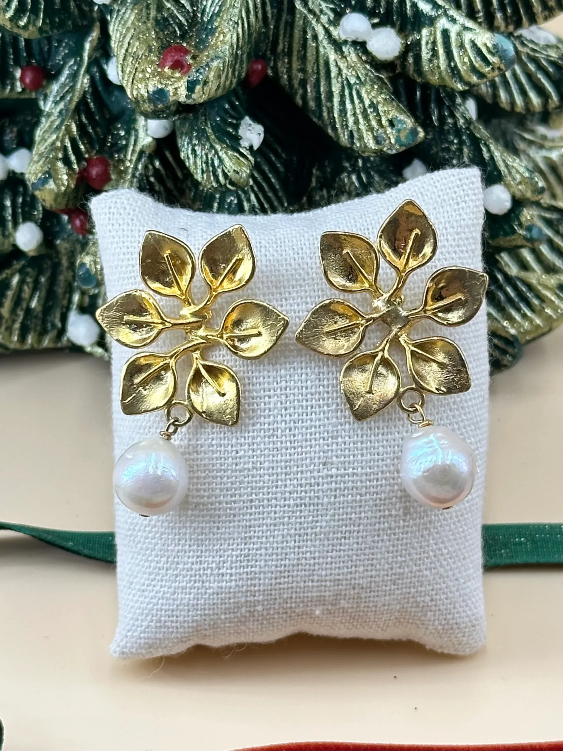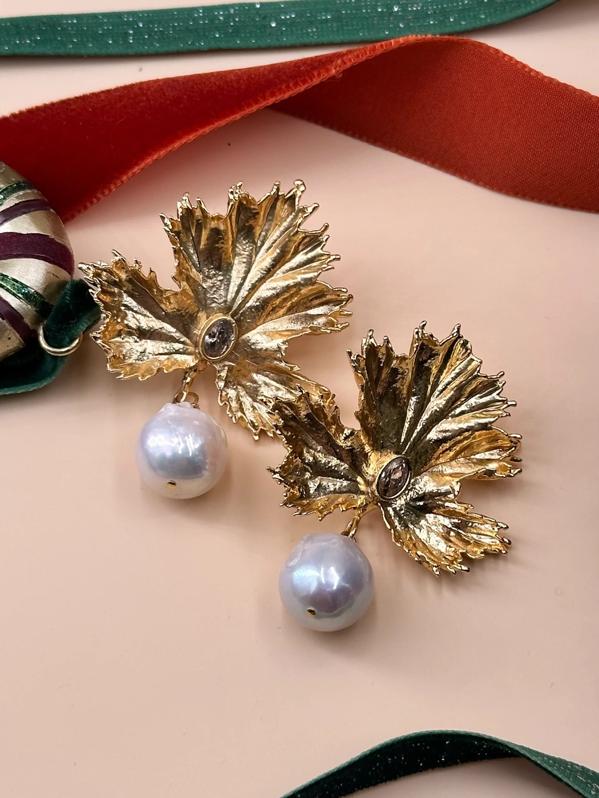 Ces boucles d’oreilles sont une ode au raffinement. Le feuillage doré, sculpté avec relief et mouvement, capte la lumière avec au centre, une pierre claire qui apporte une touche d’éclat discret, avant de laisser place à une perle d’eau douce naturellement féminine.