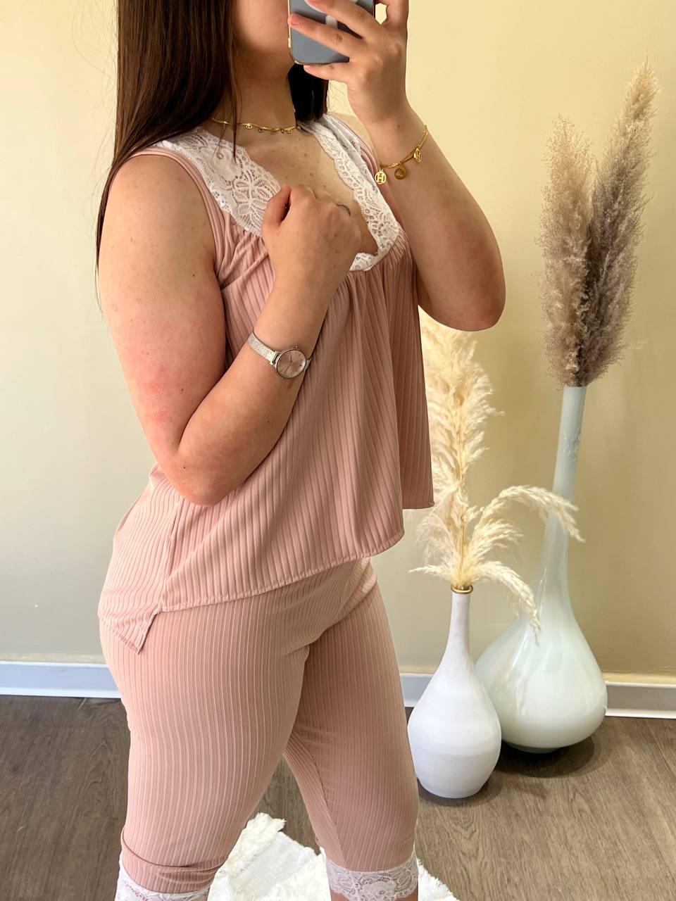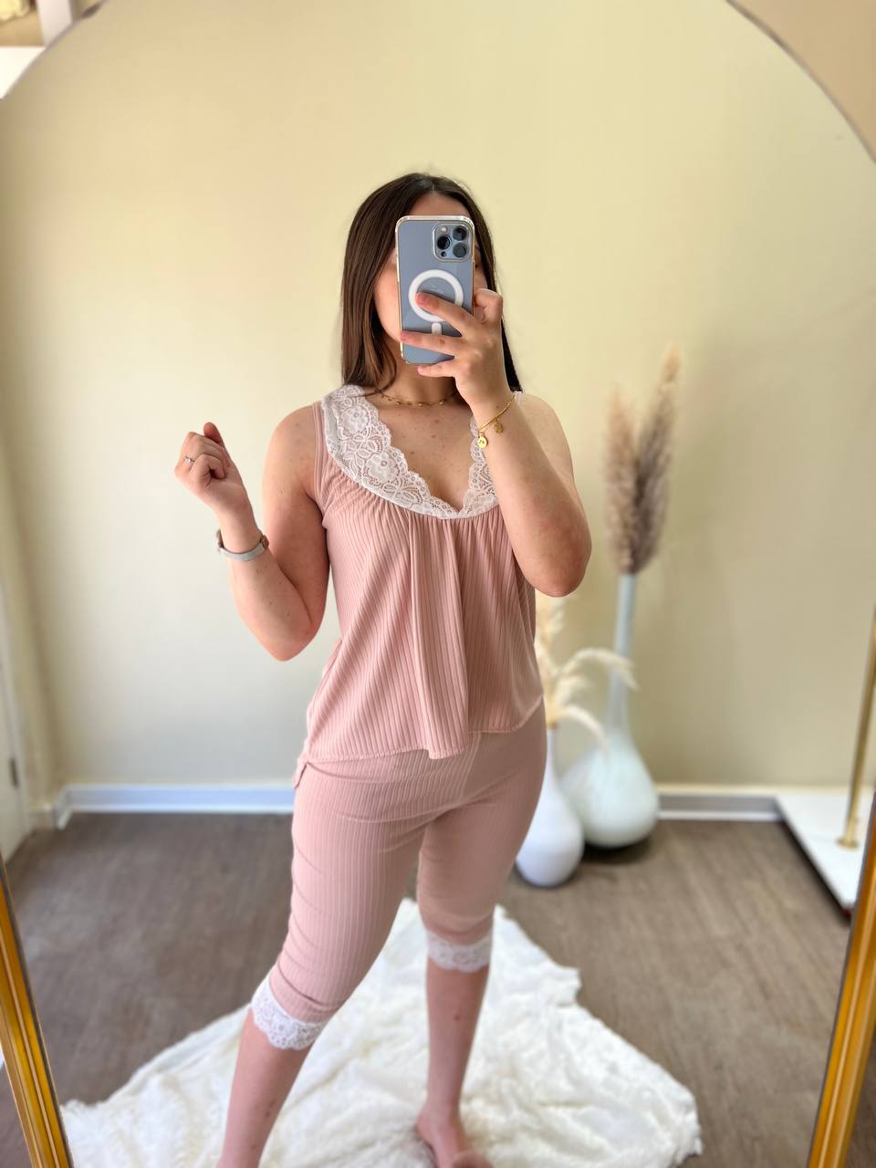 Ensemble 2 pièces – bustier sans manches et pantacourt, ornée de dentelle blanche. COULEURS : Rose / Noir MATÉRIAU : Coton Lycra TAILLES DISPONIBLES : T1(SM) 36-38, T2(LXL) 40-42, T3 (XXl) 44