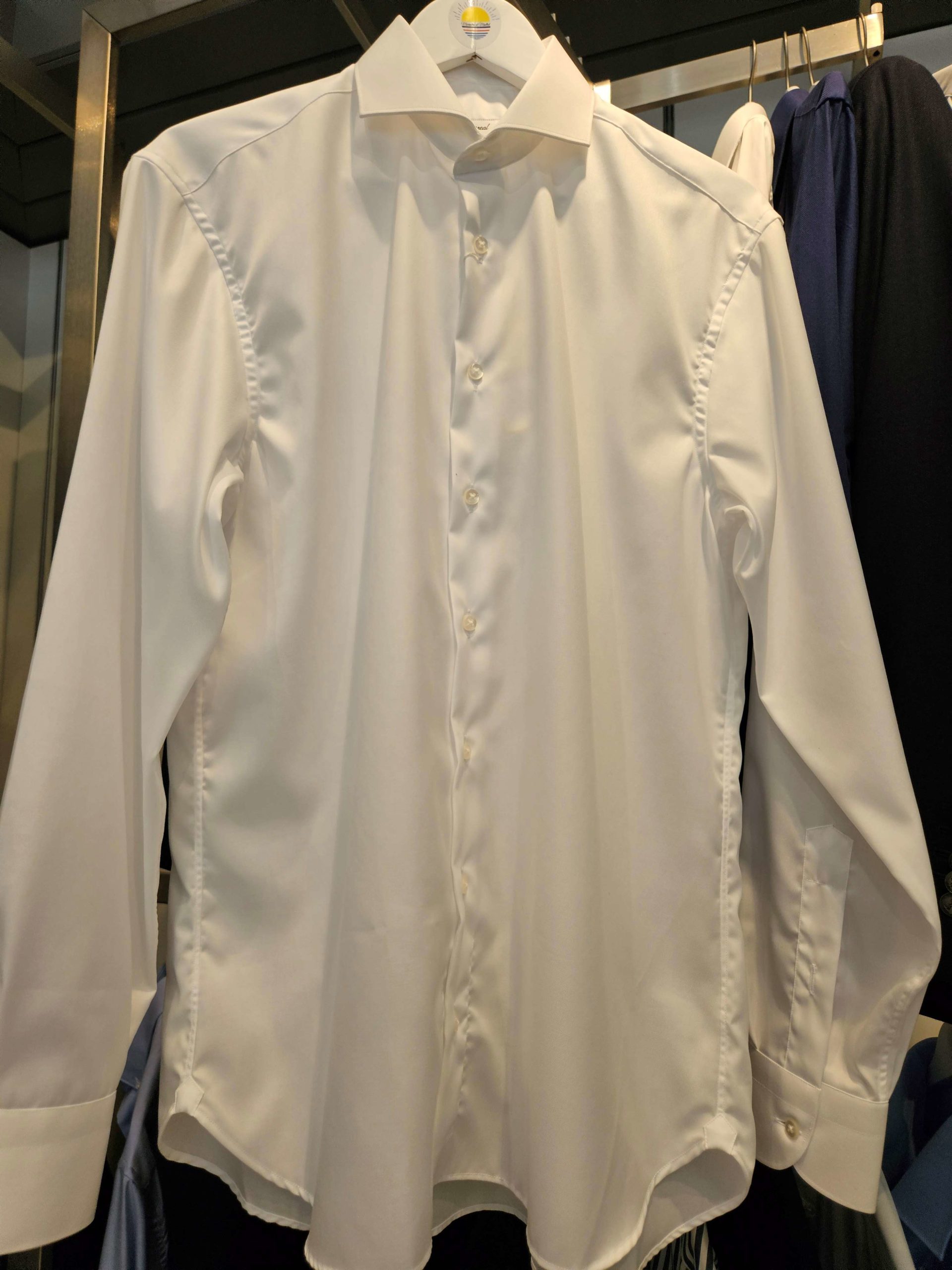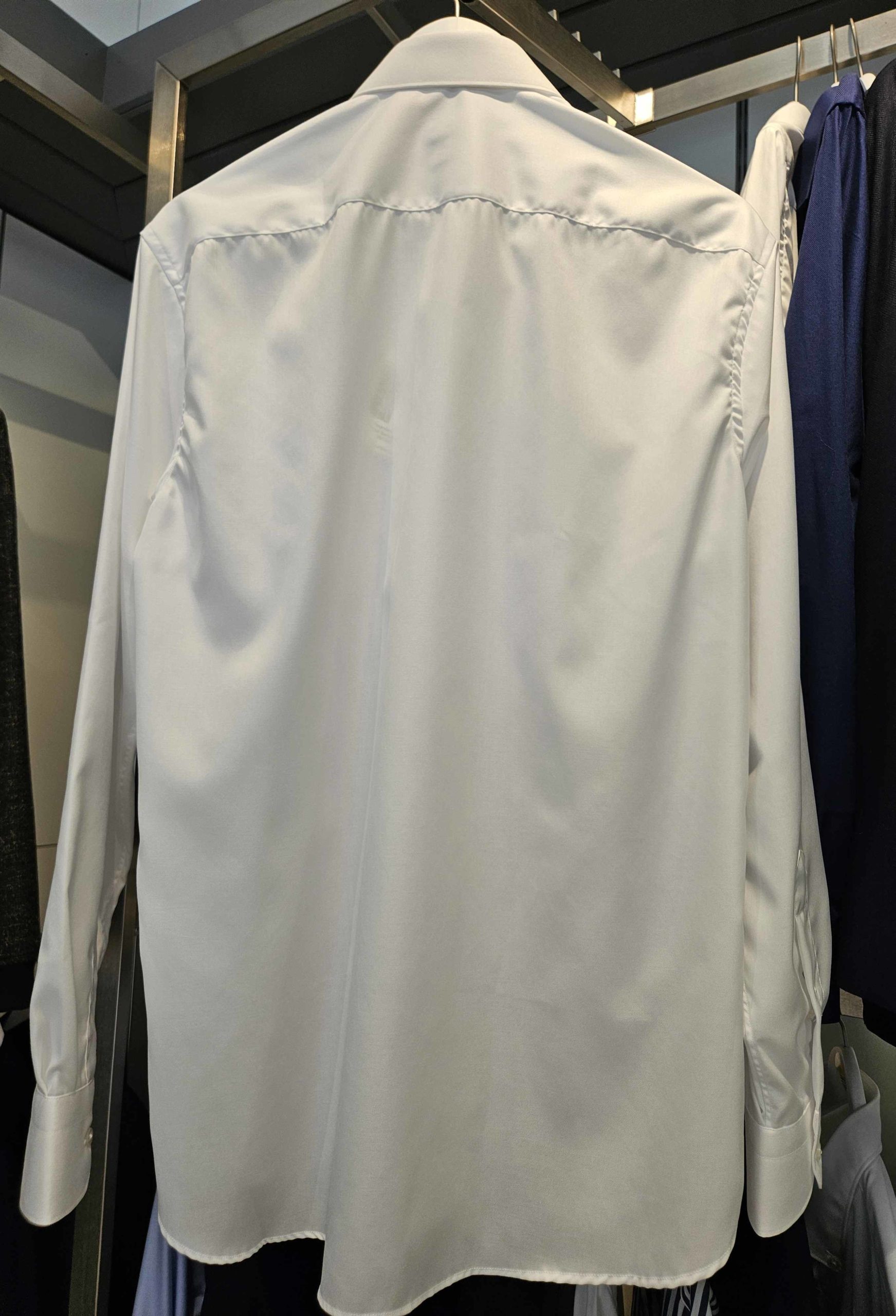 Le col horizontal, à l’ouverture large, est spécialement conçu pour accueillir une cravate imposante, comme le nœud Windsor – une touche de distinction idéale pour les cérémonies ou les rendez-vous importants.