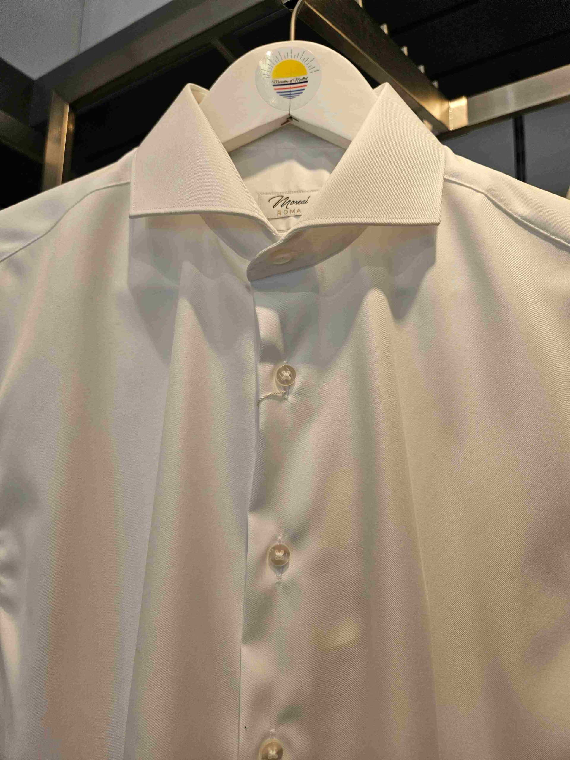 Chemise Blanche en Coton Sergé – Coupe régular – Col Horizontal Élégant Chemise blanche homme en coton sergé. Col horizontal large idéal pour cravate Windsor, coupe regular, boutons nacrés. Fabriquée en Italie. Repassage facile.