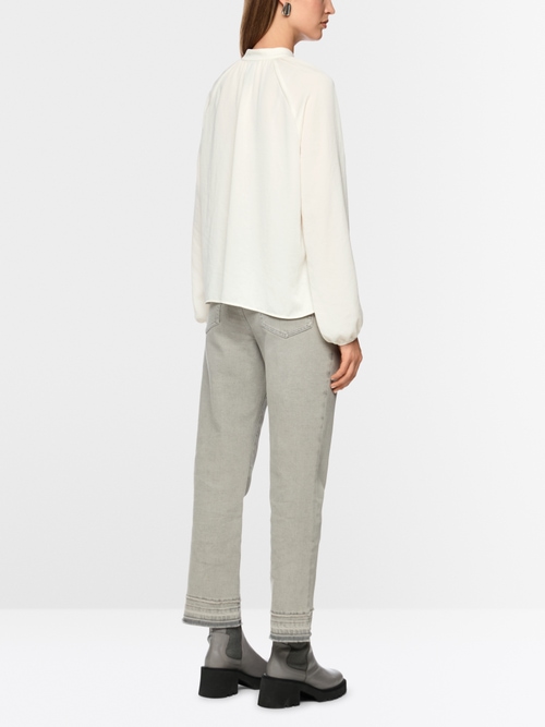 Coupe fluide – tissu irisé façon satin/soie – col officier- boutonné dans le haut– tisssu froncé autour du col – coupe qui ne marque pas le corps – manches raglantes – bas des manches resérré