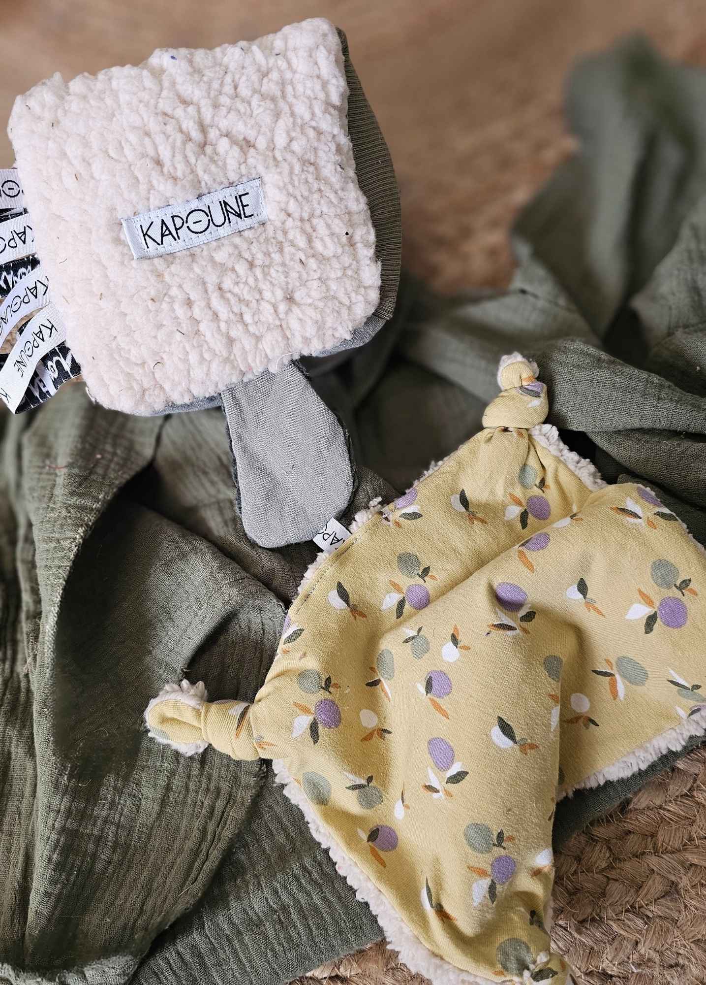 Coffret cadeau bébé doudou, lange et cube d’éveil Kaki