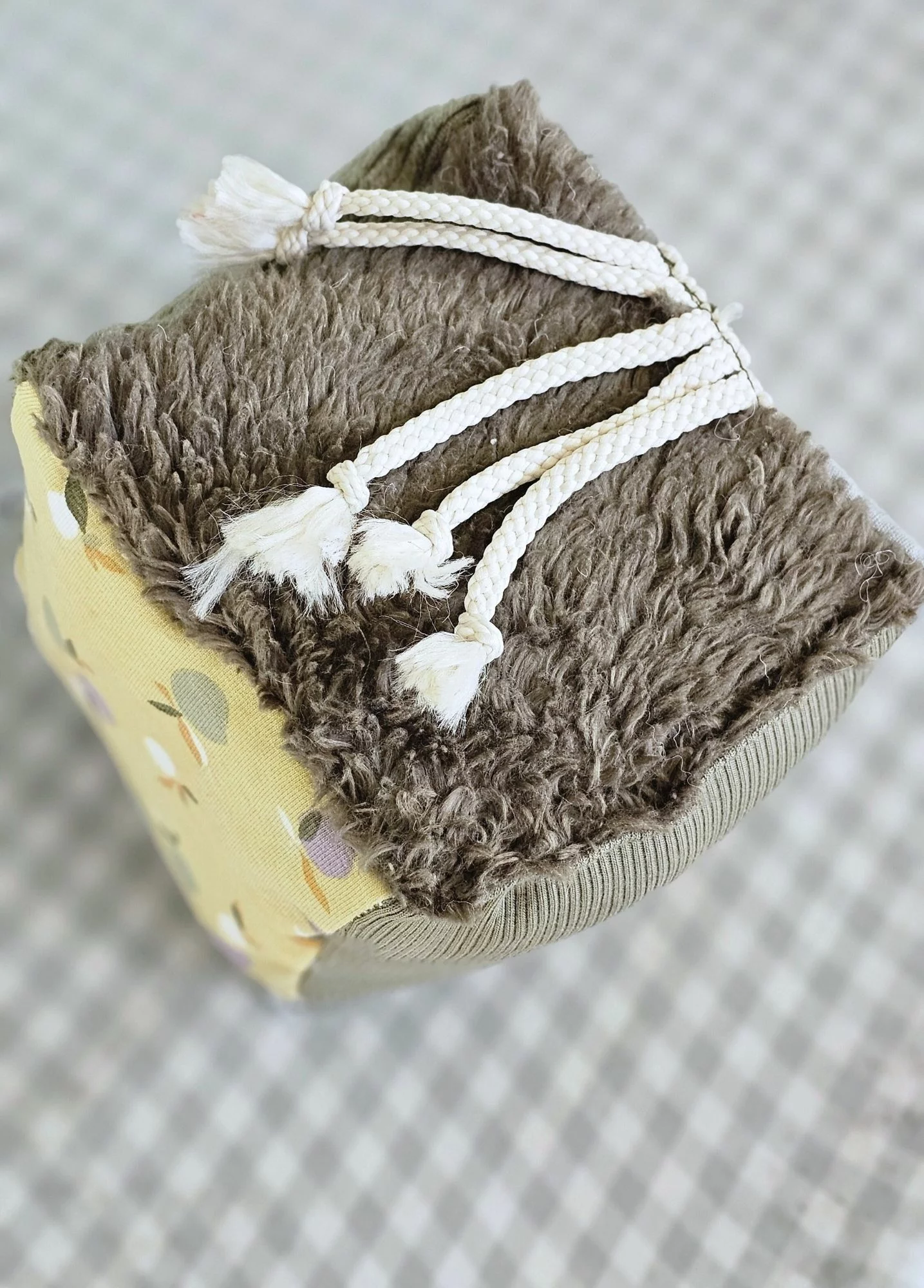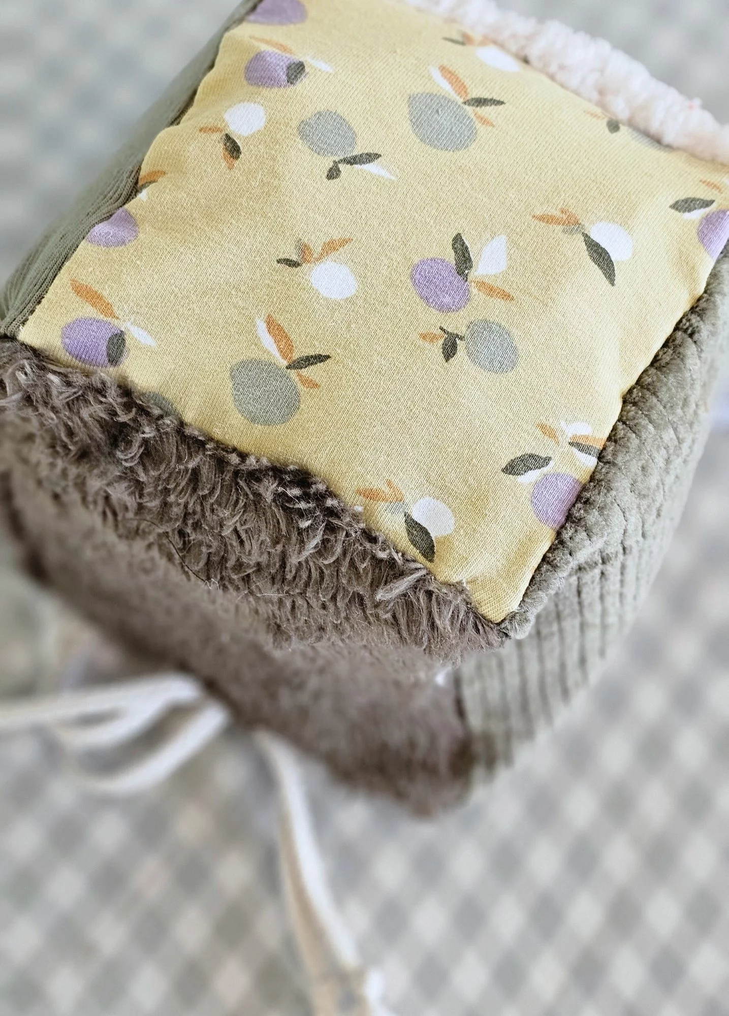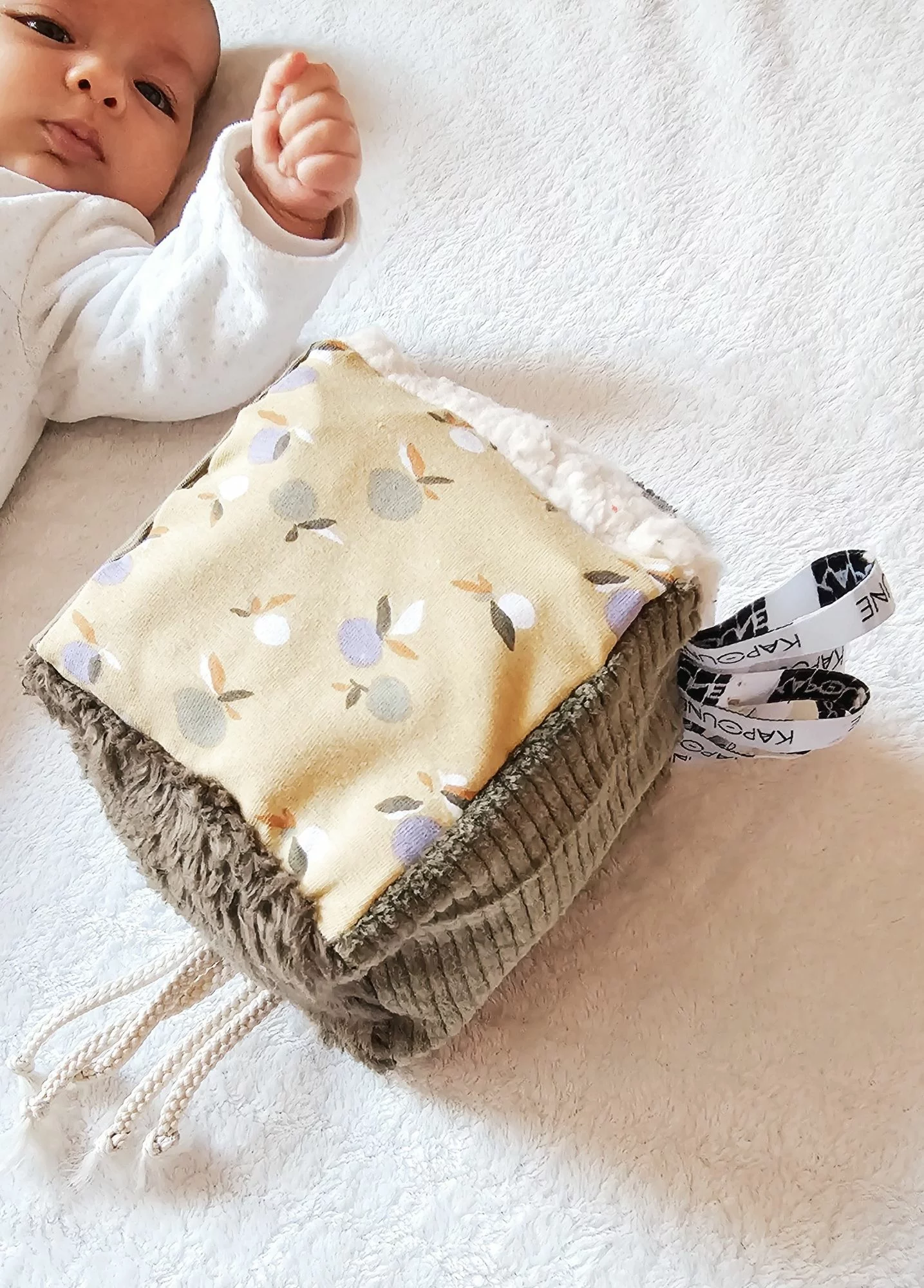 • Le cube d’éveil est fabriqué avec nos chutes de tissu et en fonction de notre stock : chaque cube sera unique dans la gamme de couleur choisie.