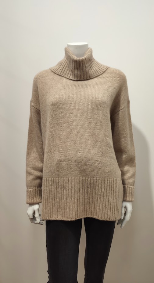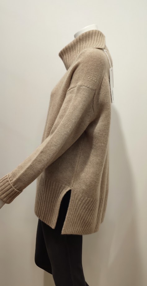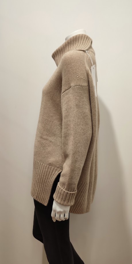 Pull long – coupe oversize – manches montées bas – fendu sur les côtés – grands bords côtes en bas ainsi que sur le col et les manches – col roulé fendu derrière