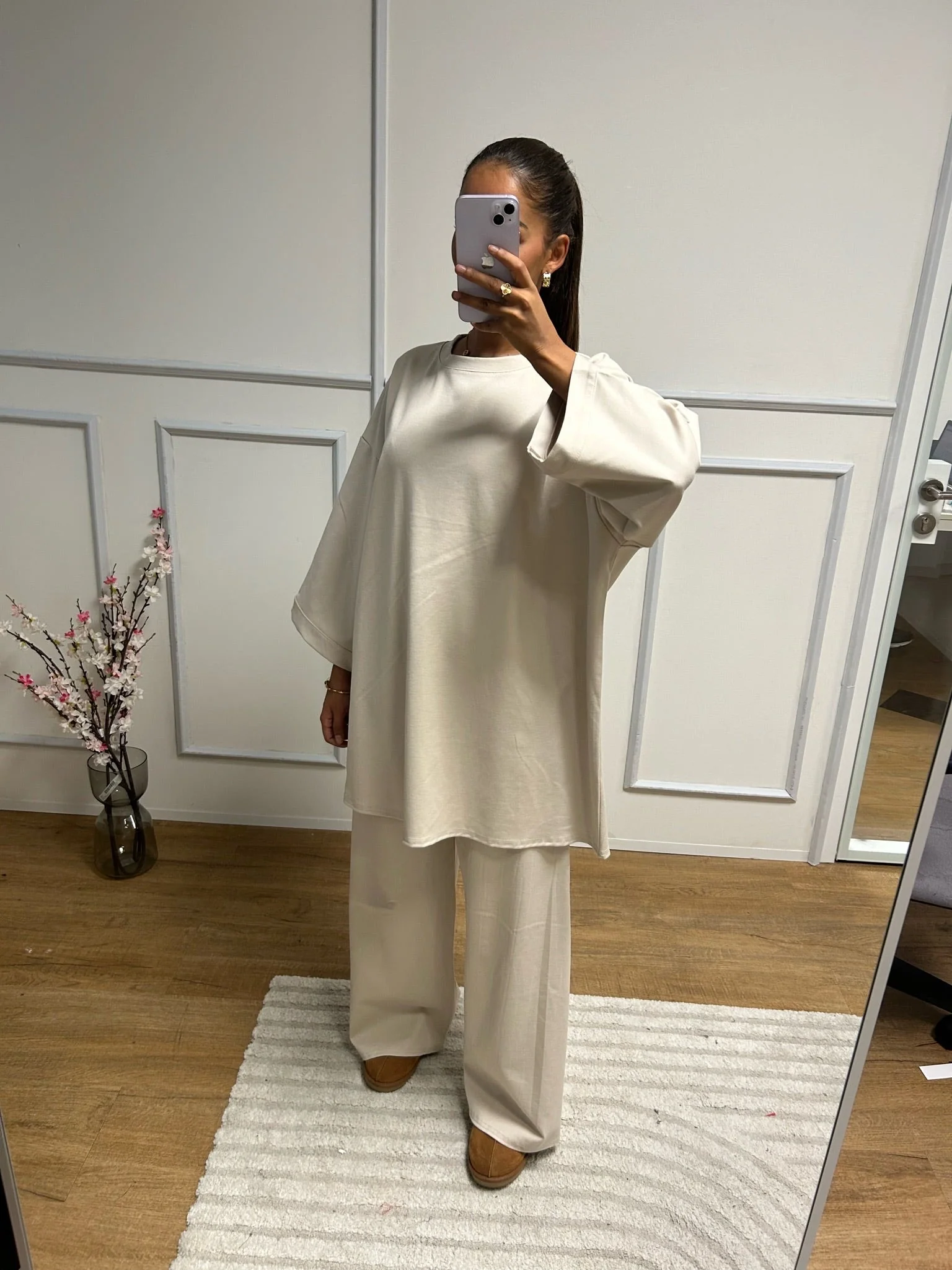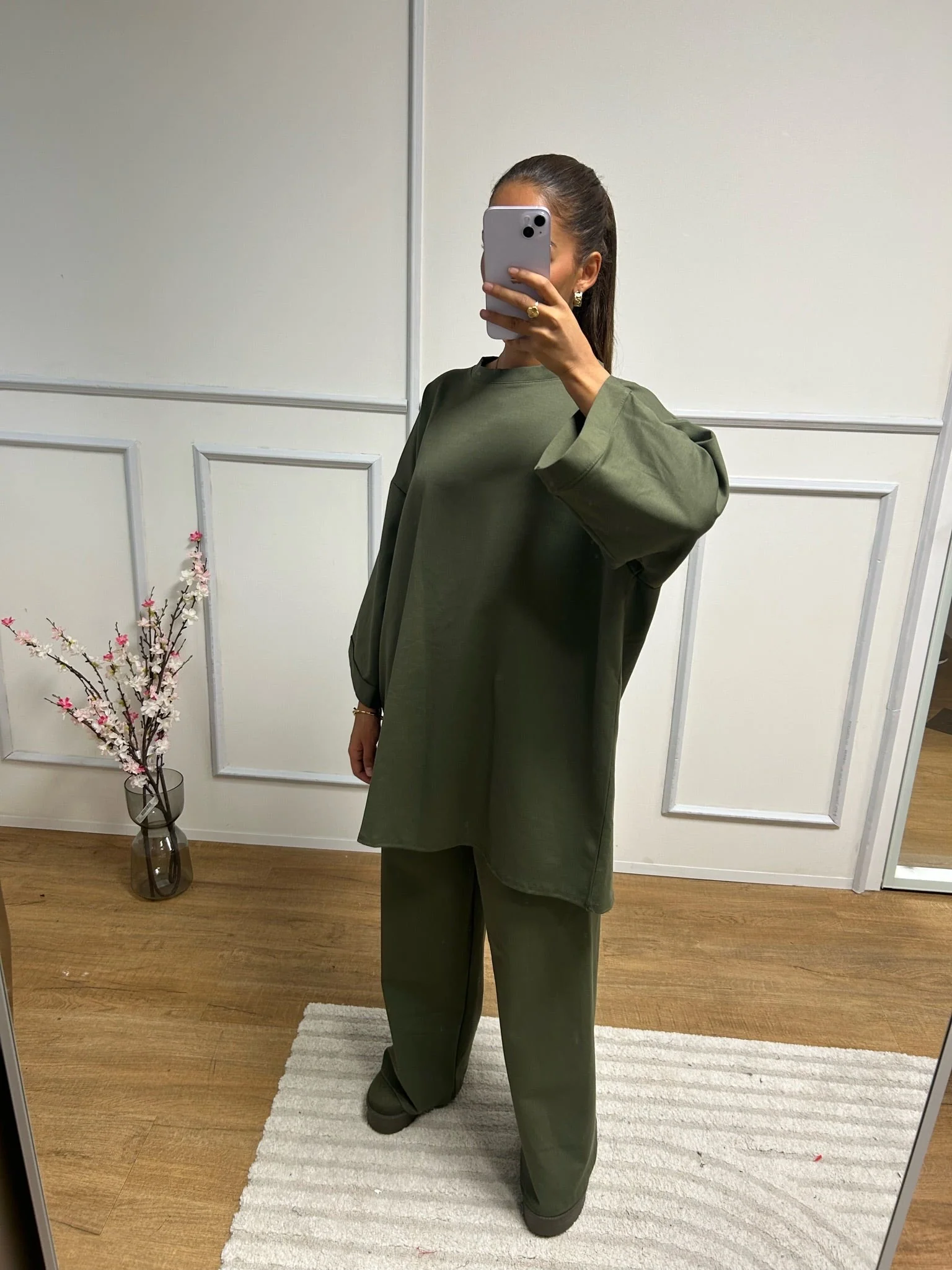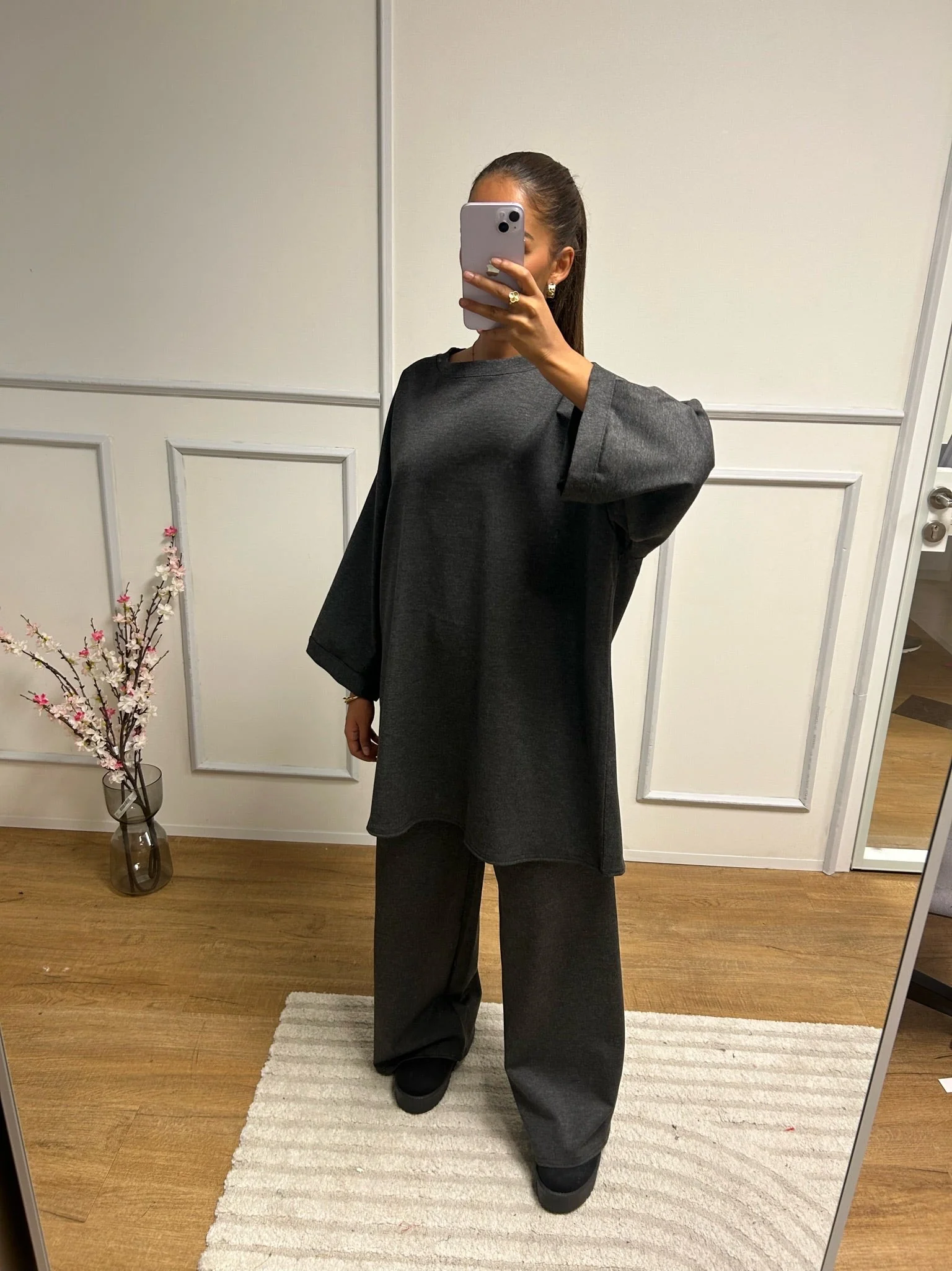 Ensemble décontracté composé d’une tunique longue à manches larges et d’un pantalon large assorti. Confortable et moderne, parfait pour un look simple et élégant au quotidien.