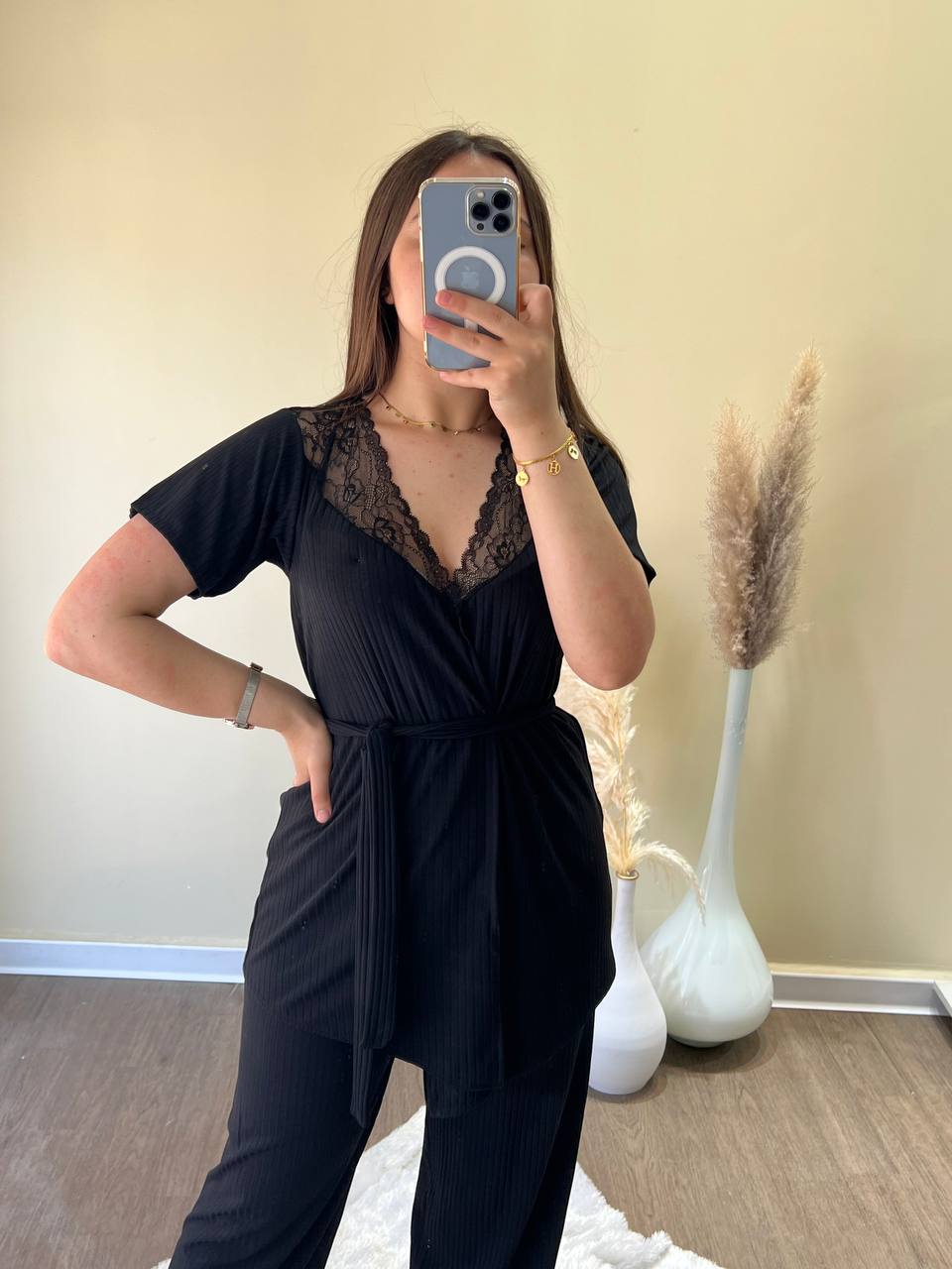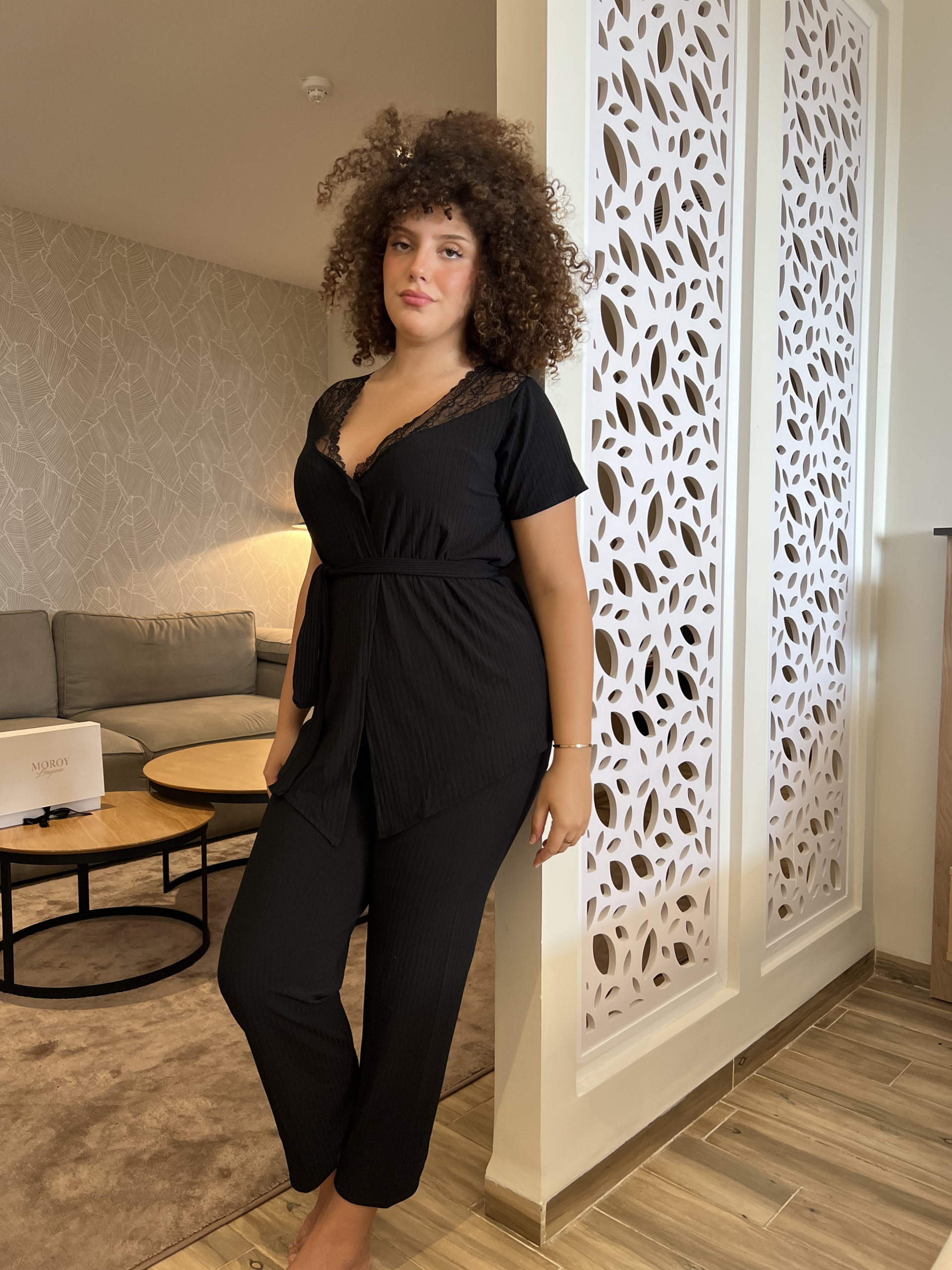 Ensemble 2 pièces – kimono demie manches et pantalon, ornée de dentelle blanche. COULEURS : Rose / Noir MATÉRIAU : Coton Lycra TAILLES DISPONIBLES : T1(SM) 36-38, T2(LXL) 40-42, T3 (XXl) 44