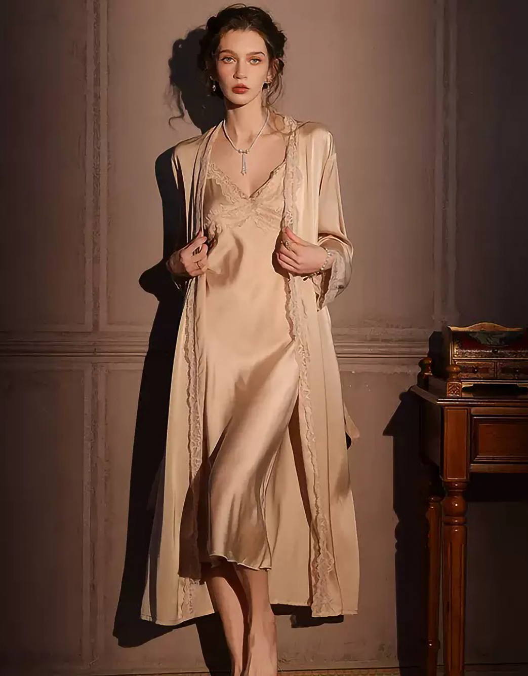 Ensemble nuisette longue et kimono luxueux en soie et dentelle- RK1