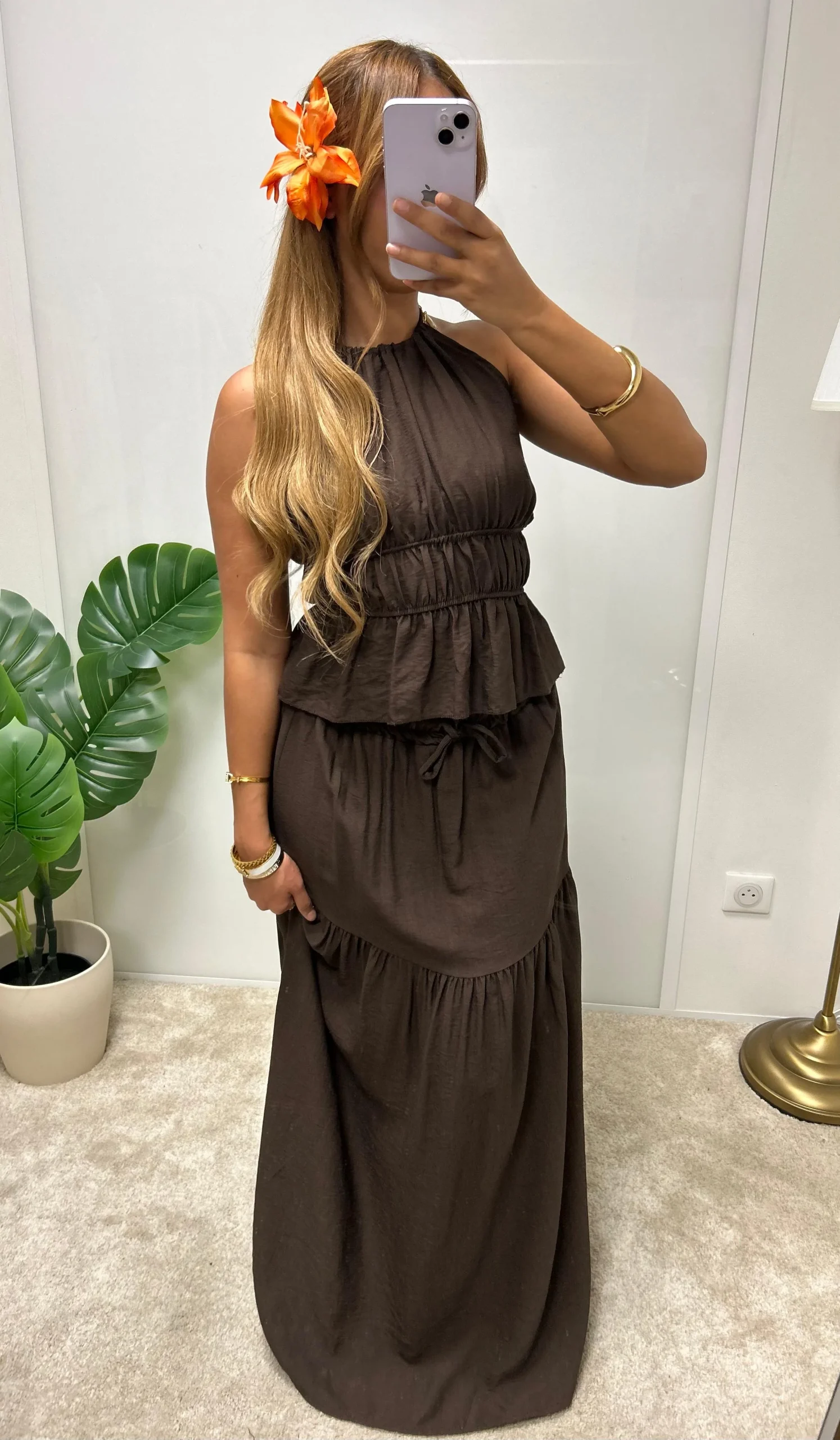 Robe longue sans manches avec col rond froncé et taille élastique ajustable par cordon. Son tissu fluide et léger apporte un tombé naturel, idéal pour un look estival frais et confortable.