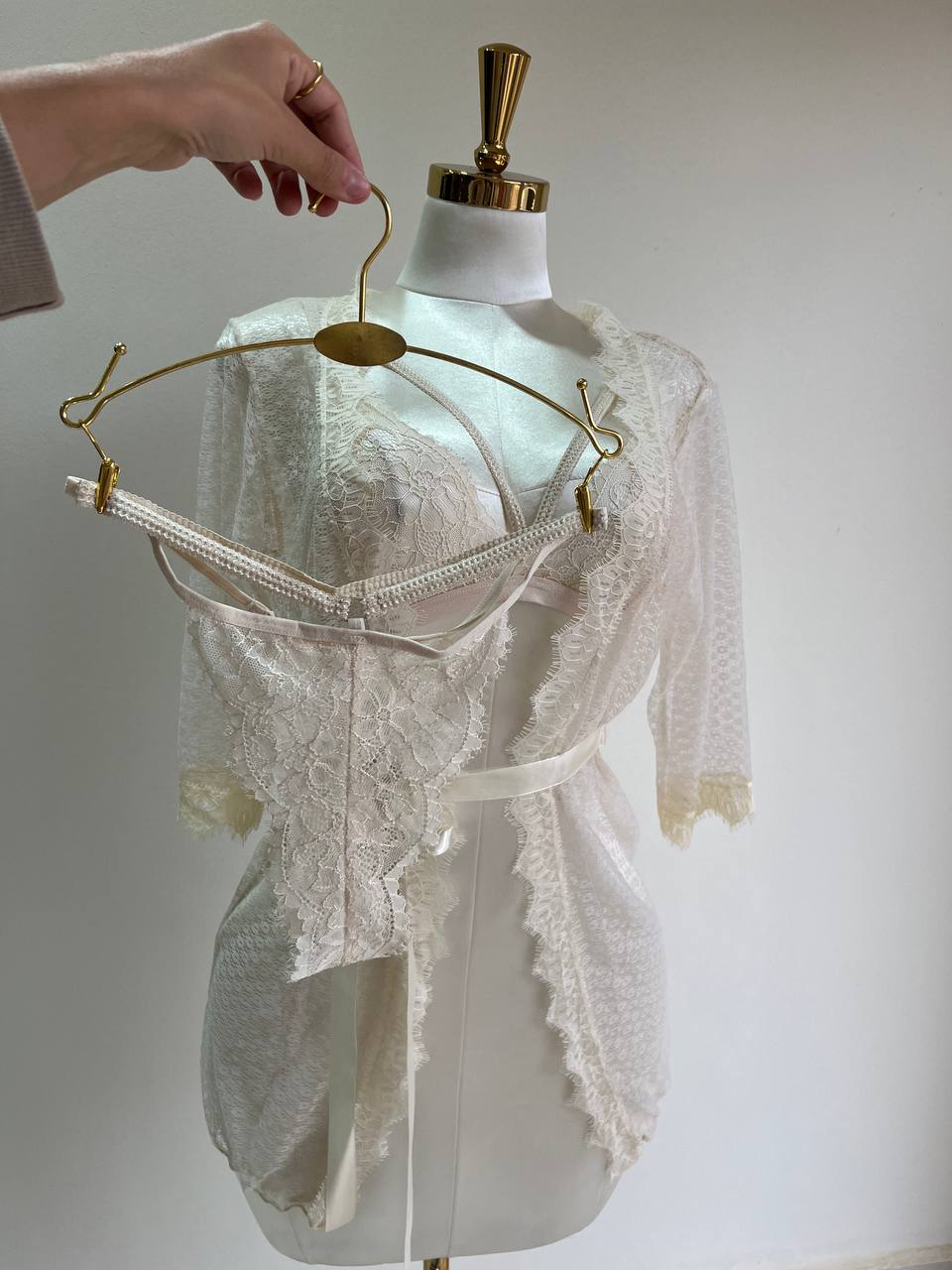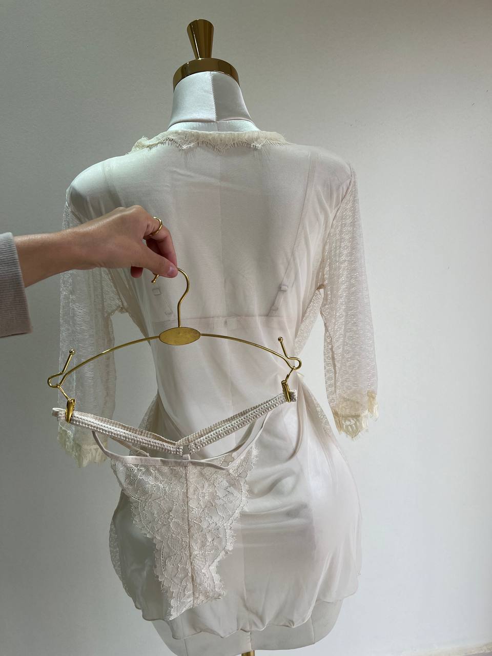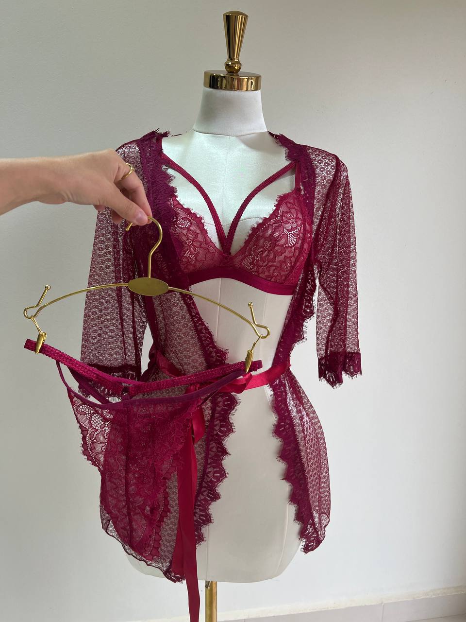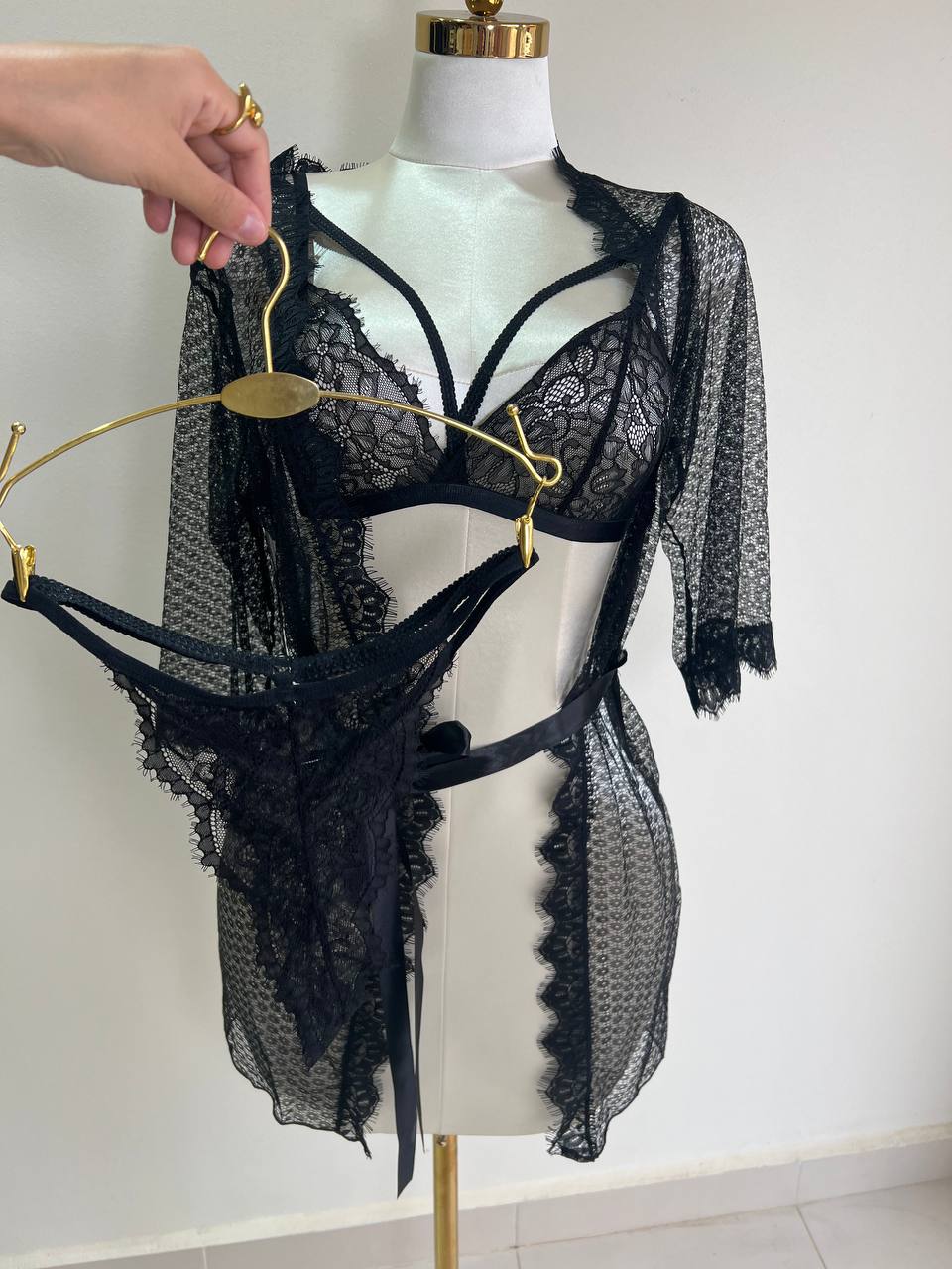 Ensemble 3 pièces Taly : String + Soutien gorge+ kimono. COULEURS : Bleu / Blanc / Bordeau / Noir / Beige MATÉRIAU : Dentelle TAILLES DISPONIBLES : Standard (36-42)