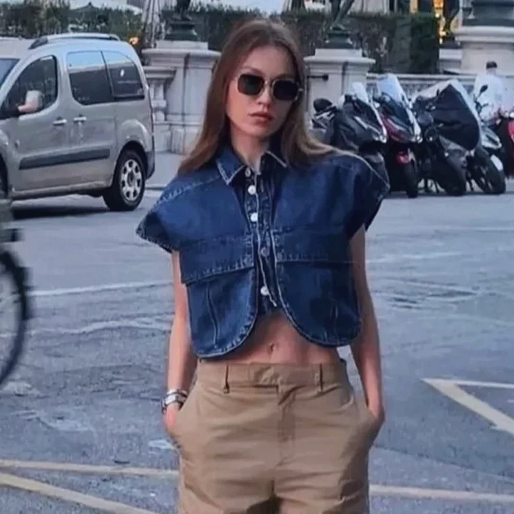 Ajoutez une touche de modernité à votre garde-robe avec ce gilet en jean court à boutons. Ce modèle sans manches, conçu pour la femme à la recherche d’un style High Street est fabriqué en denim de qualité.