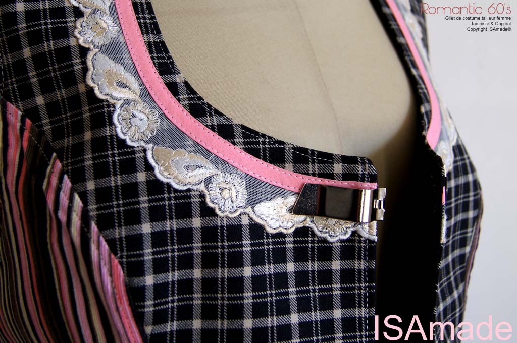 Ce Gilet sans manches femme tendance chic « Romantic 60’s » est réalisé en tissu lainage à carreaux Noir écru, de de velours cotelé fin à rayures dans des tons de Rose , de belle dentelle fleurie de style lingerie féminine.
