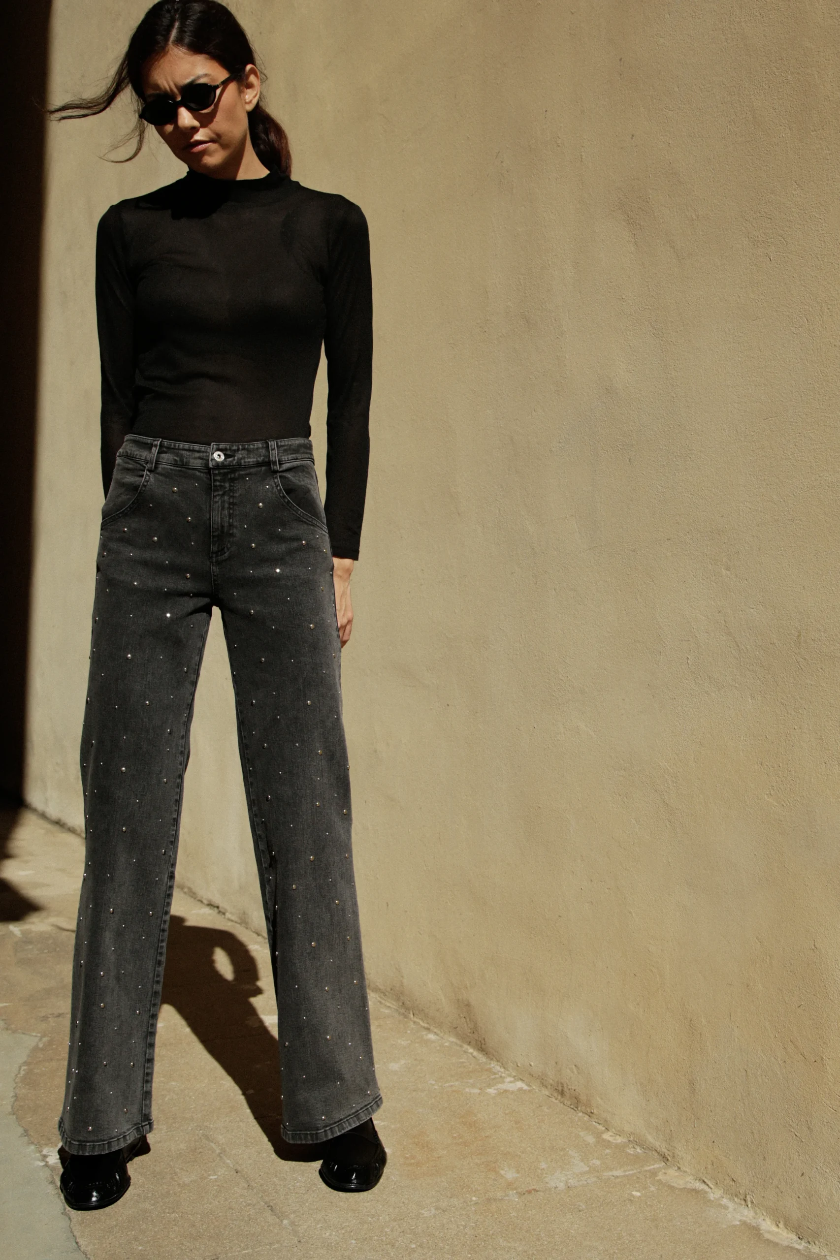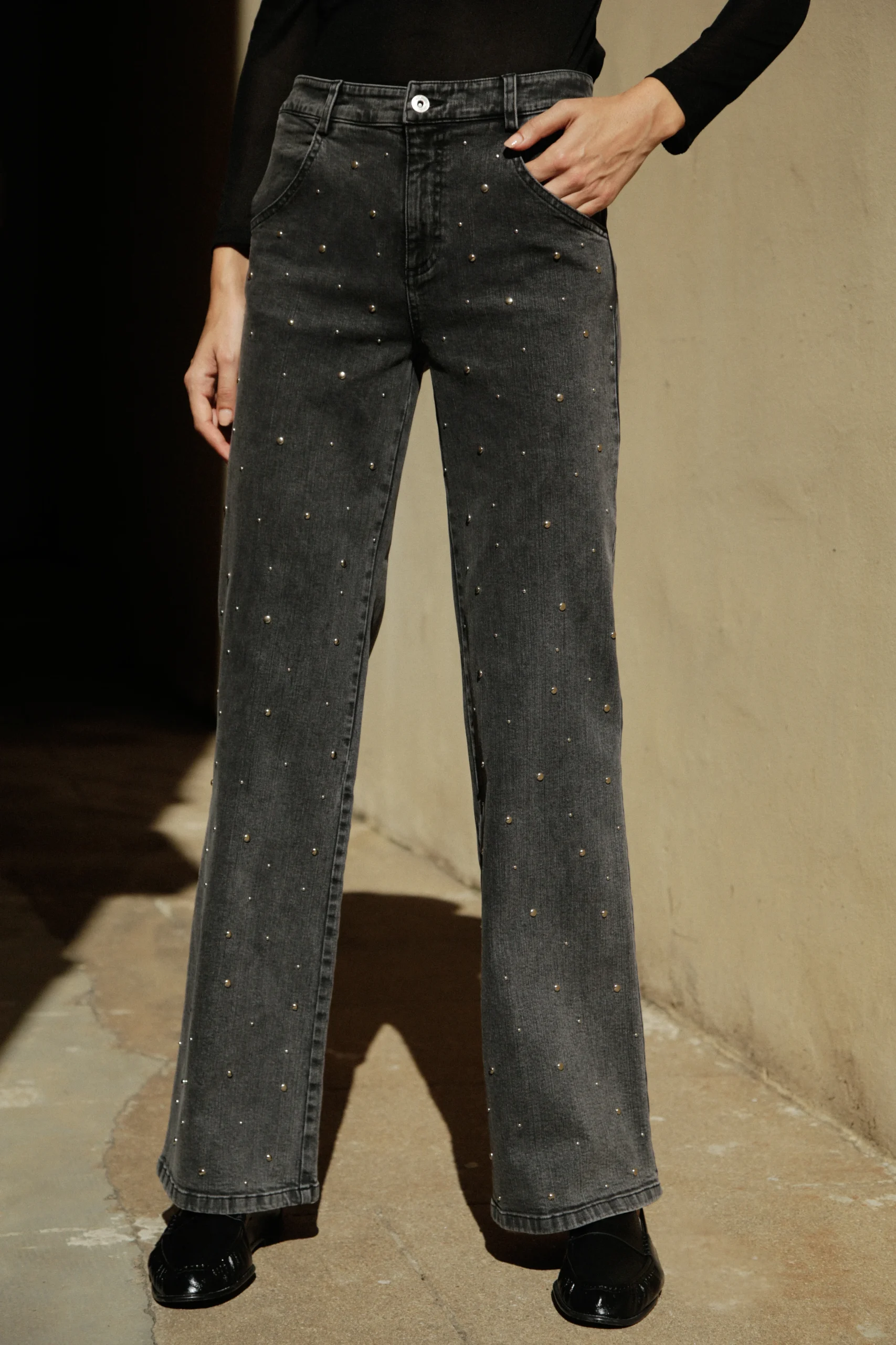 Le jean Gabriel capte la lumière comme un bijou discret : une pluie de micro-clous rehausse le gris du denim pour signer une allure city-glam parfait pour cette saison.