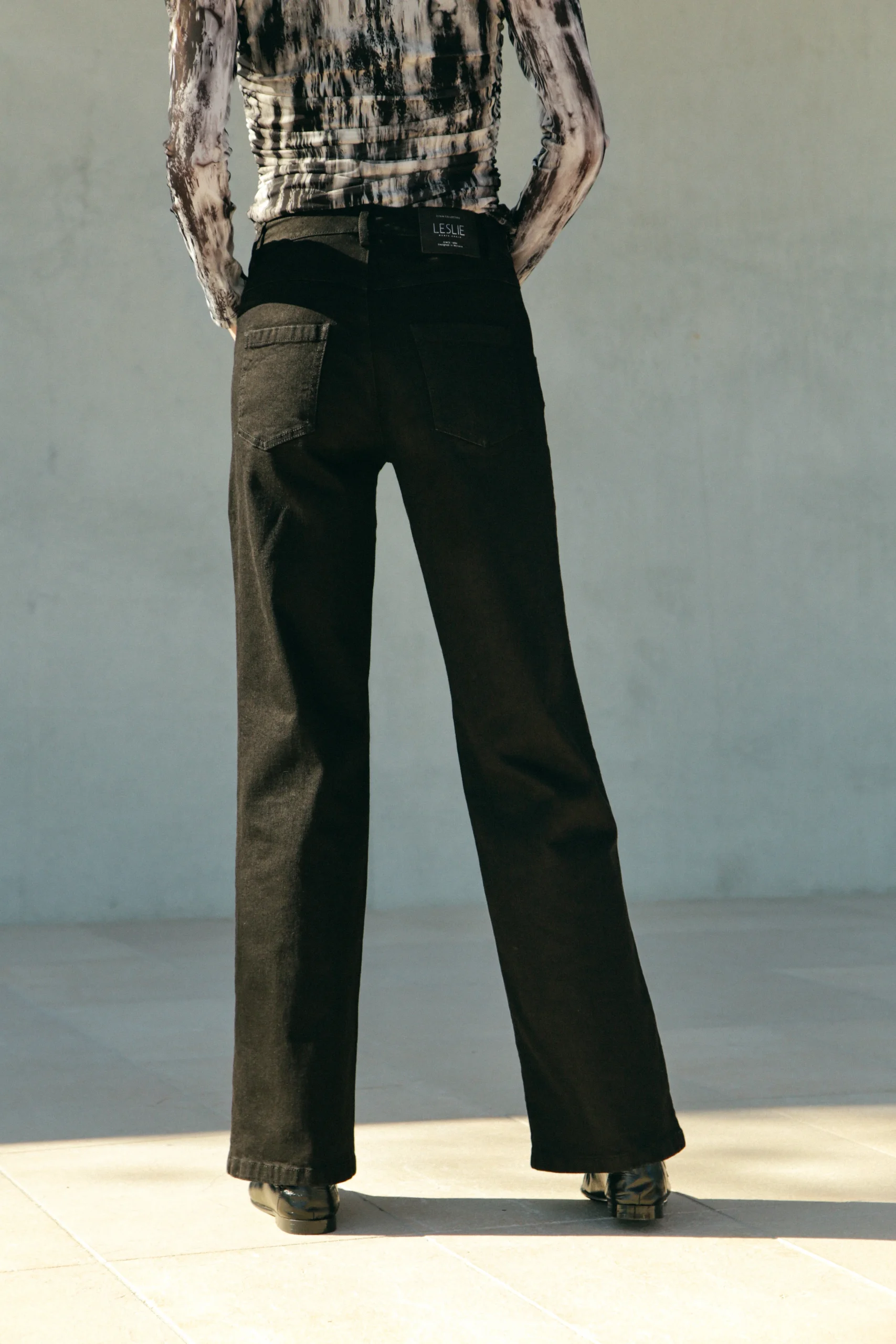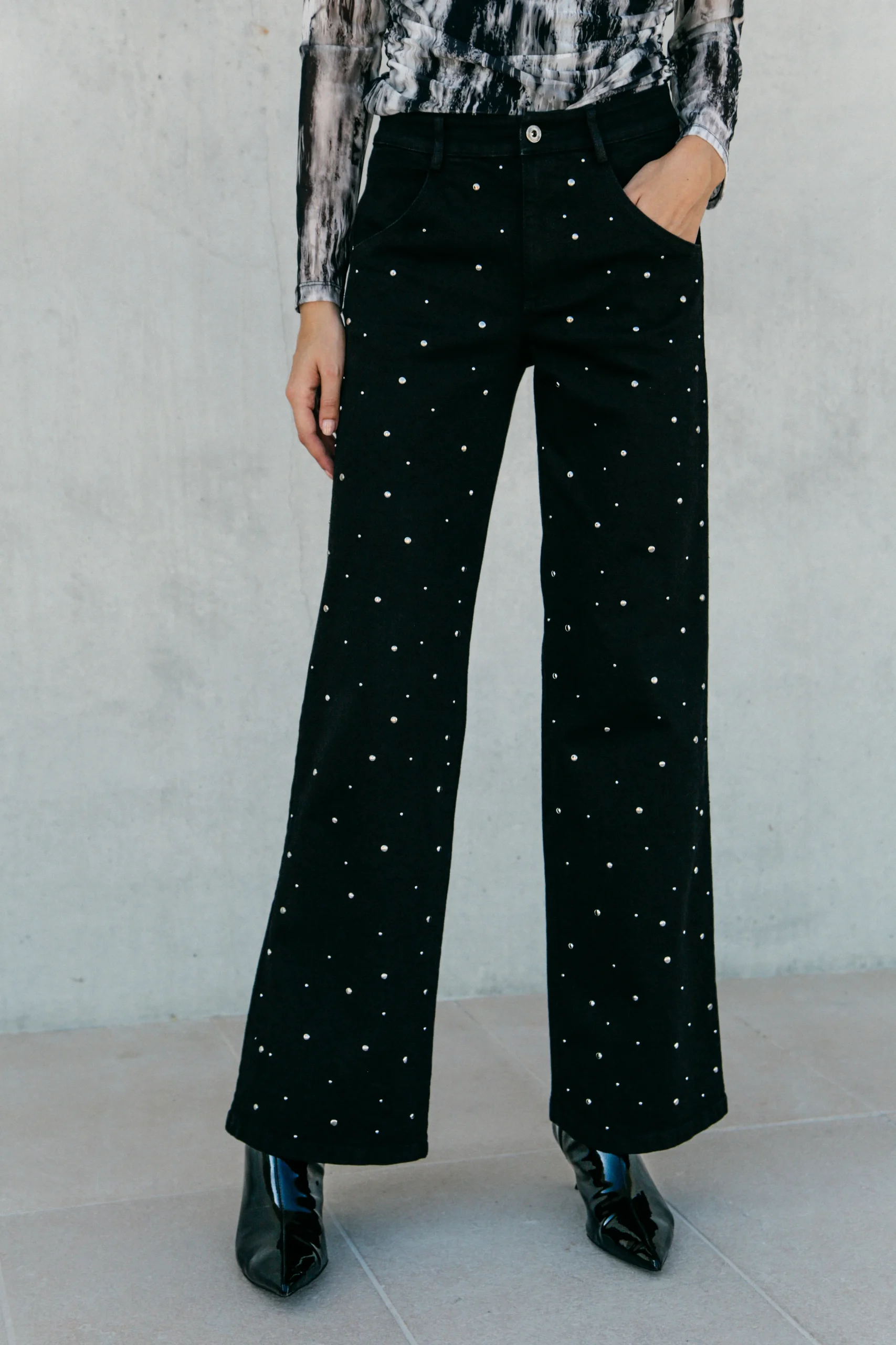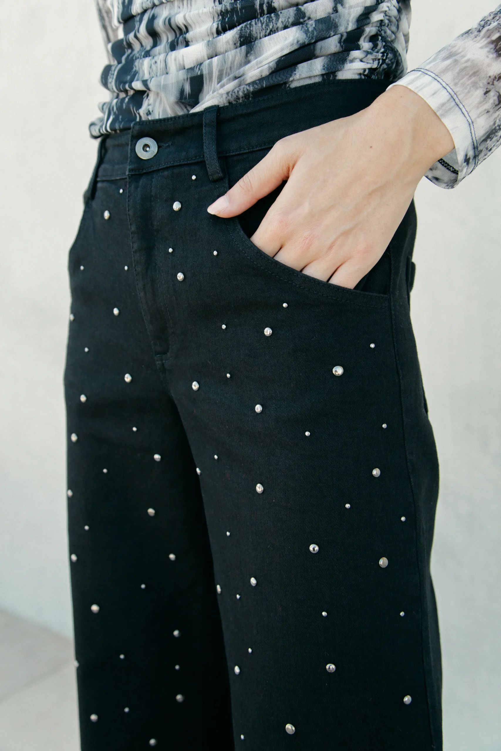 Le jean Gabriel capte la lumière comme un bijou discret : une pluie de micro-clous rehausse le noir profond du denim pour signer une allure city-glam parfait pour cette saison.