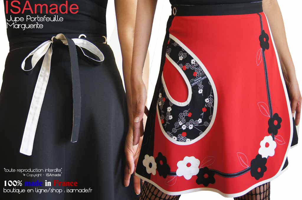 Jupe portefeuille rouge fleurie made in France chic originale : Un esprit 70’s chic pour une jupe citadine originale et actuelle.