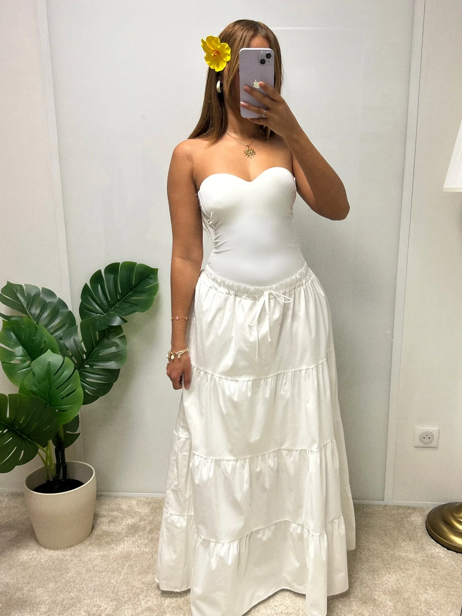 Jupe longue fluide à volants, idéale pour l’été grâce à sa coupe légère et confortable. Sa taille haute à lien apporte une touche bohème et met en valeur la silhouette.
