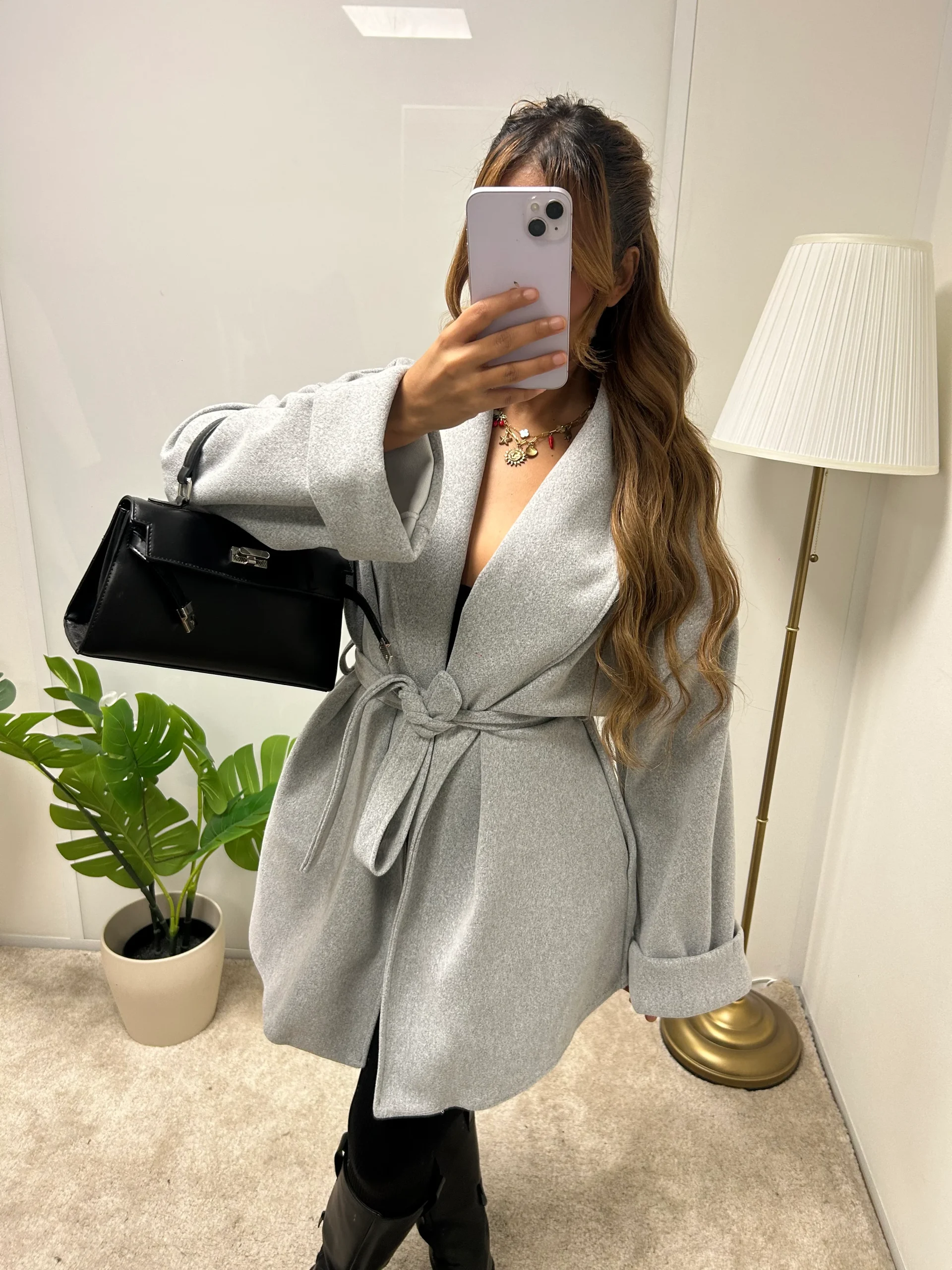 Coupe droite et fluide, associée à un large col et une ceinture ton sur ton