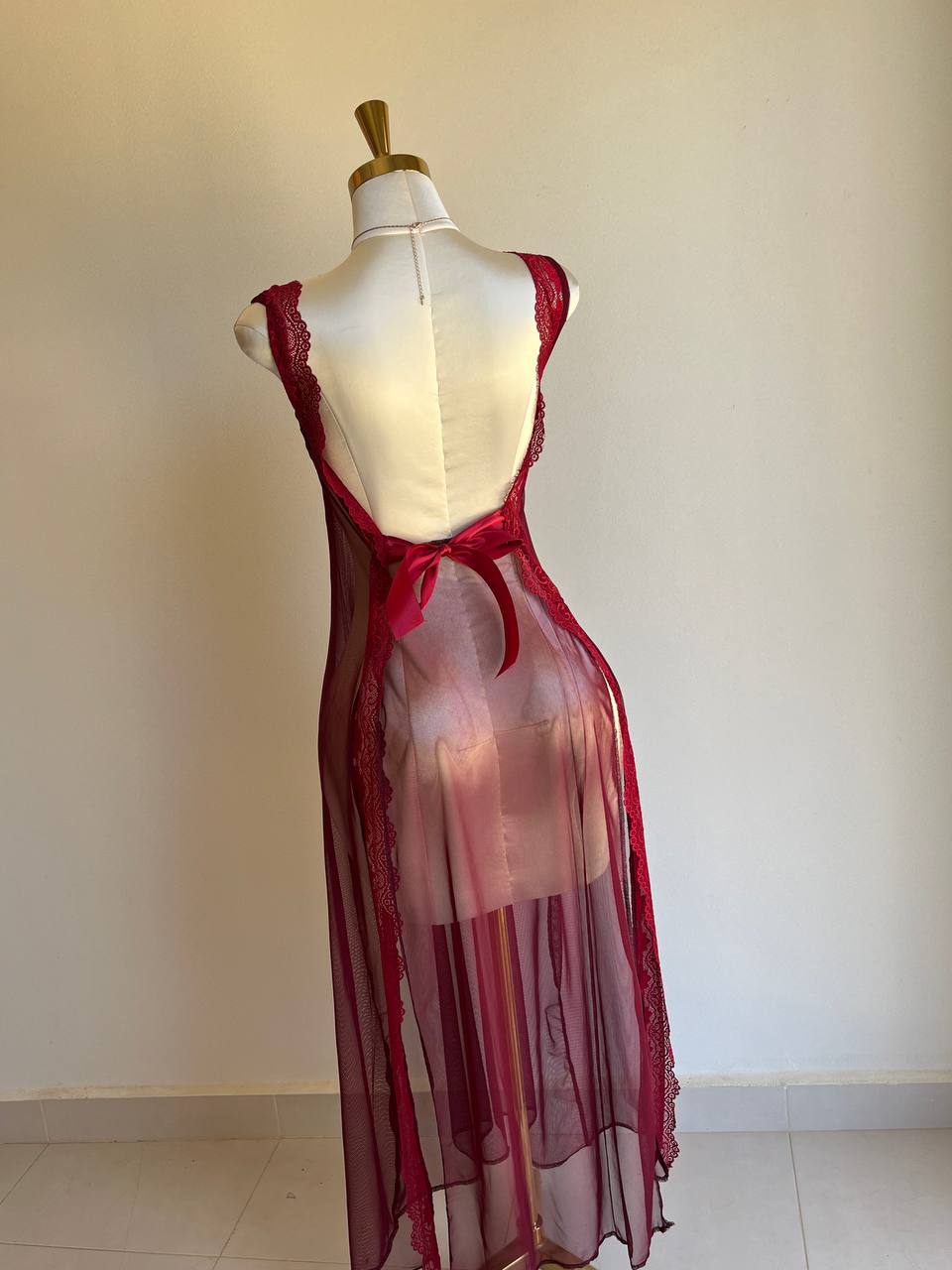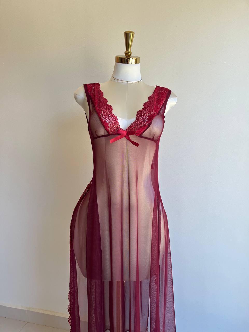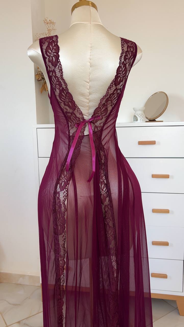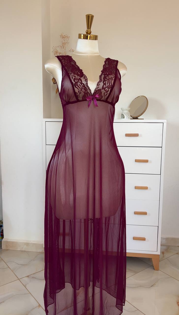Nuisette en tulle doux et dentelle. COULEURS : Aubergine / Bordeau MATÉRIAU : Tulle TAILLES DISPONIBLES : Standard (36-46)