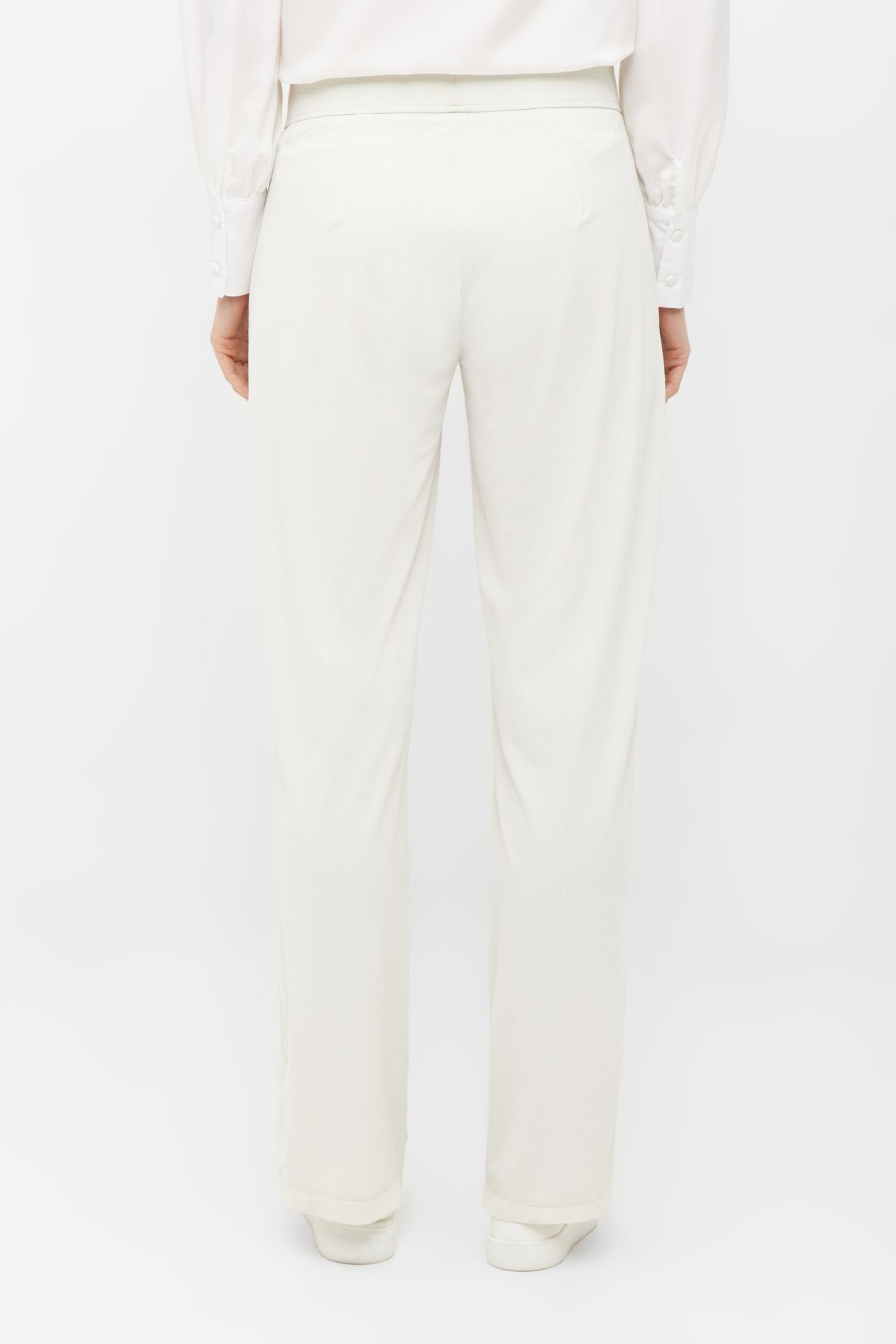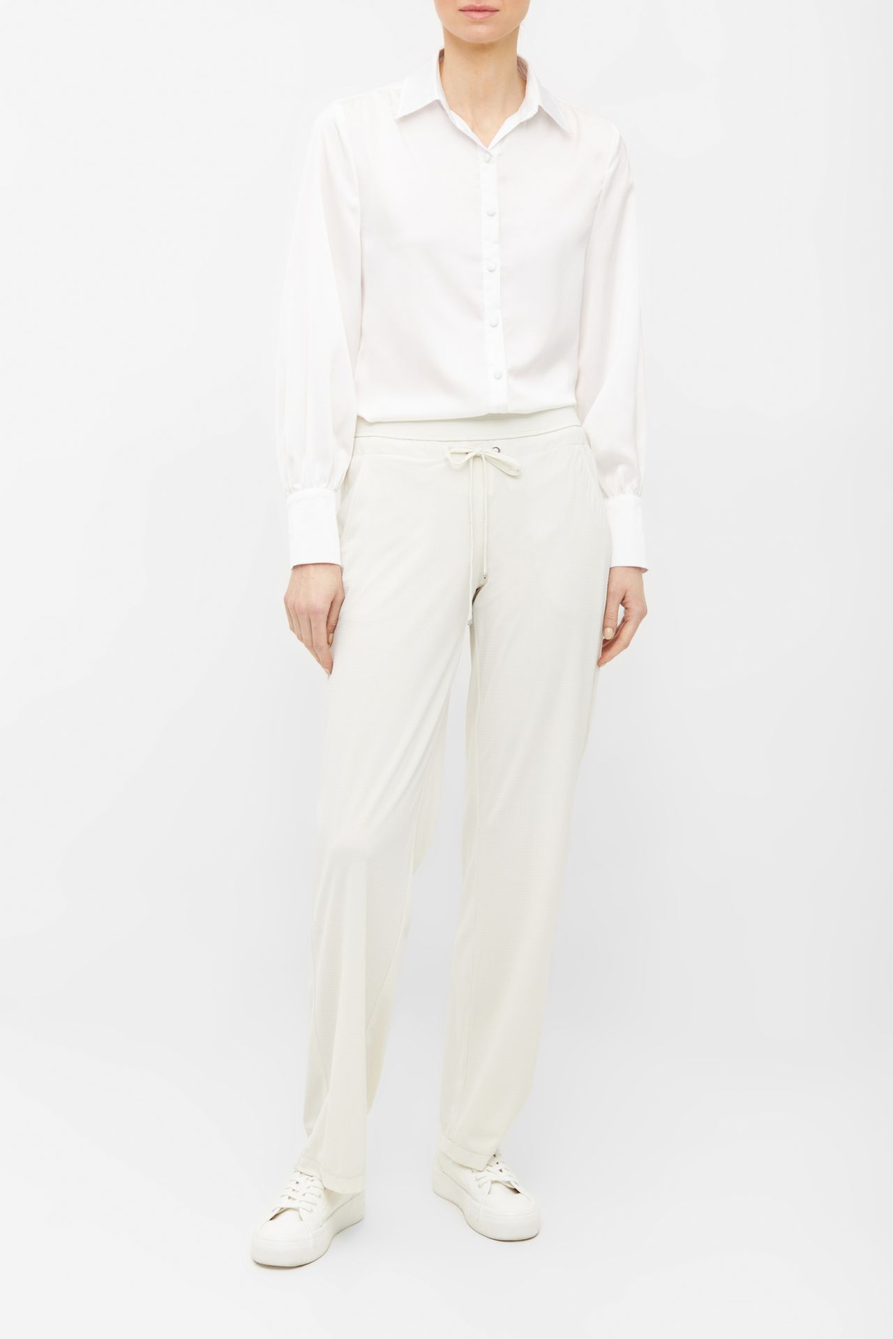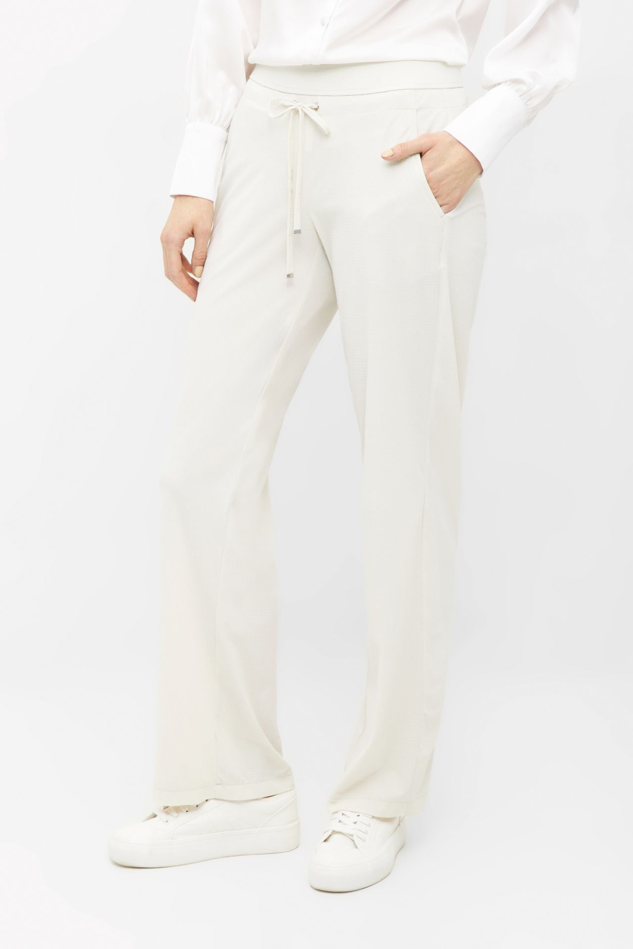 Tissu technique souple – taille élastique – coupe droite – 2 poches fendues – pas de poches derrière – cordon élastique à la taille pour le reserrer