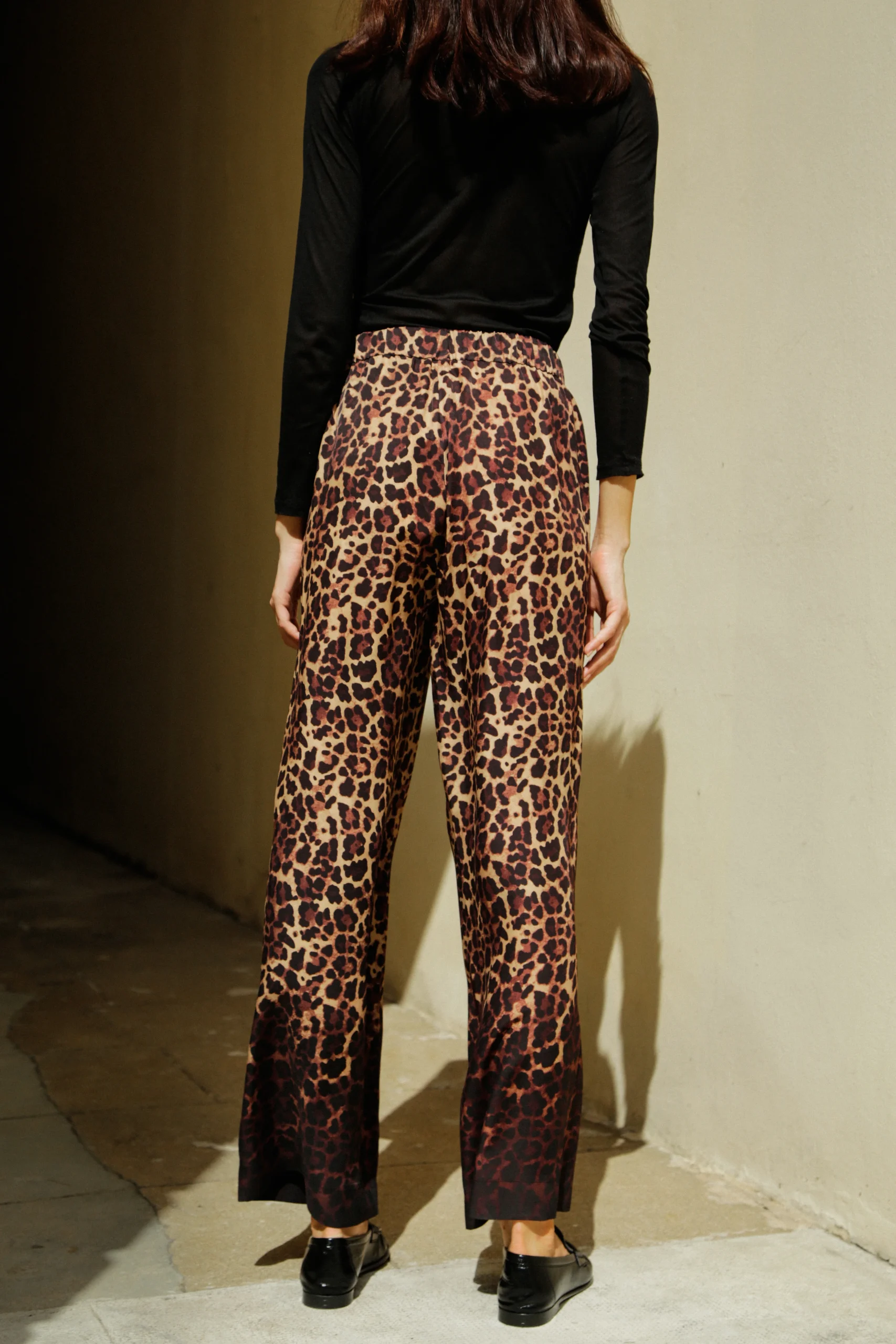 Ce pantalon fluide imprimé léopard est une invitation au mouvement et à la légèreté. Conçu dans une matière aérienne et souple, il épouse la silhouette sans la contraindre et offre un tombé élégant.