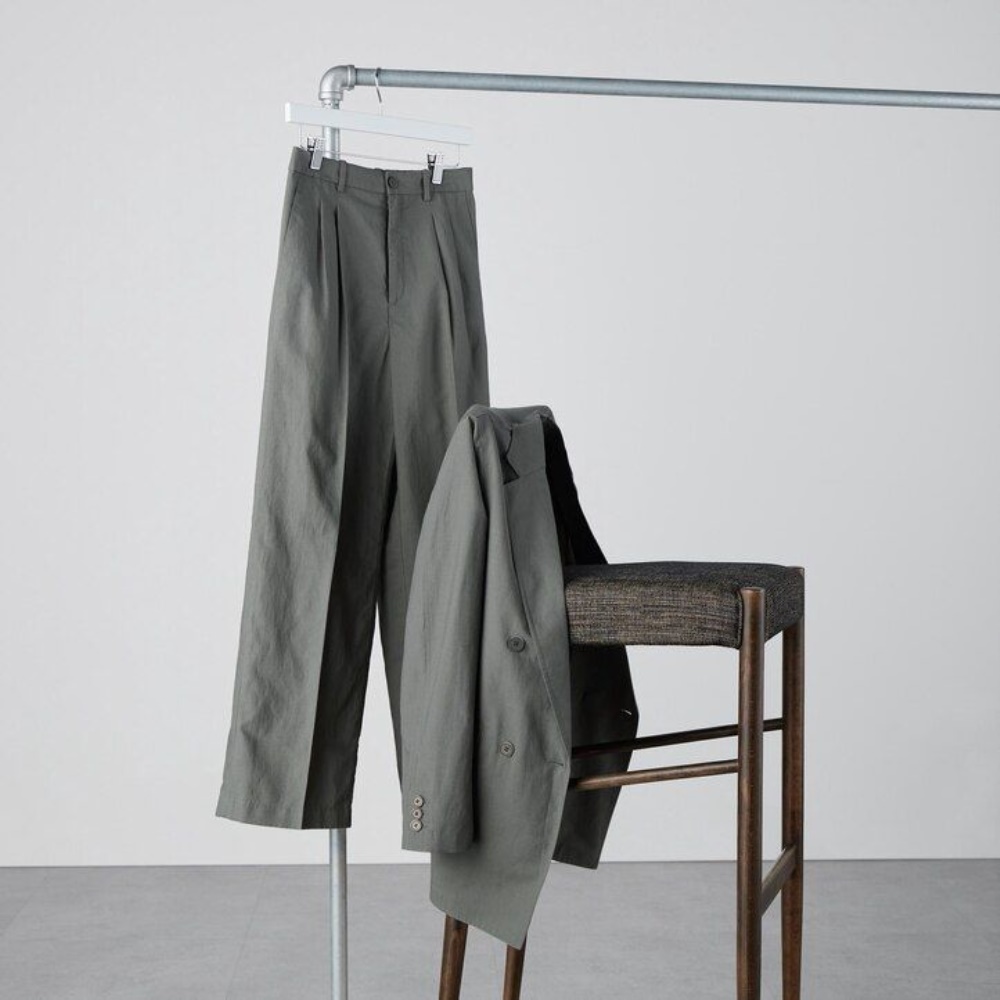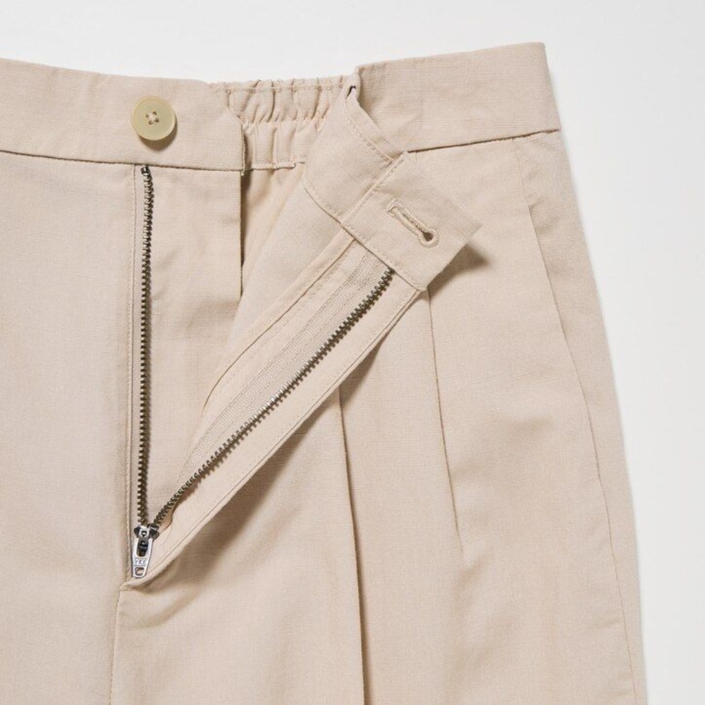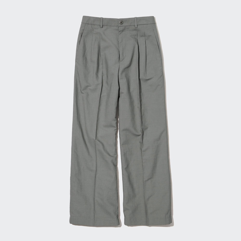 Wide-leg pants with sophisticated tucks. The material is supple and elegant.– Combines the cool feel of linen and the elegant drape of rayon. – Linen blend with excellent moisture absorption properties provides cool comfort. – Wide cut with tucks. – Shell-style buttons. – Can be used for a variety of styles, both clean and casual.