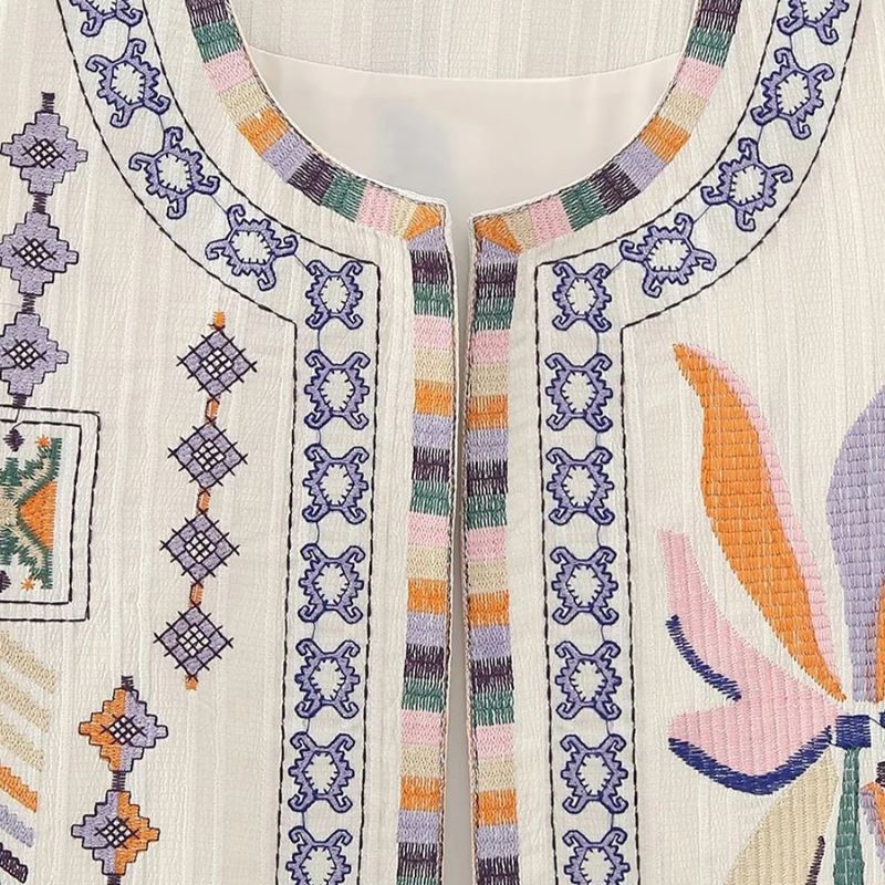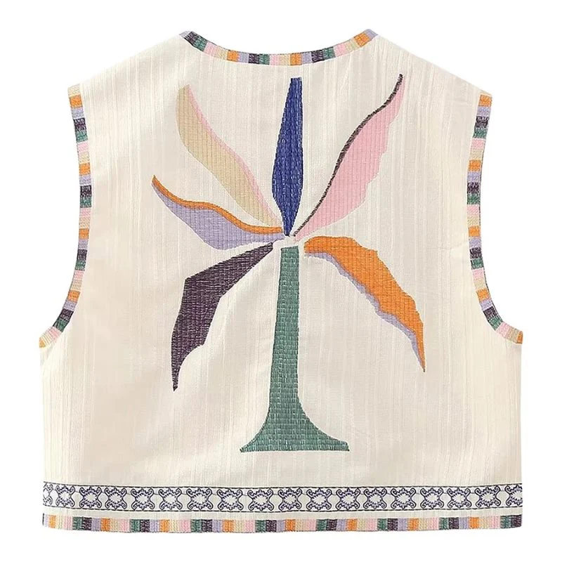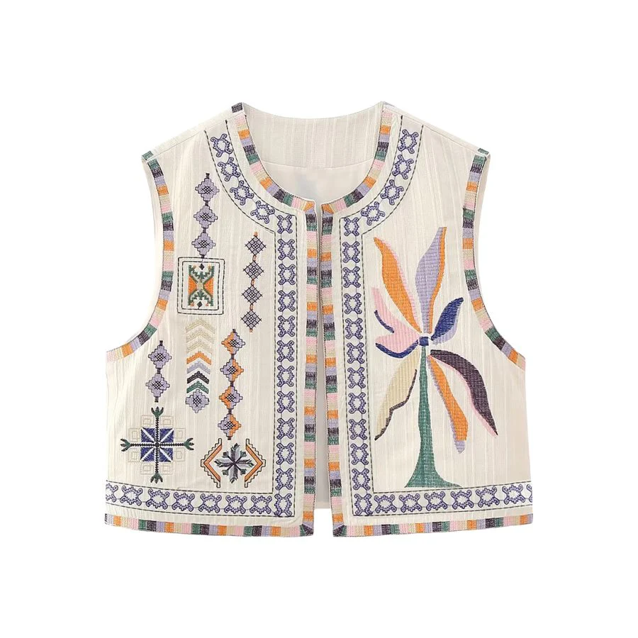 Découvrez notre élégant petit gilet sans manche beige. Ce gilet sans manches court est confectionné dans un tissu beige de haute qualité et orné de motifs colorés brodés, apportant une touche unique et raffinée à votre garde-robe.