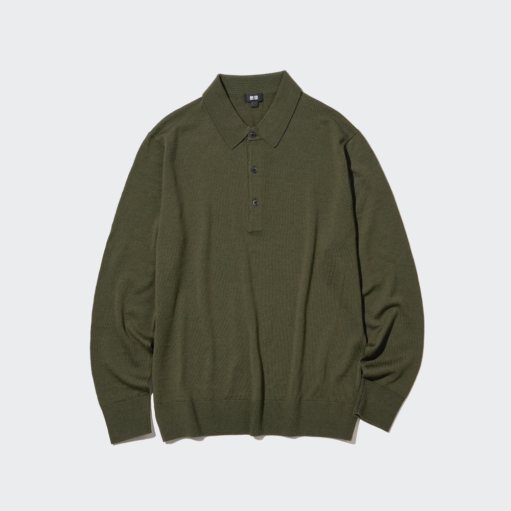 Polo Uniqlo 100pct Extra Fine Merino Tricoté Long Sleeved Homme Vert Olive V6318405