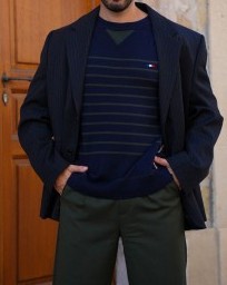 Pull col rond homme LUCIEN marine kaki Un basique chic revisité : le pull LUCIEN combine douceur et élégance avec ses rayures placées marine et kaki. Un essentiel masculin, pensé pour durer.