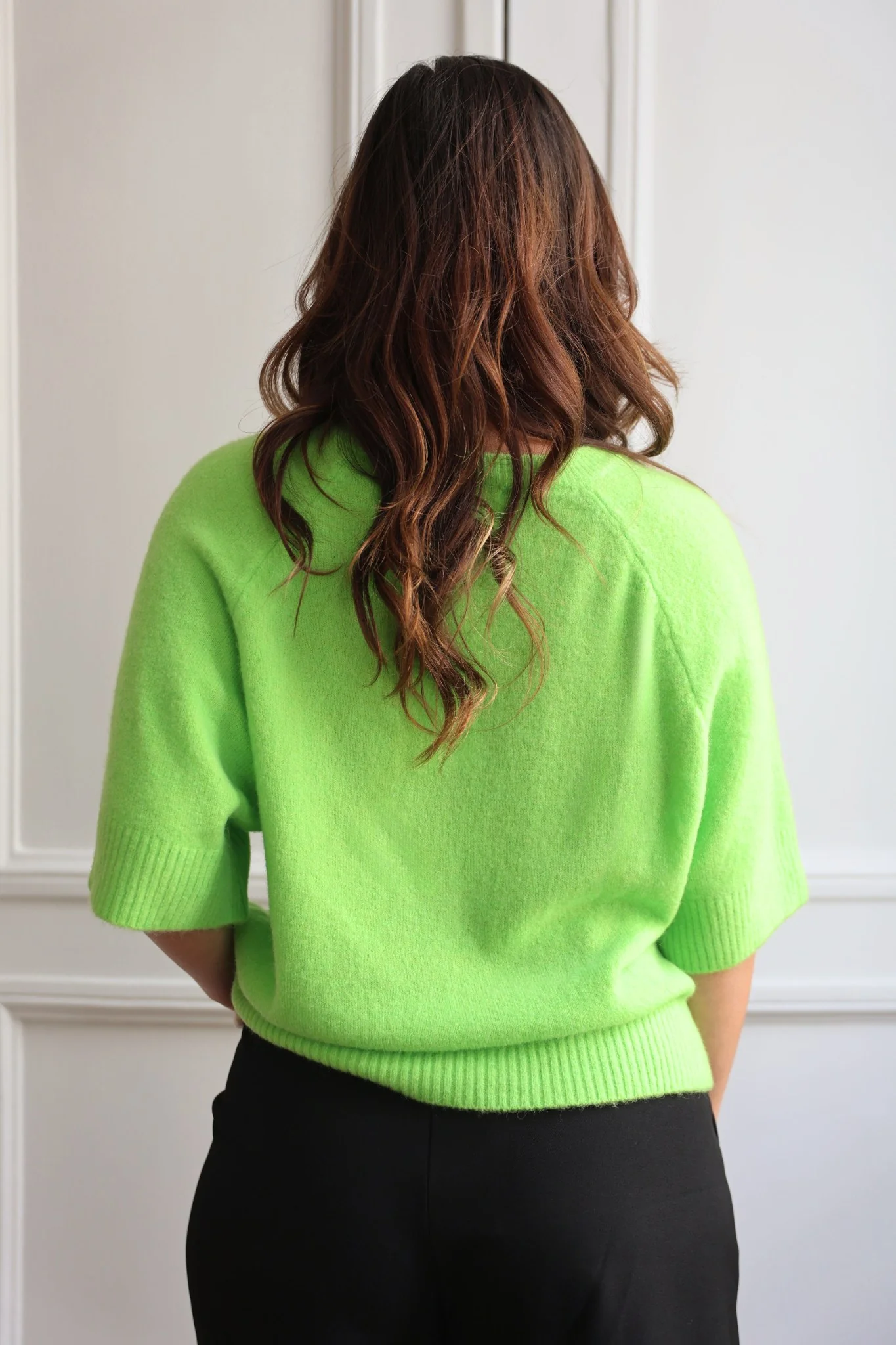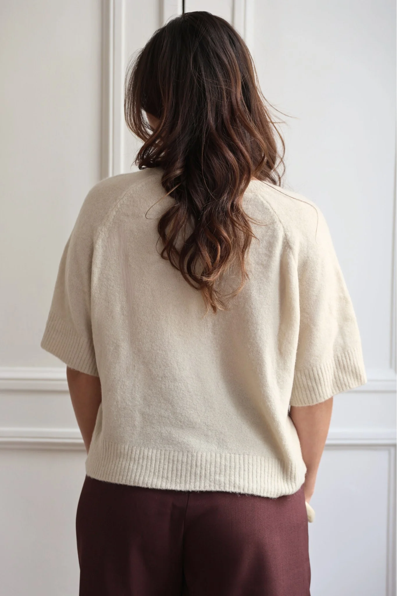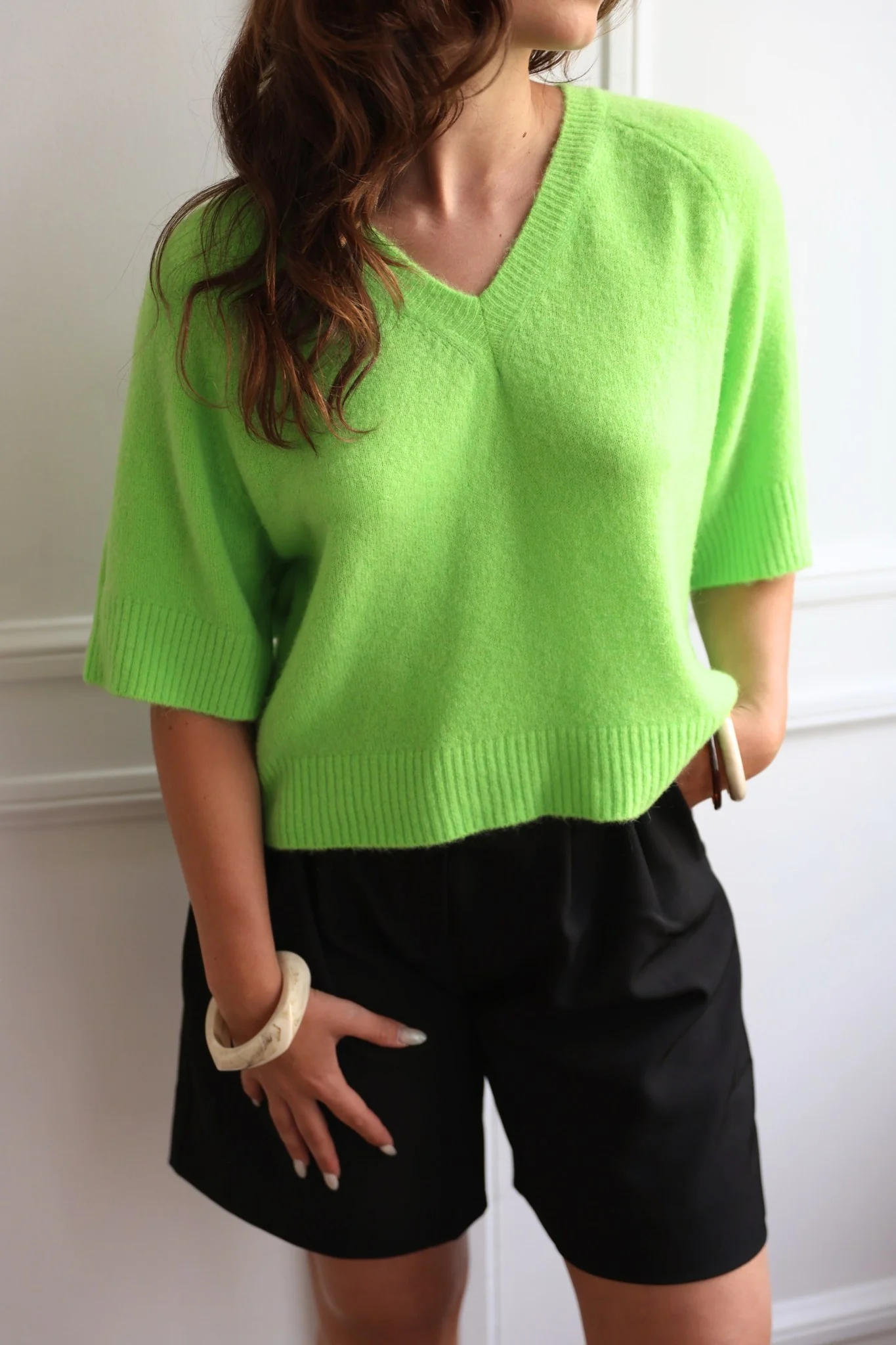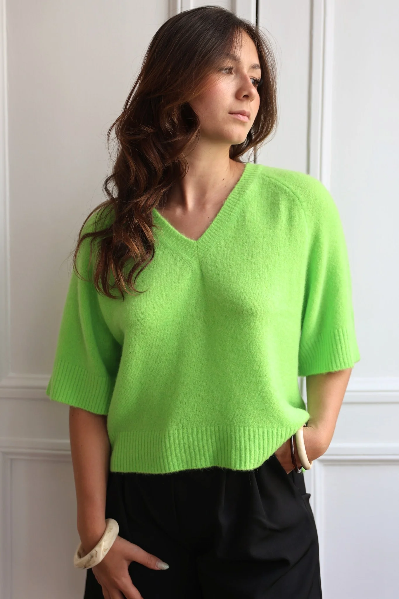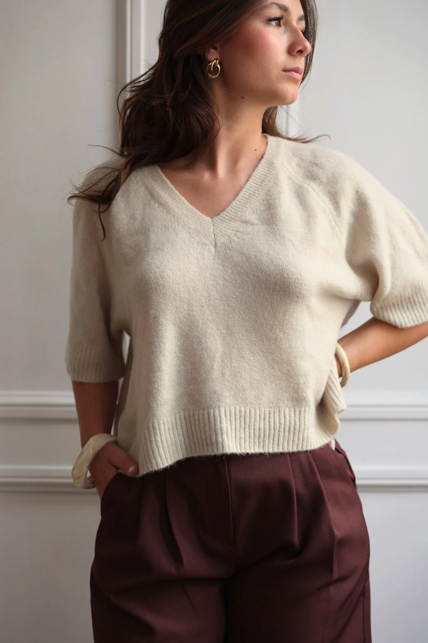 Pull en maille à manches 3/4 et col V, finitions bord-côtes. Conçu pour allier confort et style, ce pull est un essentiel de la garde-robe moderne.
