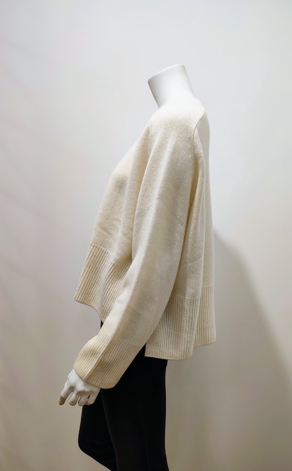Pull court – oversize – plus long derrière – fendu sur les côté – col rond – manches raglantes – manches à la coupe droite un peu large – grands bords côtes
