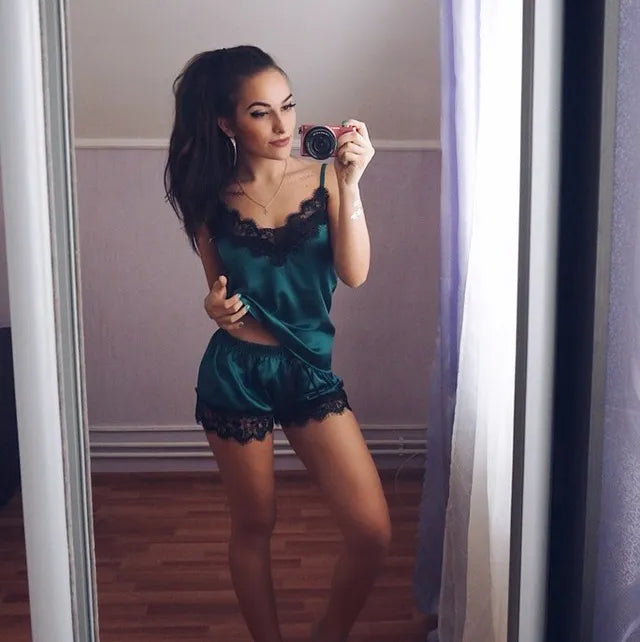 Découvrez notre pyjama femme sexy en satin qui contient un Top sexy et un short, parfait pour des nuits de rêve.