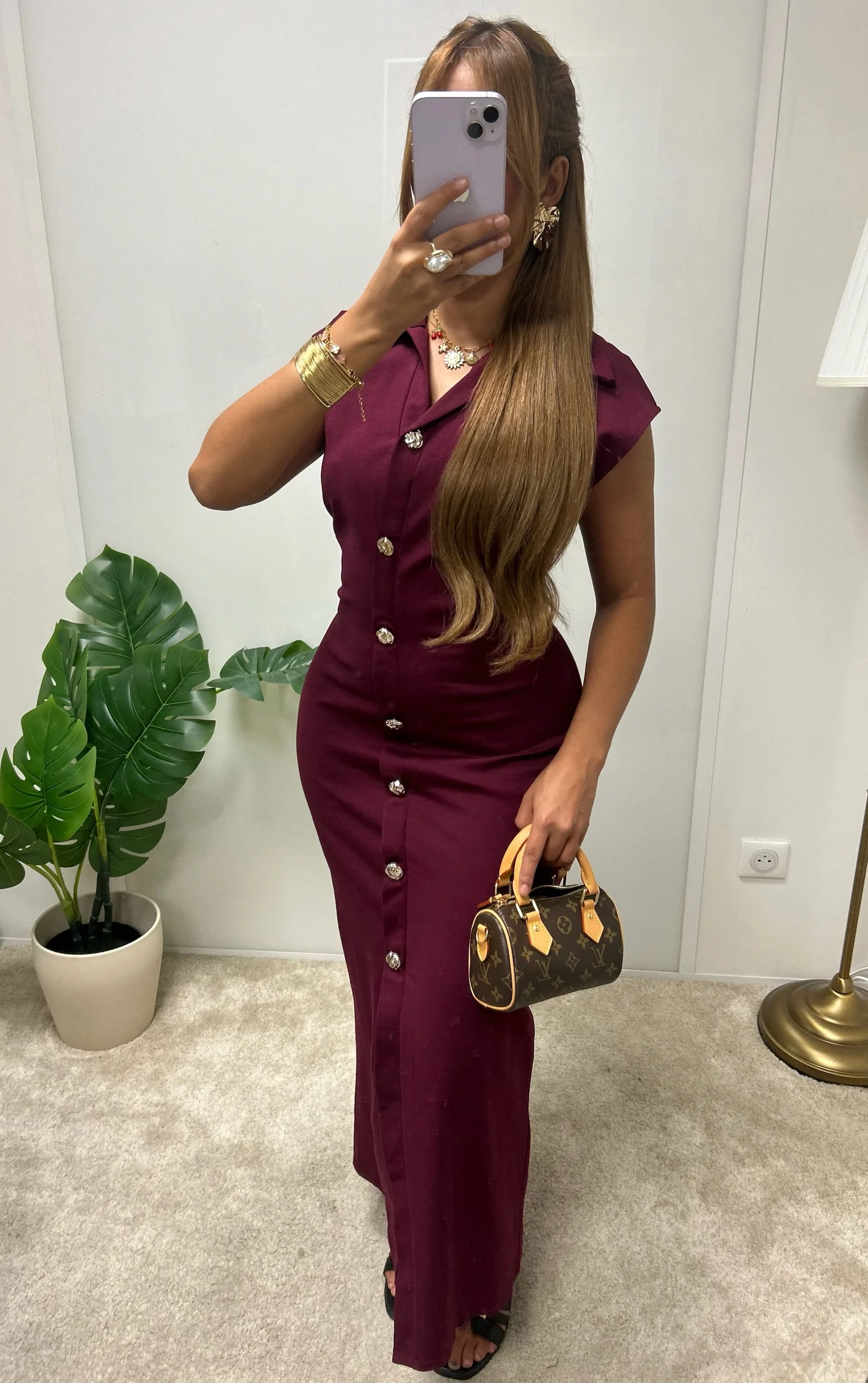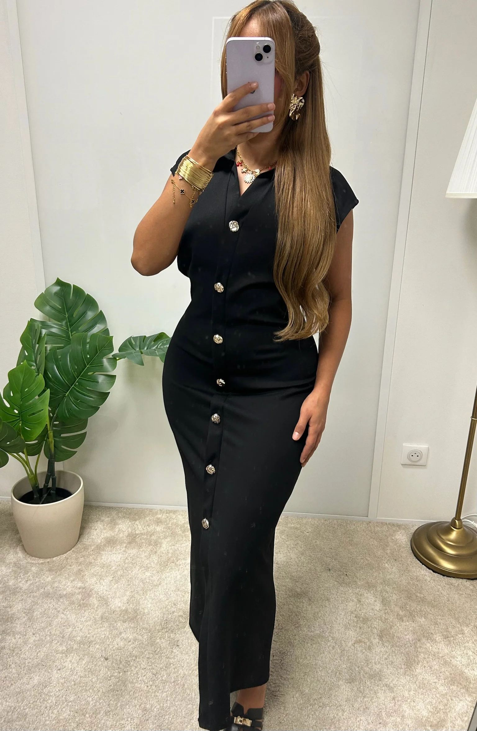 – Coupe : Robe longue ajustée, dessinant parfaitement la silhouette avec une allure élégante et féminine