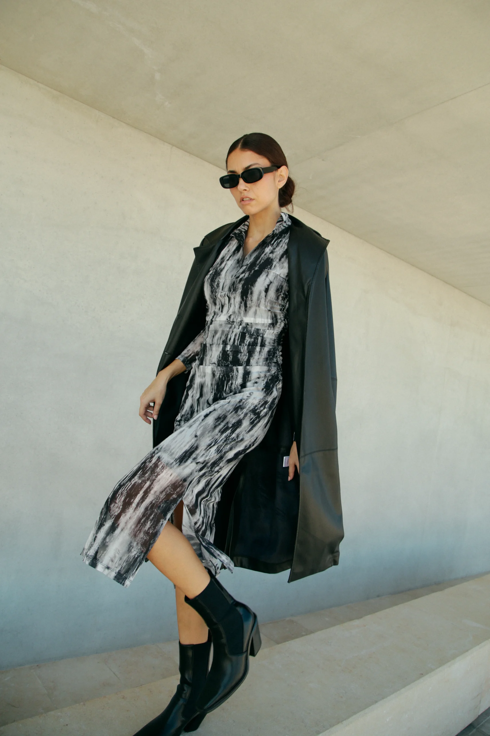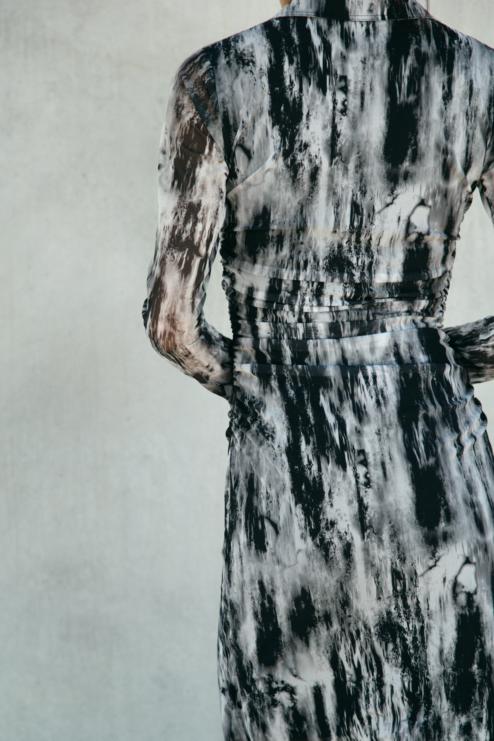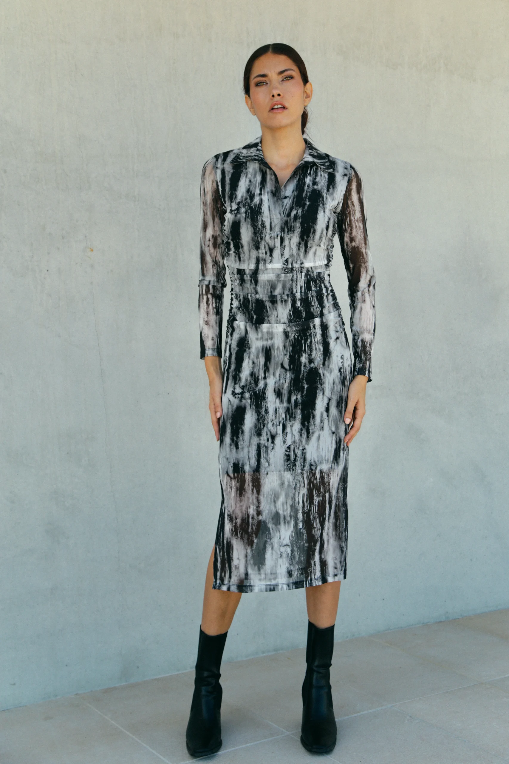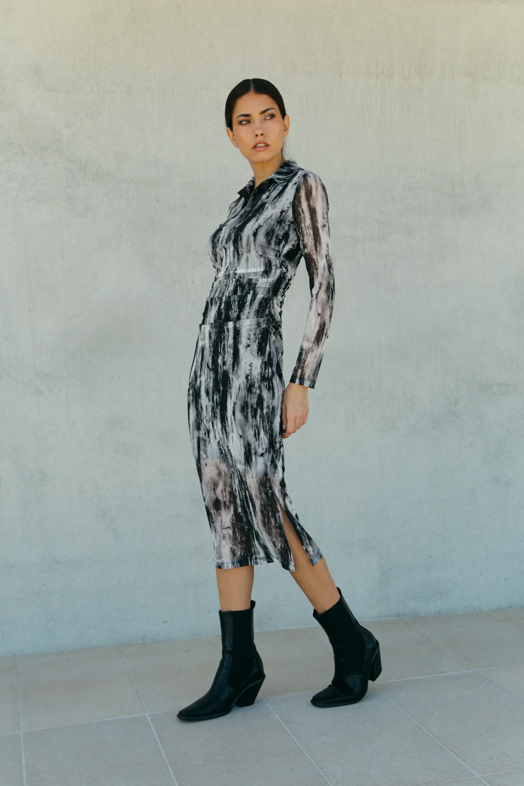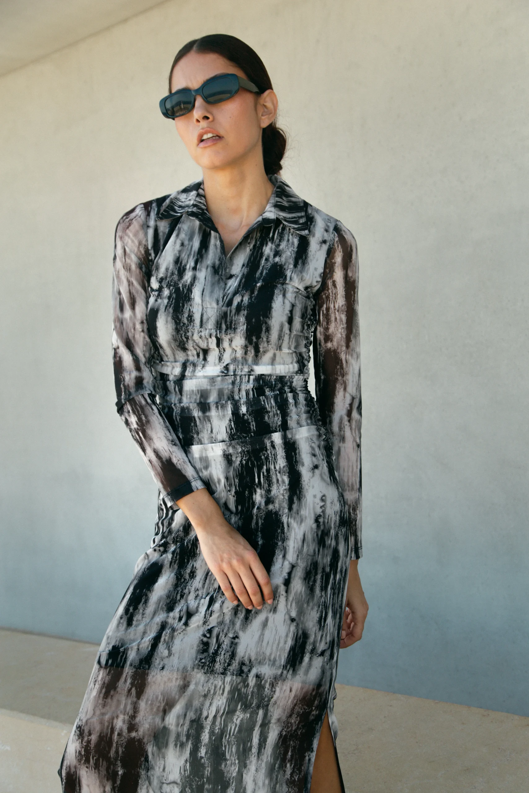 La robe Eclipse invite à l’évasion et au rêve. Confectionnée dans une matière stretch et confortable, elle arbore un imprimé B&M qui habille la silhouette de douceur et de caractère.