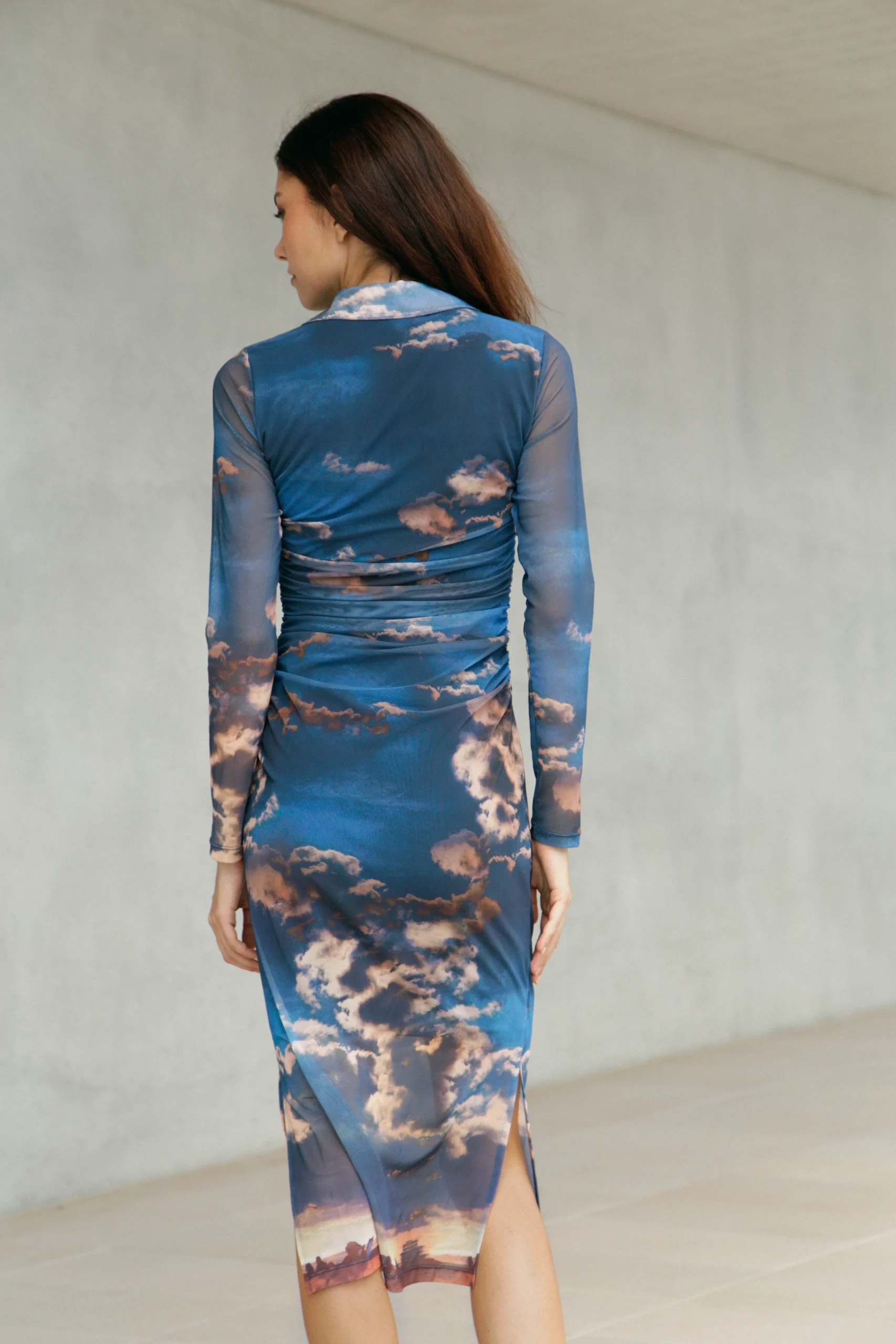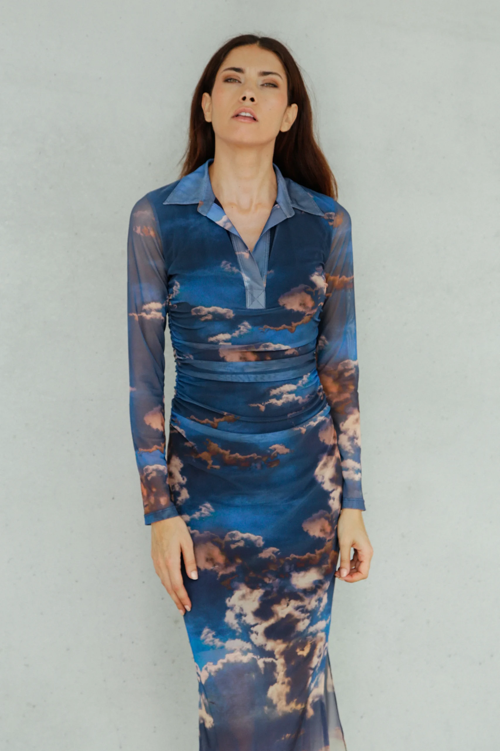La robe Eclipse invite à l’évasion et au rêve. Confectionnée dans une matière stretch et confortable, elle arbore un imprimé nuages poétique qui habille la silhouette de douceur et de caractère.