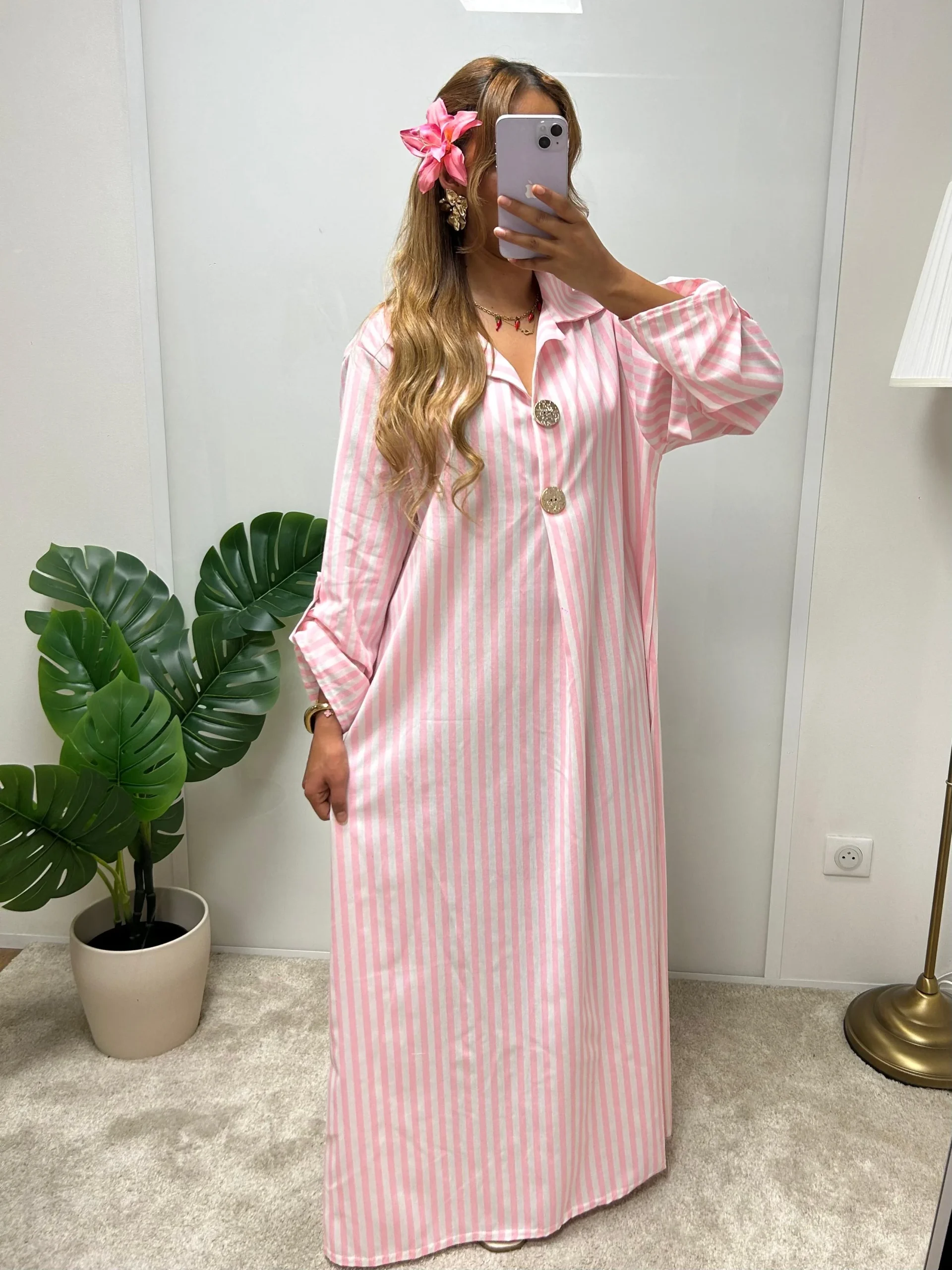 Robe ample rayéeCoupe longue et droite, manches longues légèrement bouffantes, col chemise et gros boutons décoratifs. Look à la fois chic et décontracté.