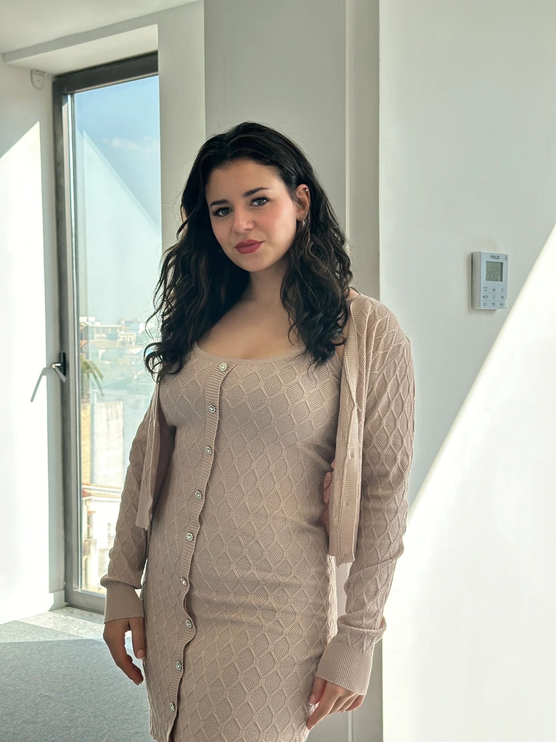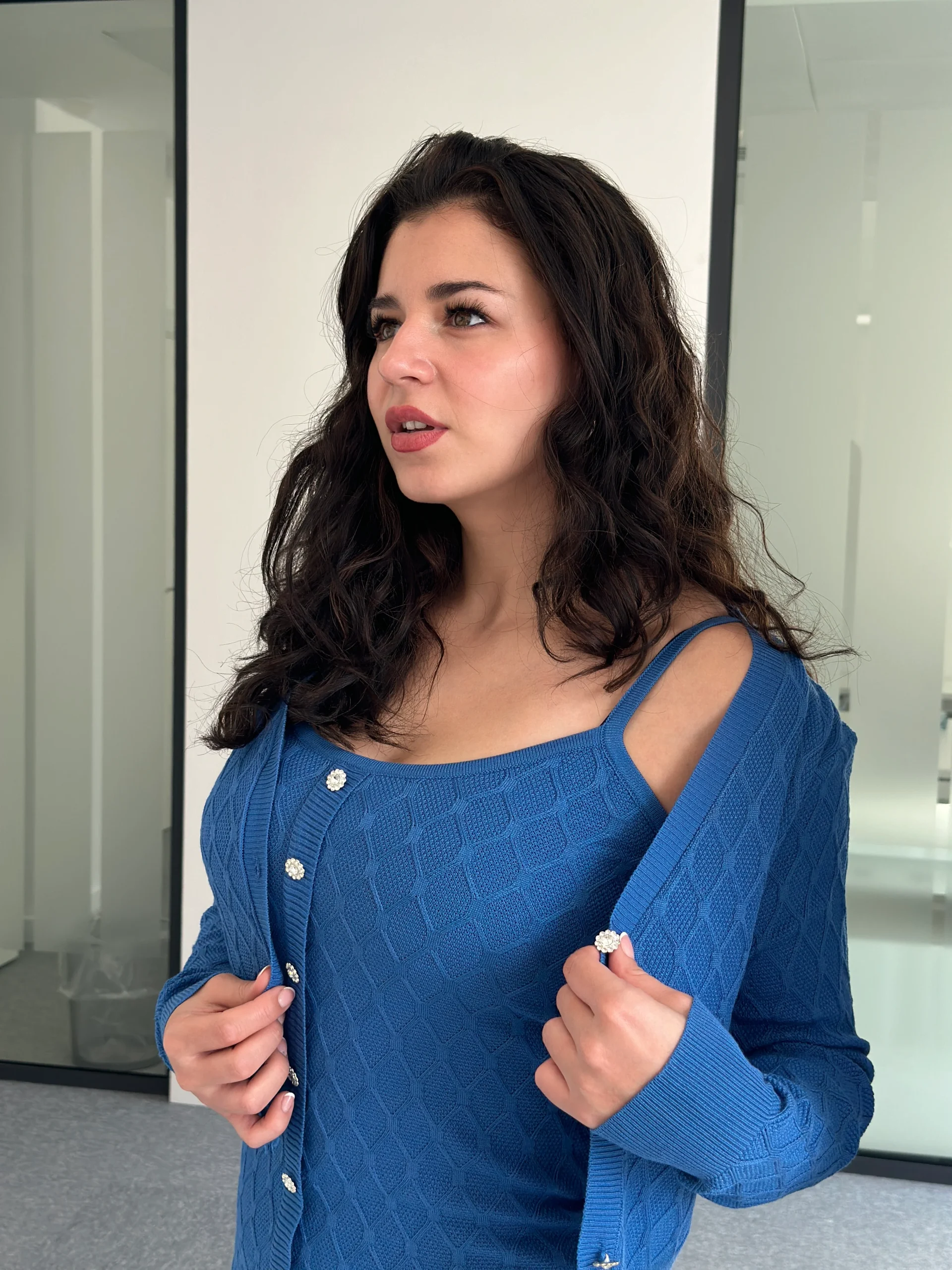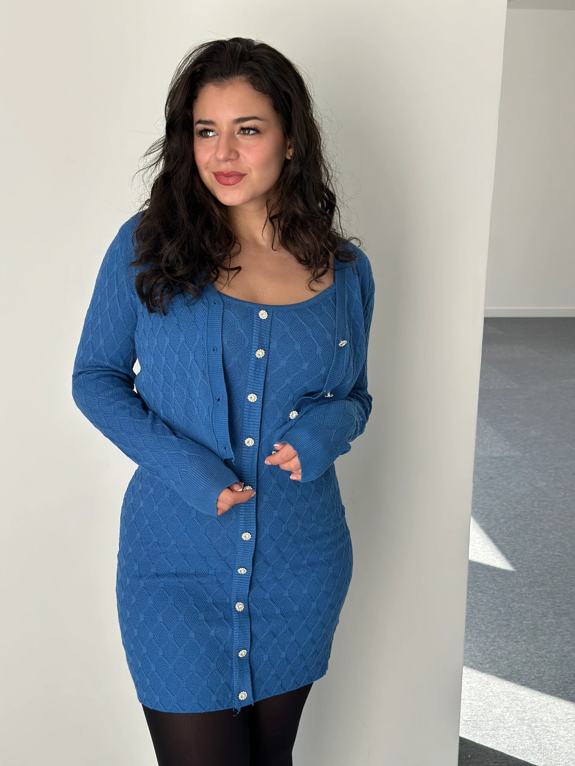 Robe sans manches accompagnée d’un gilet à manches, confectionnés dans un luxueux mélange de viscose, coton et élasthanne. Un ensemble élégant et confortable, idéal pour allier style et aisance.