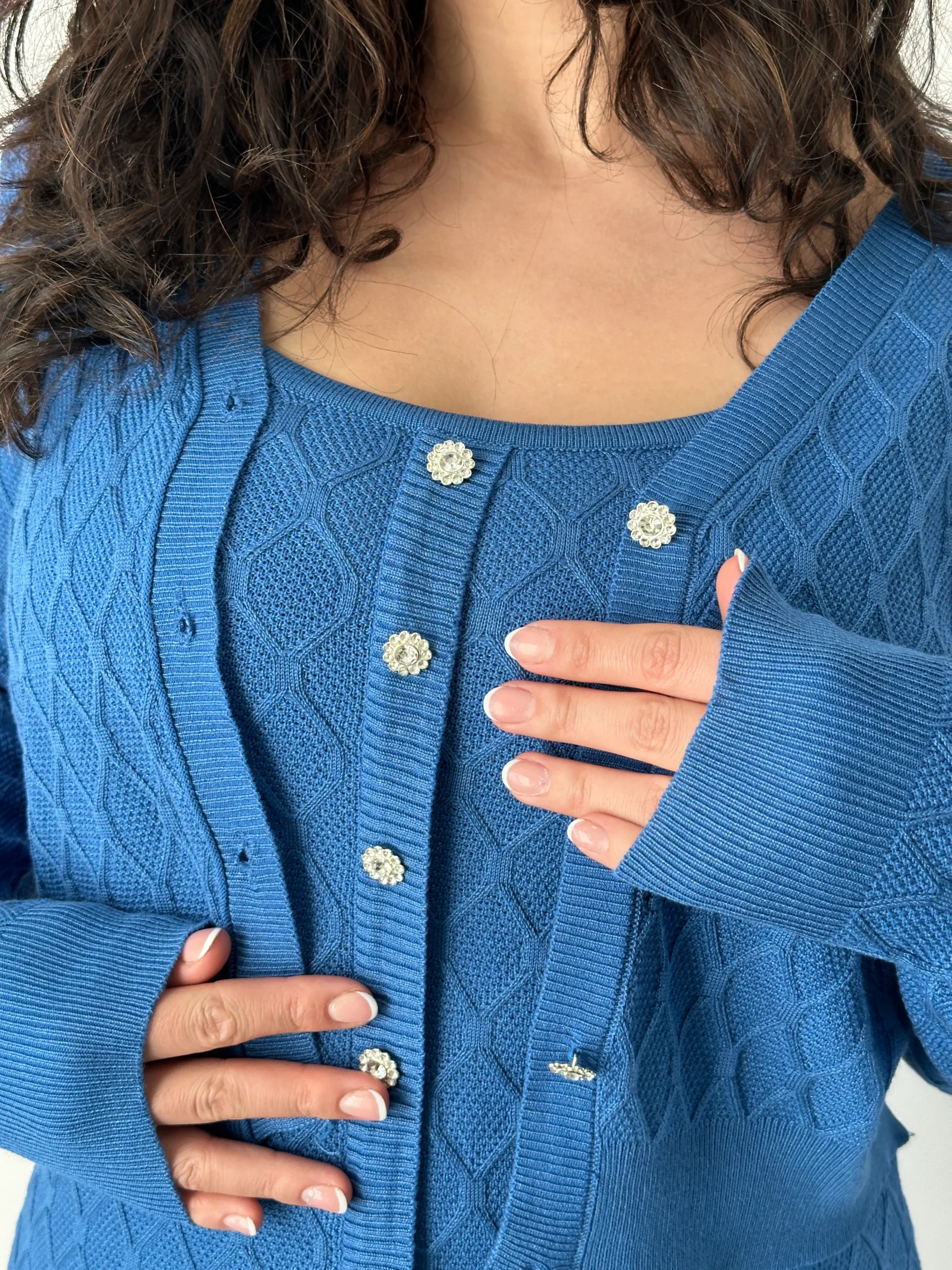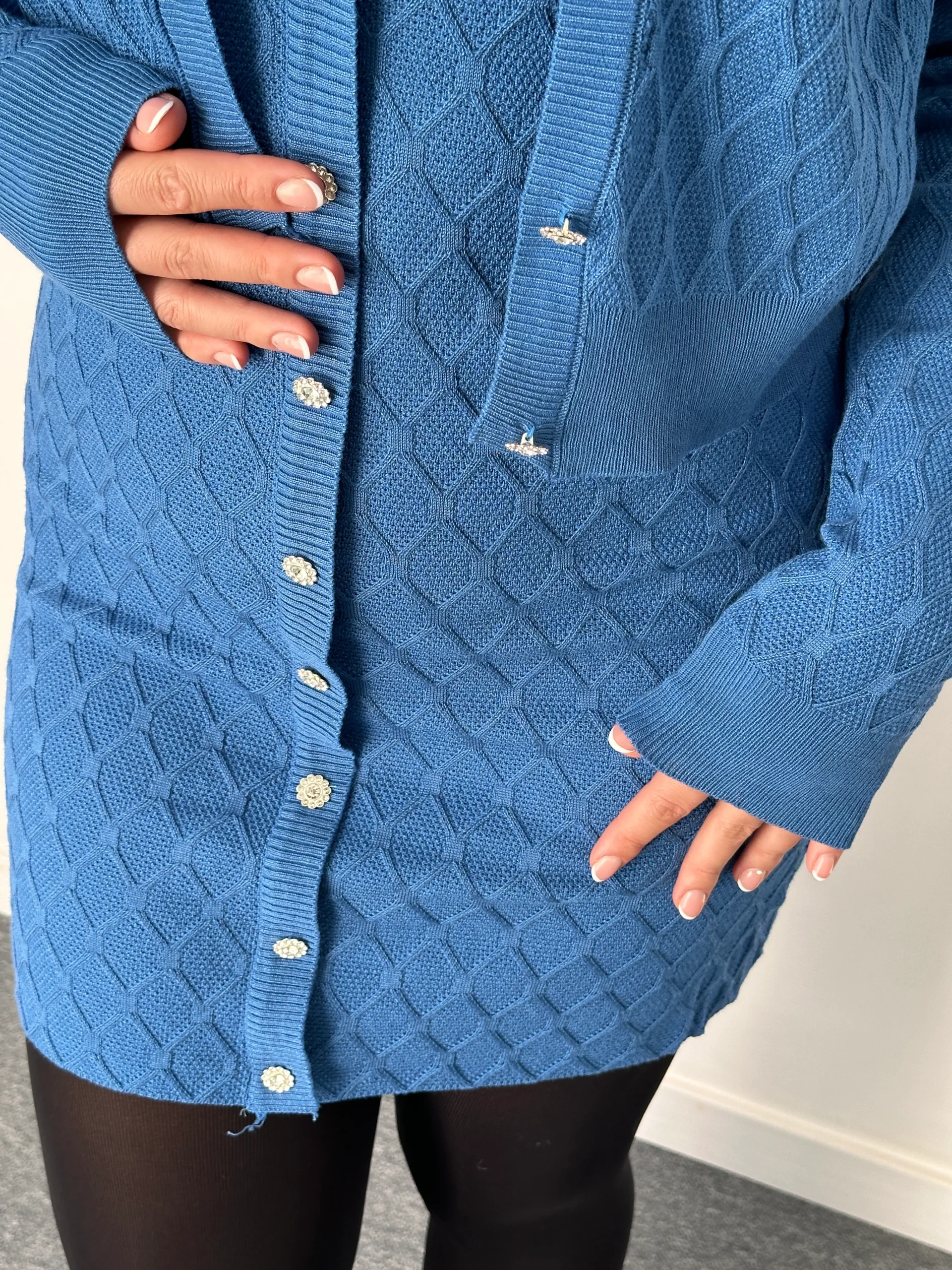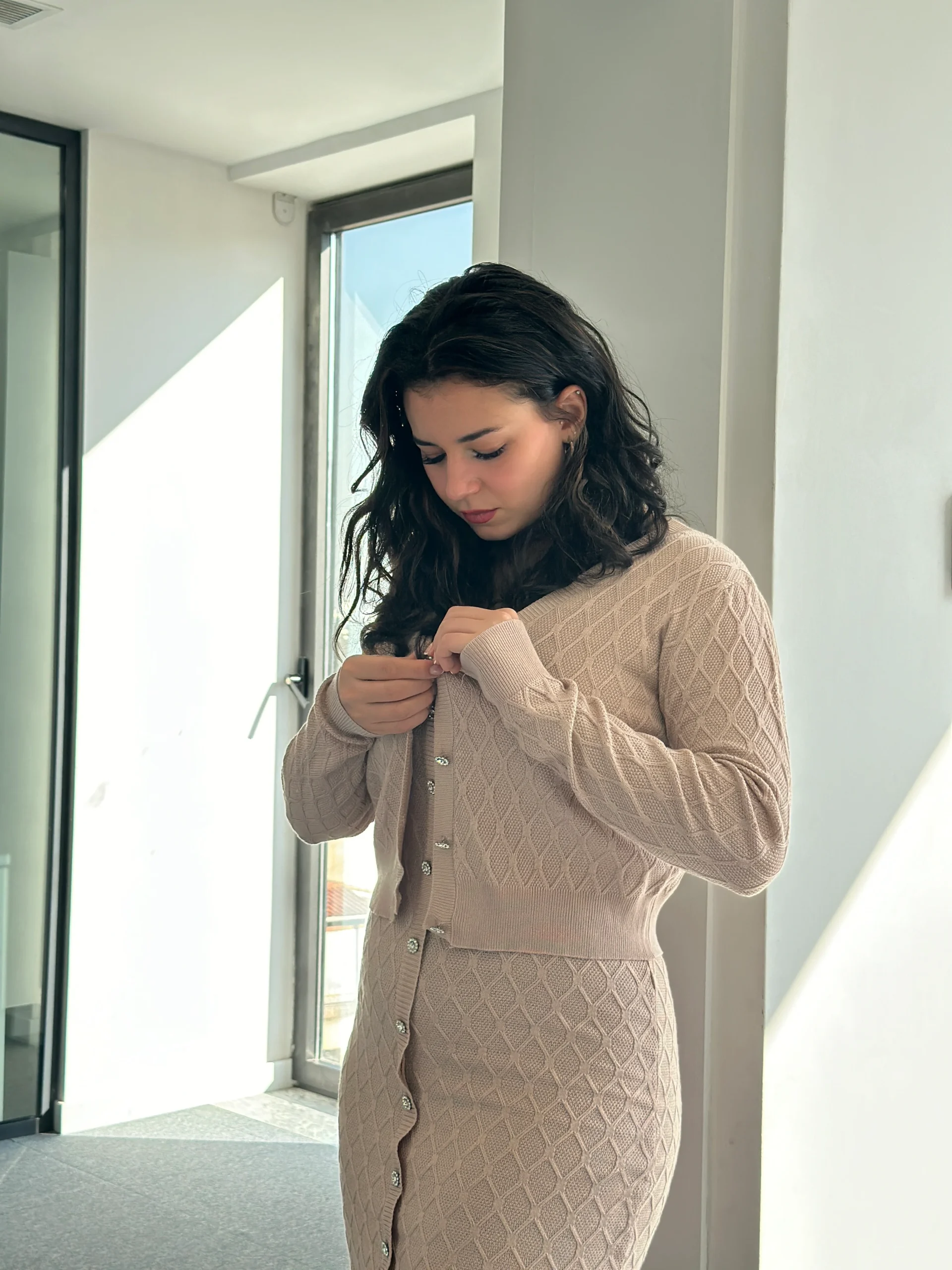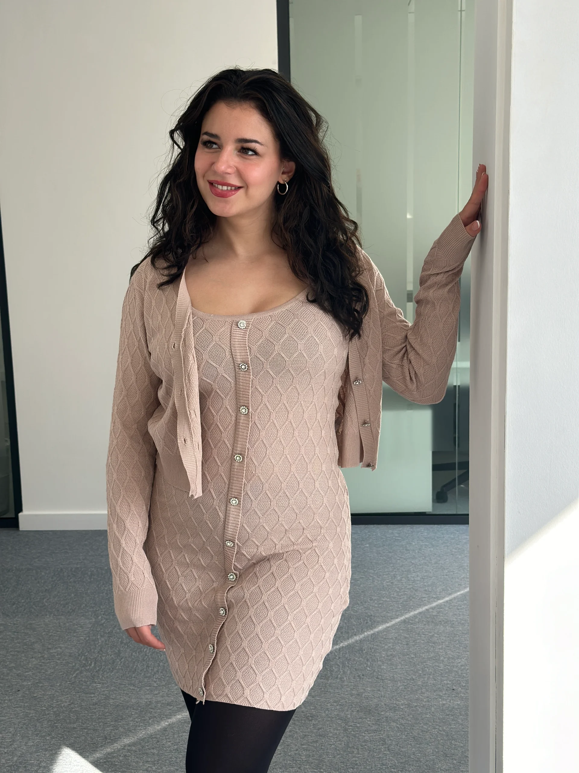 Robe sans manches accompagnée d’un gilet à manches, confectionnés dans un luxueux mélange de viscose, coton et élasthanne. Un ensemble élégant et confortable, idéal pour allier style et aisance.
