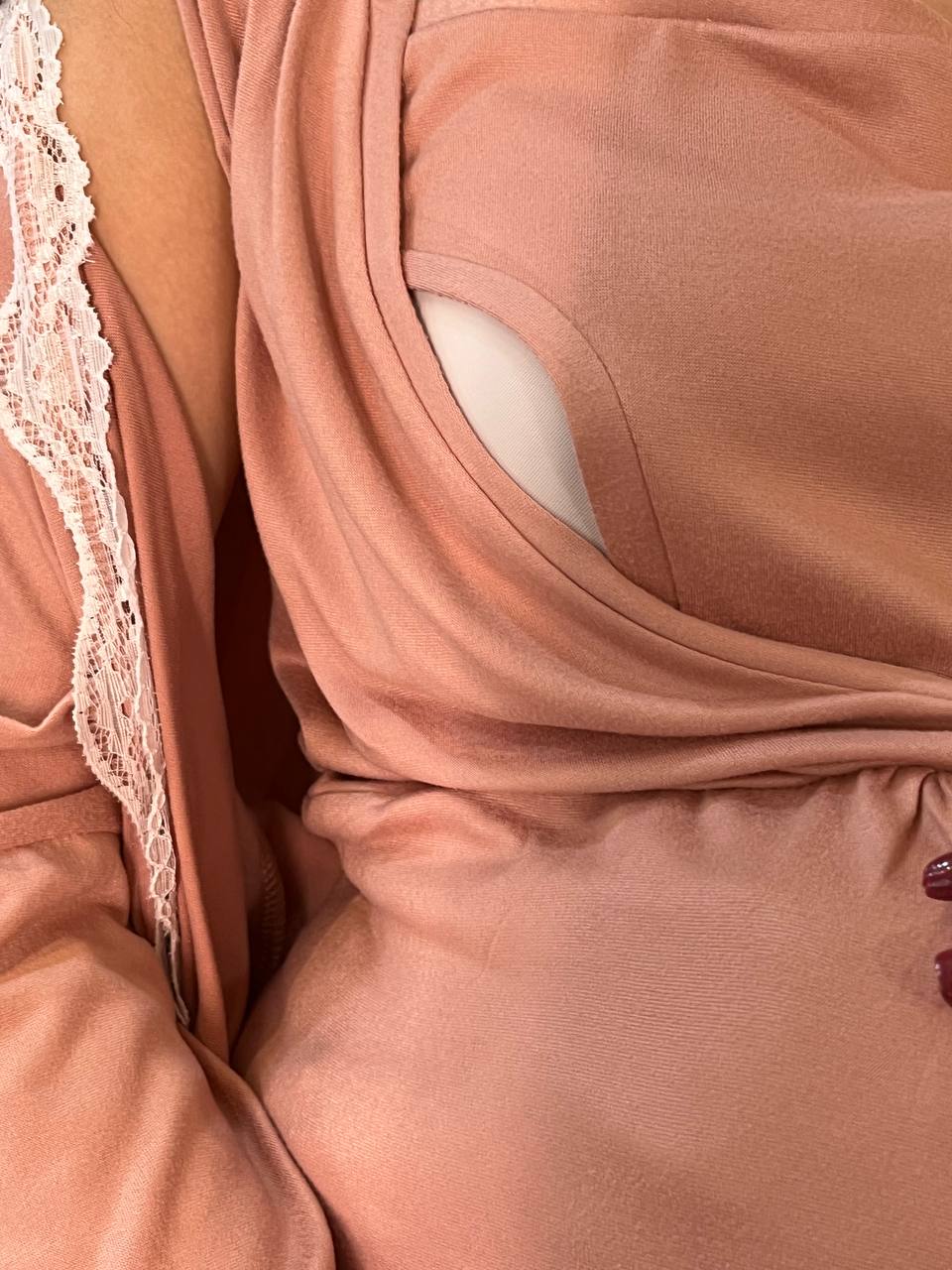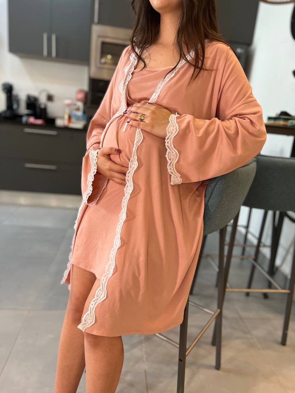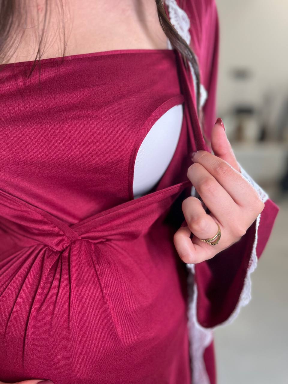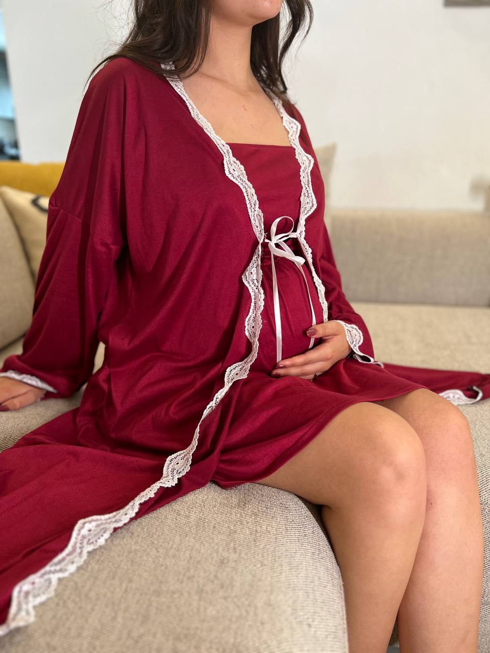 Ensemble kimono longueur genou et robe longueur juste au dessus du genou avec le haut en cache cœur et un empiècement qui facilite l’allaitement, en coton Lycra. COULEURS : Bordeau / Rose MATÉRIAU : Coton Lycra TAILLES DISPONIBLES : T1(SM) 36-38, T2(LXL) 40-42, T3 (XXl) 44-46
