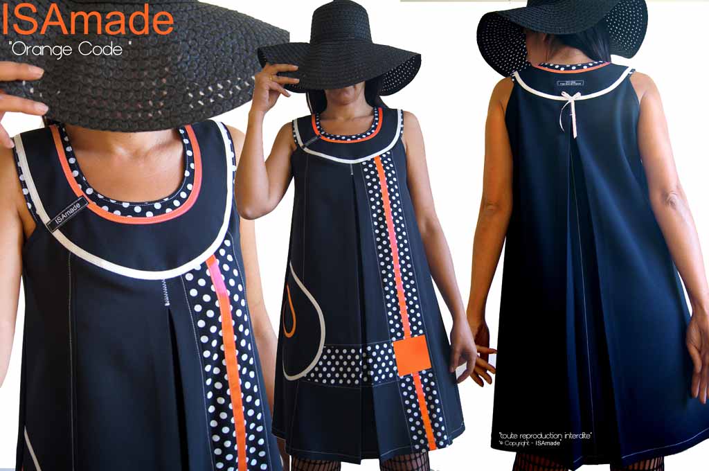 Cette Robe Mode affiche des lignes rondes par son encolure ou d’un jeu de Géométrie stylistique où se mêlent harmonieusement un jeu d’imprimés Pois et un carré Orange très Couture.