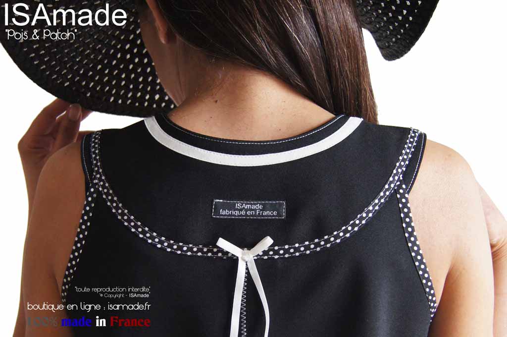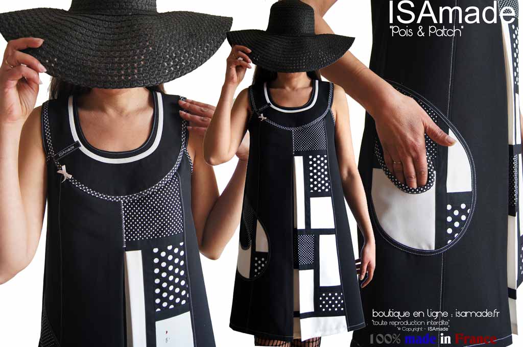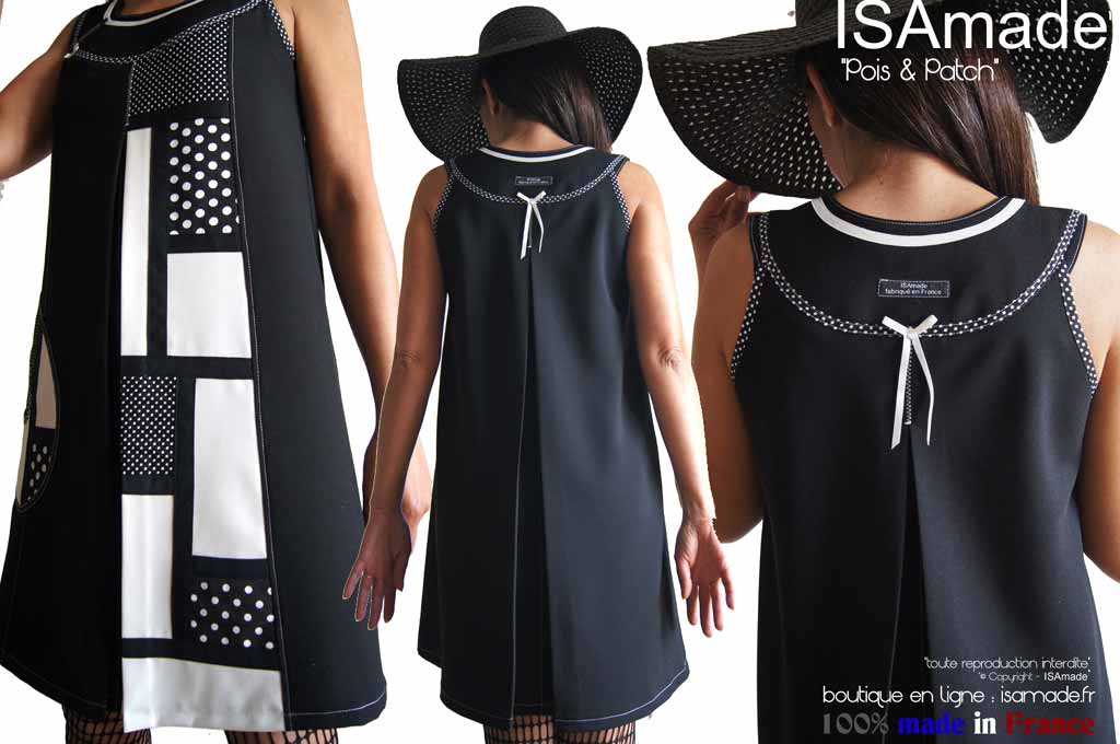 Robe trapèze patchwork pois Couture noire blanc cassé créateur fabriquée en France à l’allure Sixties & Patchwork à Pois