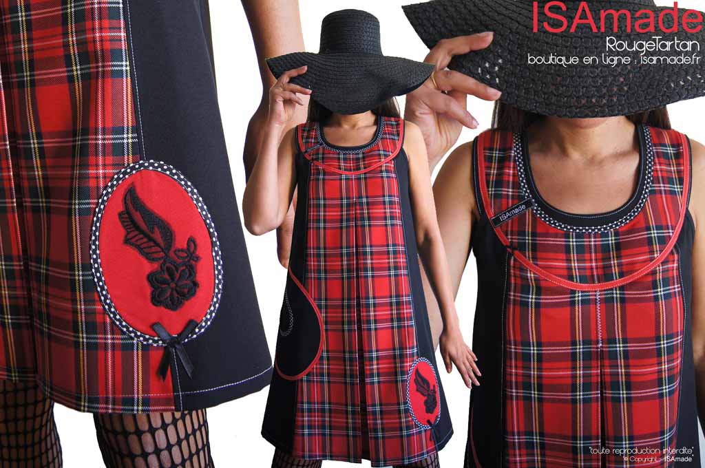 Robe trapèze rouge noire tartan carreaux écossais dentelle pois de fabrication Française à la coupe 60’s « Rouge Tartan »