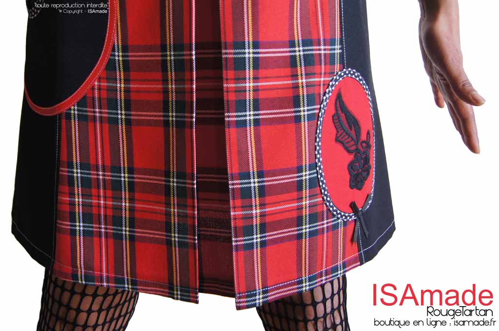 Cette Robe trapèze rouge noire tartan carreaux écossais dentelle pois vous charmera pour son originalité et ses finitions « couture ».