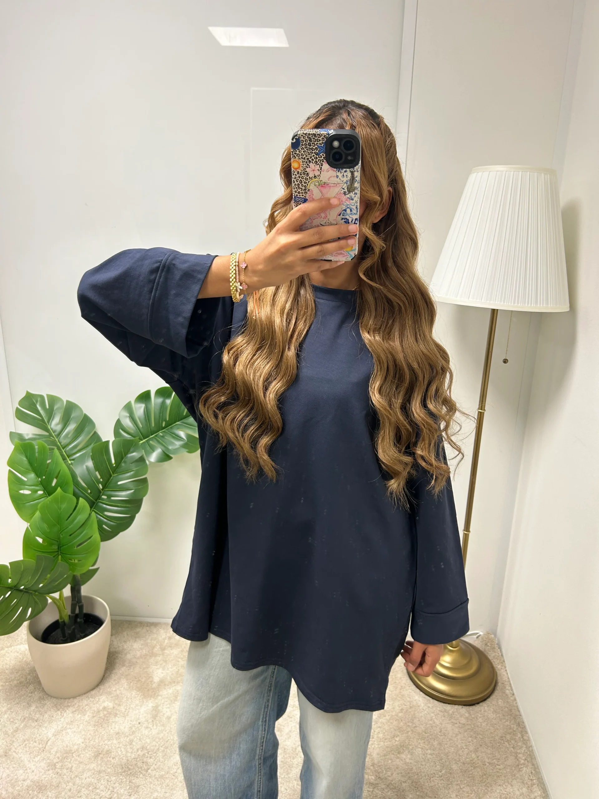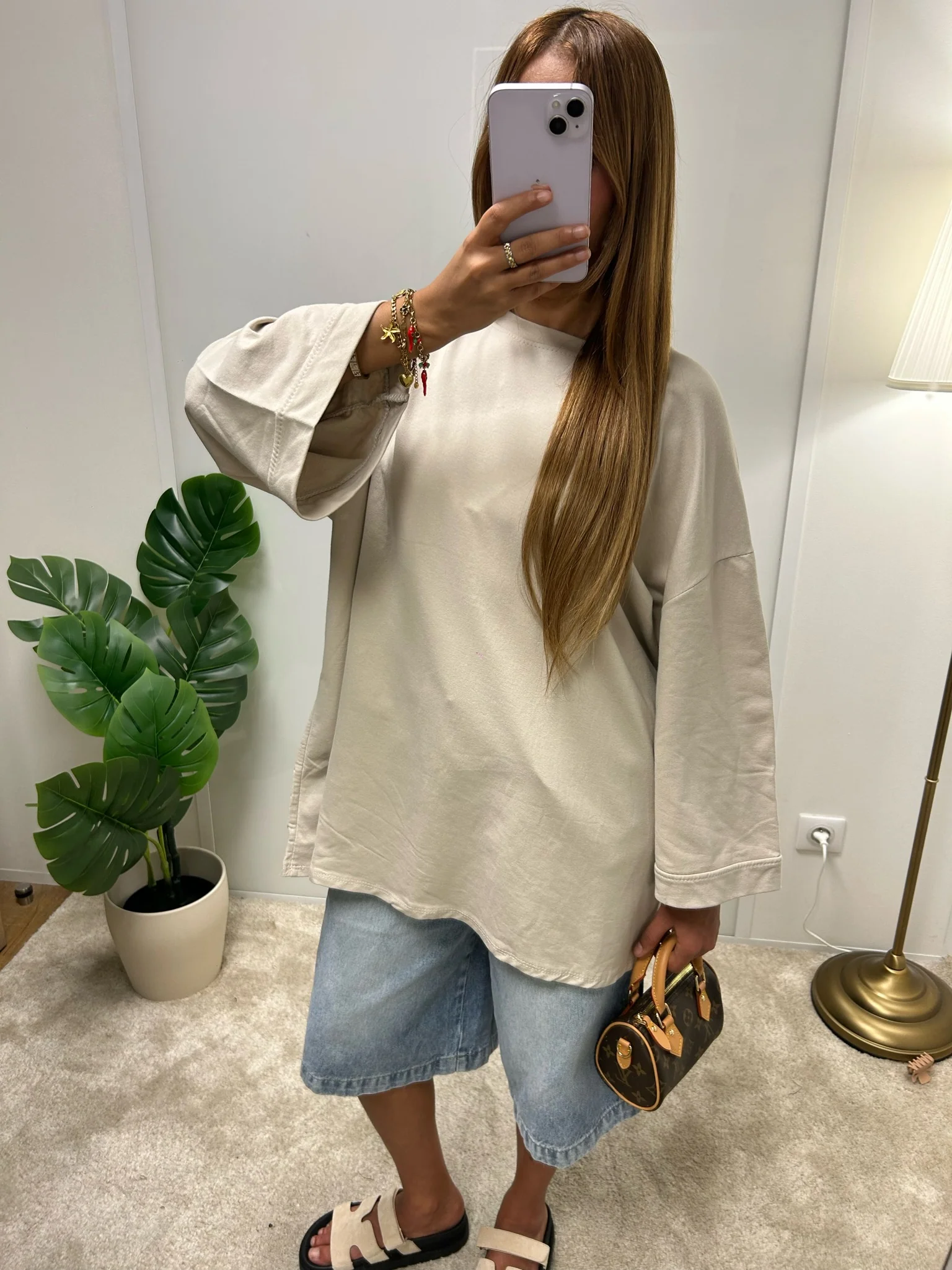 • T-shirt oversize à la coupe fluide et confortable • Matière douce et légère, agréable à porter au quotidien • Manches longues légèrement évasées pour un effet décontracté • Encolure ronde classique et proprement finie • Tombé droit qui épouse sans mouler la silhouette • Longueur parfaite pour être porté rentré ou lâché selon le […]